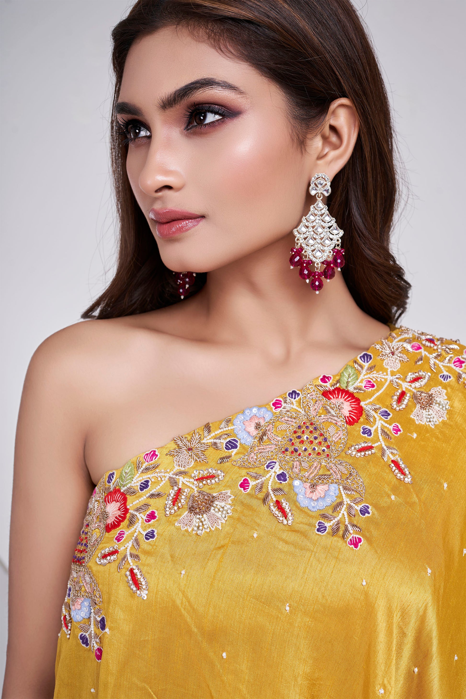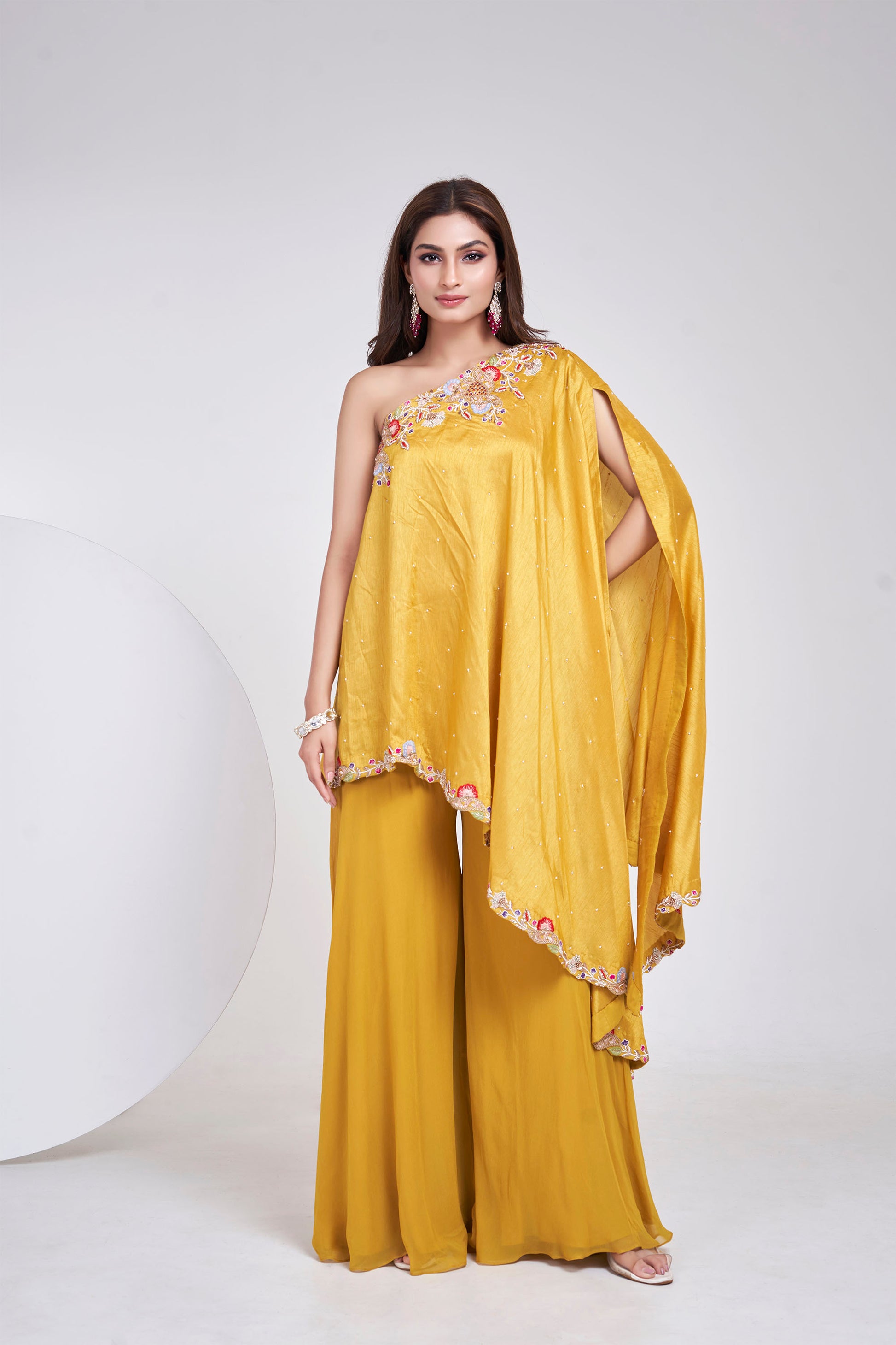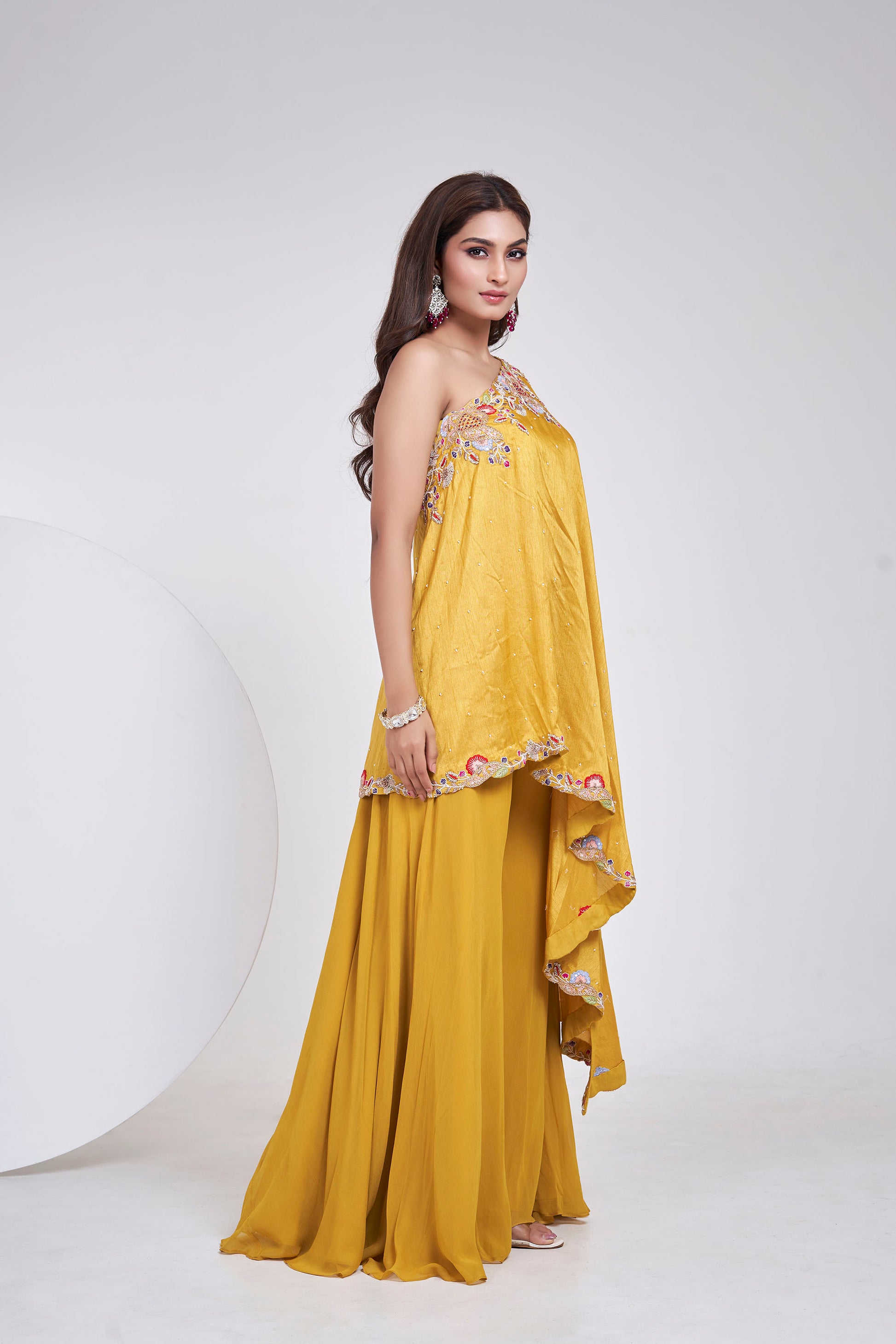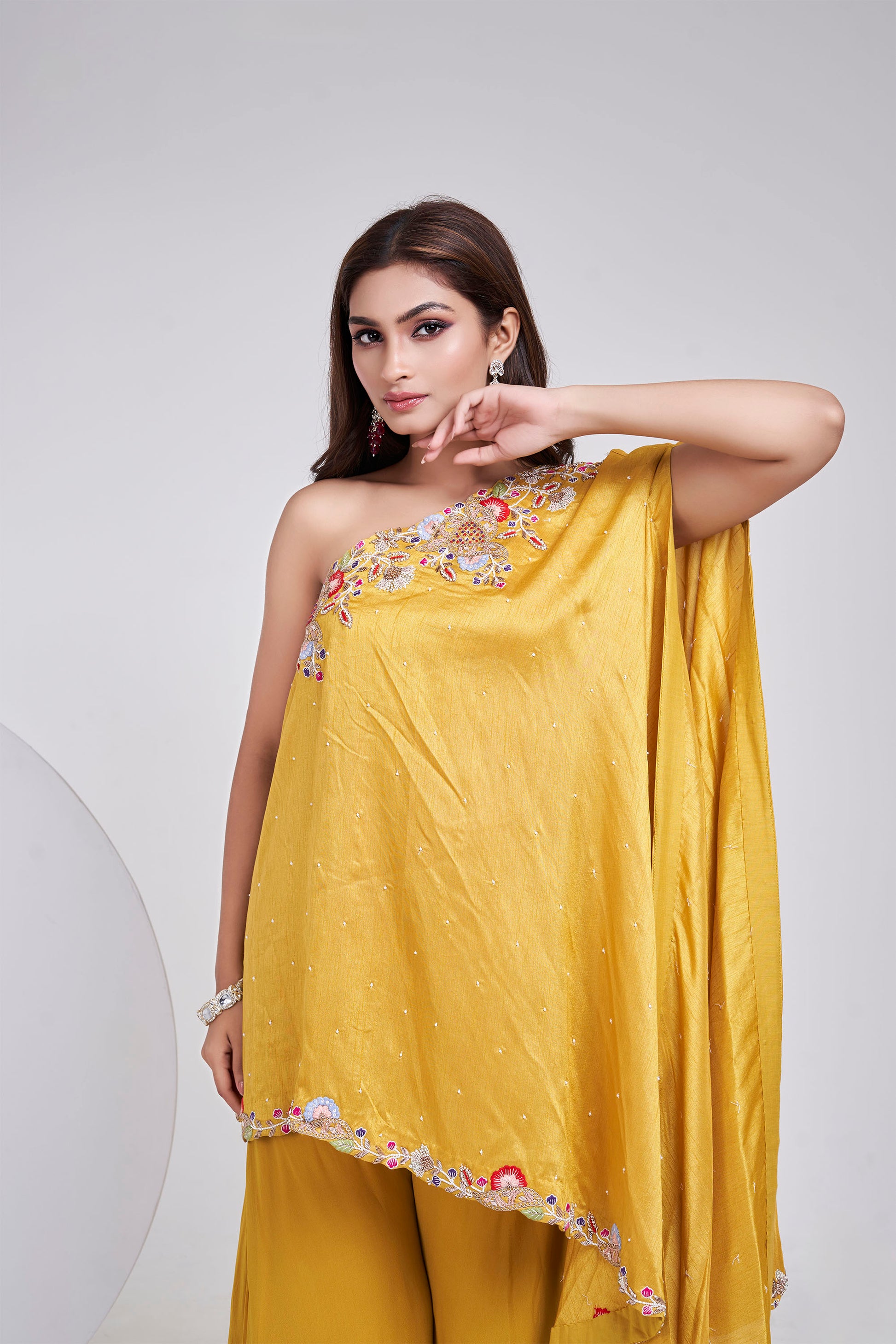 A fluid one-shoulder in a striking forest green, delicately hand-embroidered with florals and soft vines along the neckline and hem. The asymmetrical drape glides over tailored Sharara, creating a silhouette that’s equal parts regal and ethereal. Lightly scattered sequins add a hint of sparkle — perfect for cocktail soirées or intimate festive affairs.