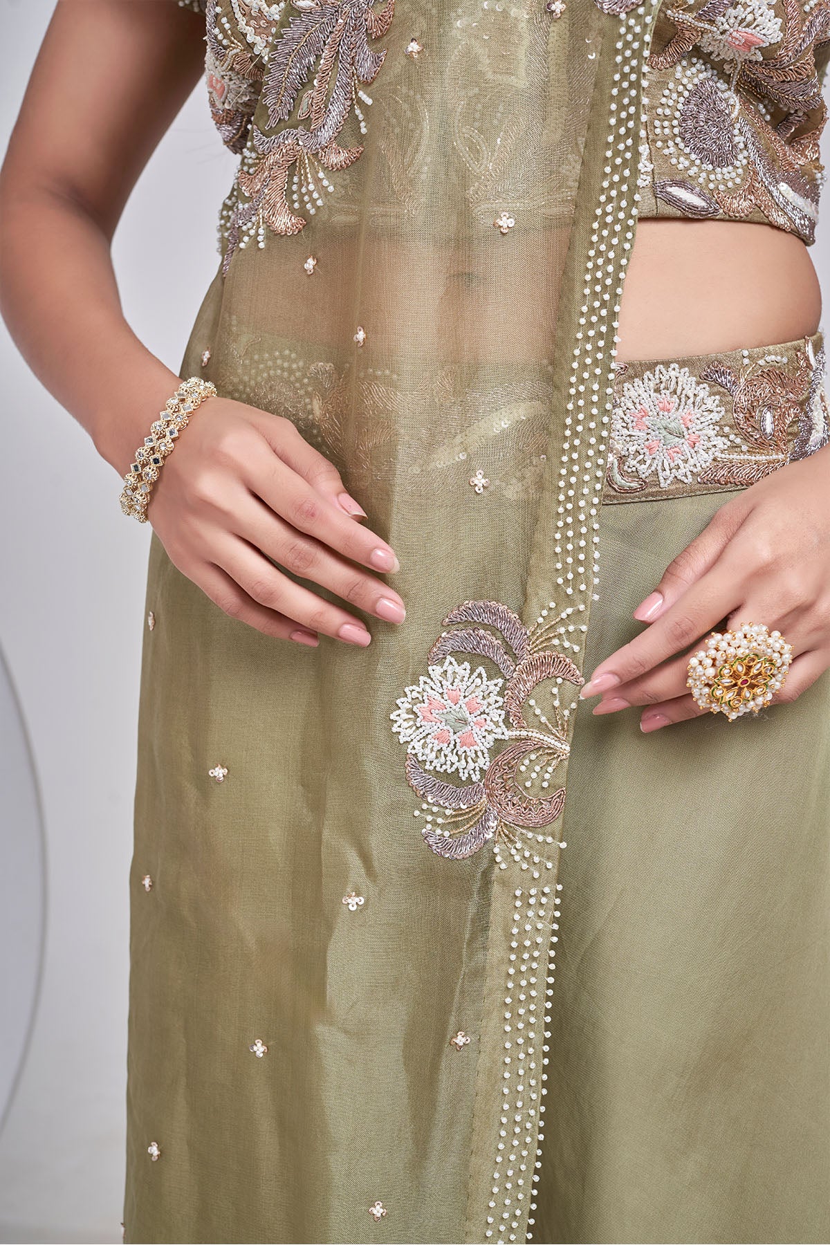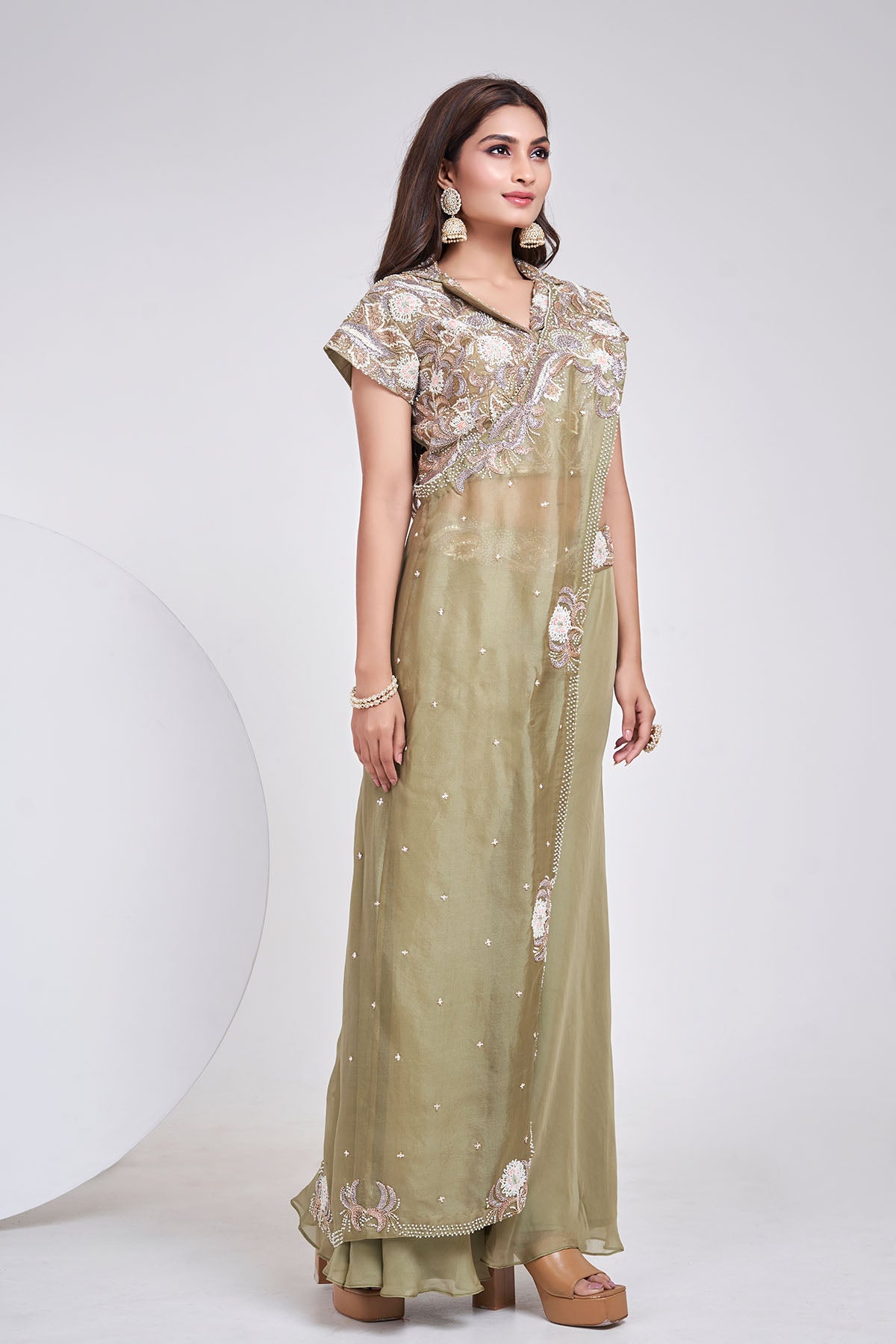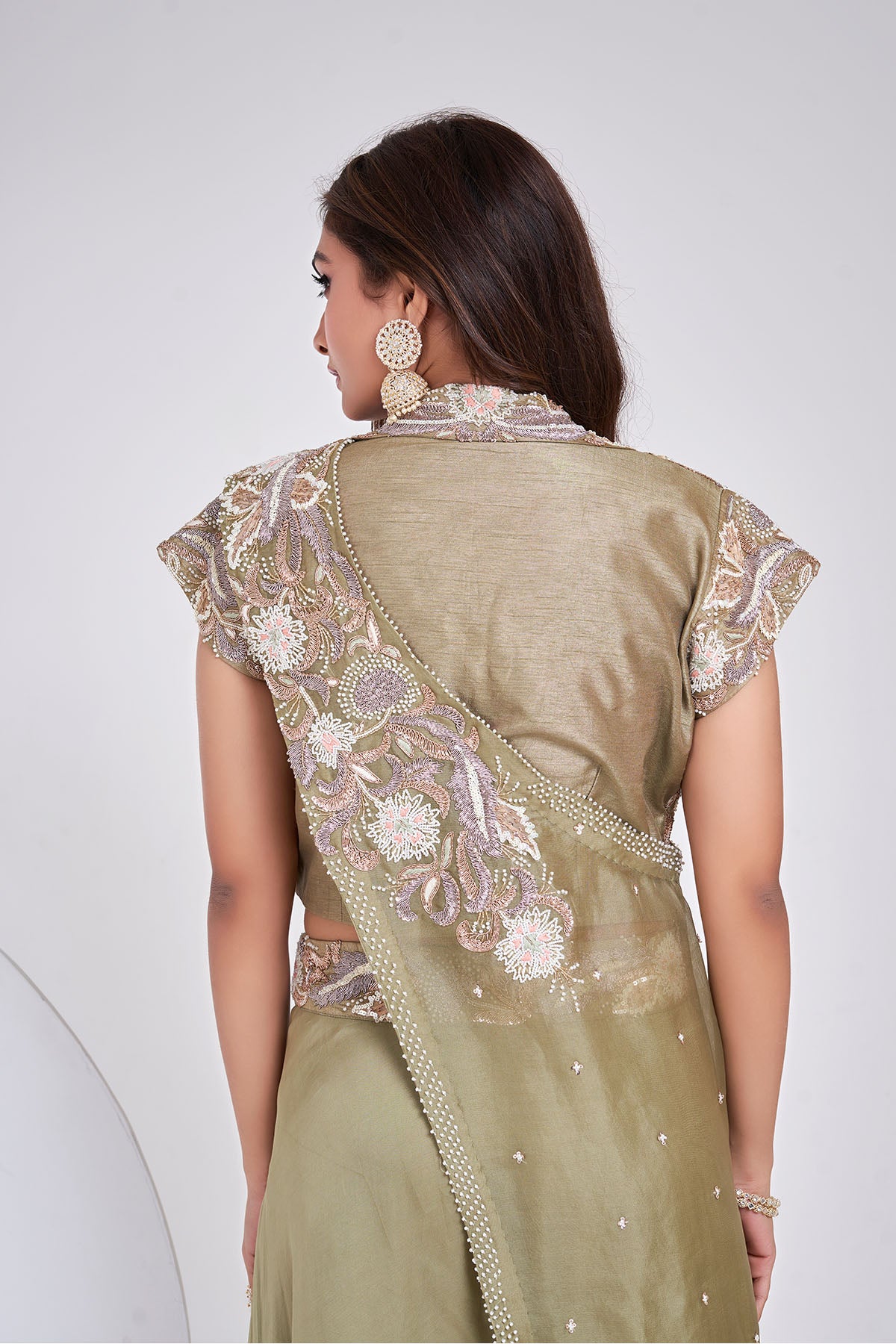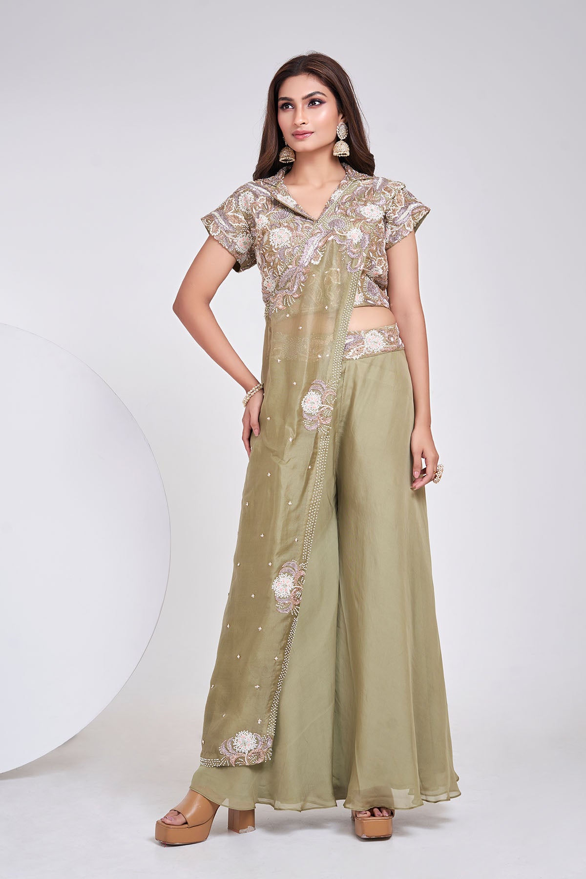 Step into effortless elegance with our Aria set , a signature Ojasvini ensemble featuring our iconic drape sharara set featuring a hand-embroidered blouse with a wrap-style drape and collared neckline. Paired with sharara and intricate floral detailing, this look blends structure with softness — perfect for intimate occasions that call for subtle glam.