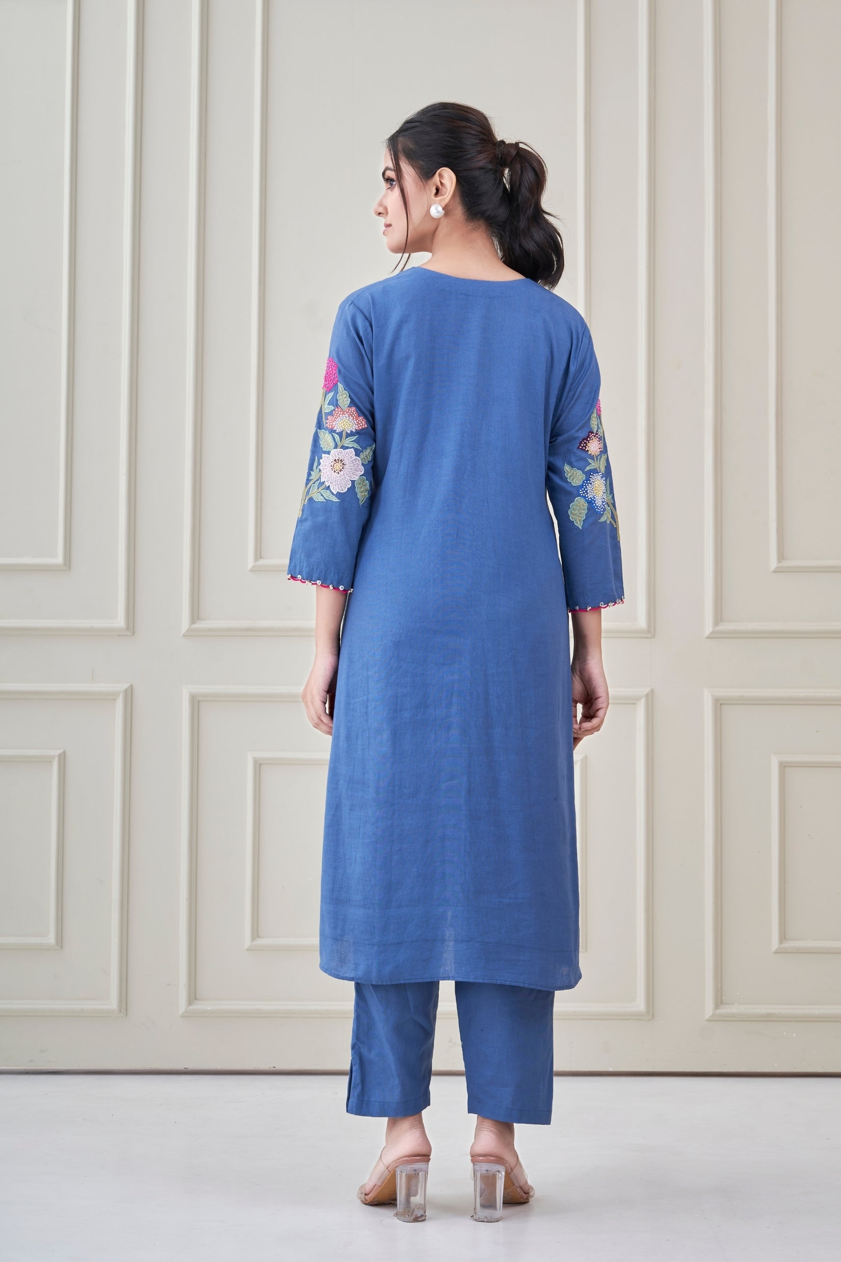 A dreamy blue coord set adorned with delicate hand-embroidered floral motifs on the kurta and trousers detailed with pearls. A graceful blend of craft and colour — perfect for festive mornings and refined daywear.