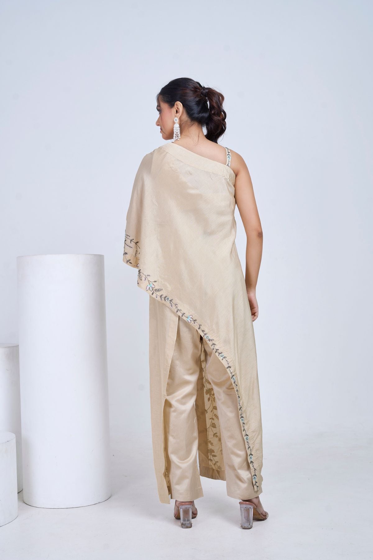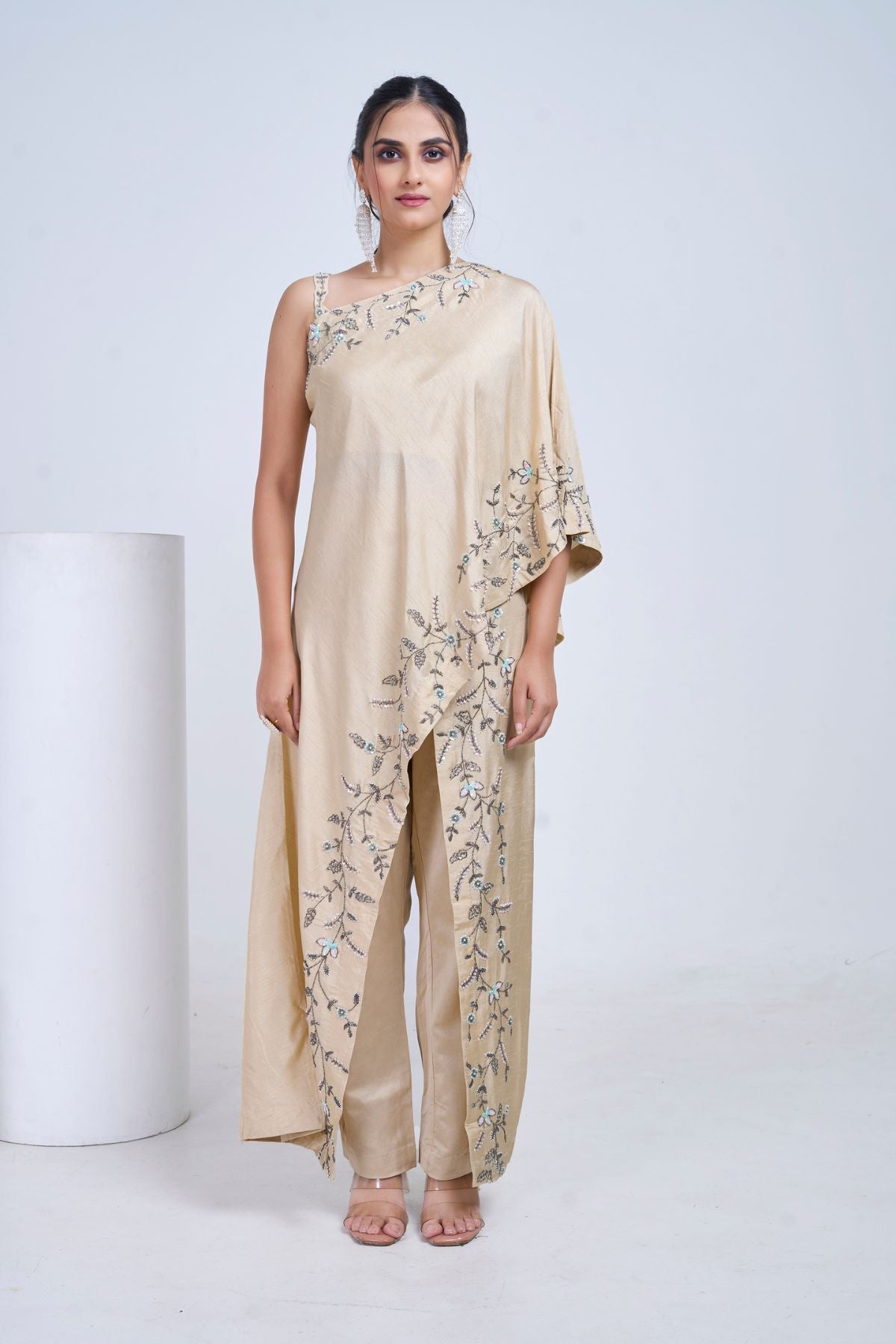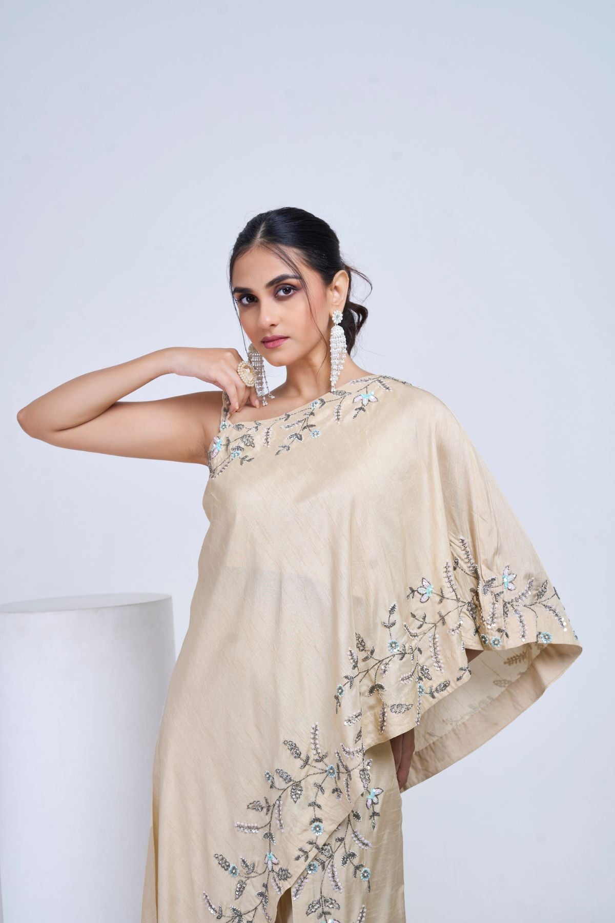 A graceful assymetrical one-shoulder top set in a soft ivory hue, featuring a delicate botanical threadwork with pearl and sequin highlights. The fluid silhouette is complemented by layered straight pants, creating a refined look ideal for pre-wedding brunches or intimate festive gatherings.
