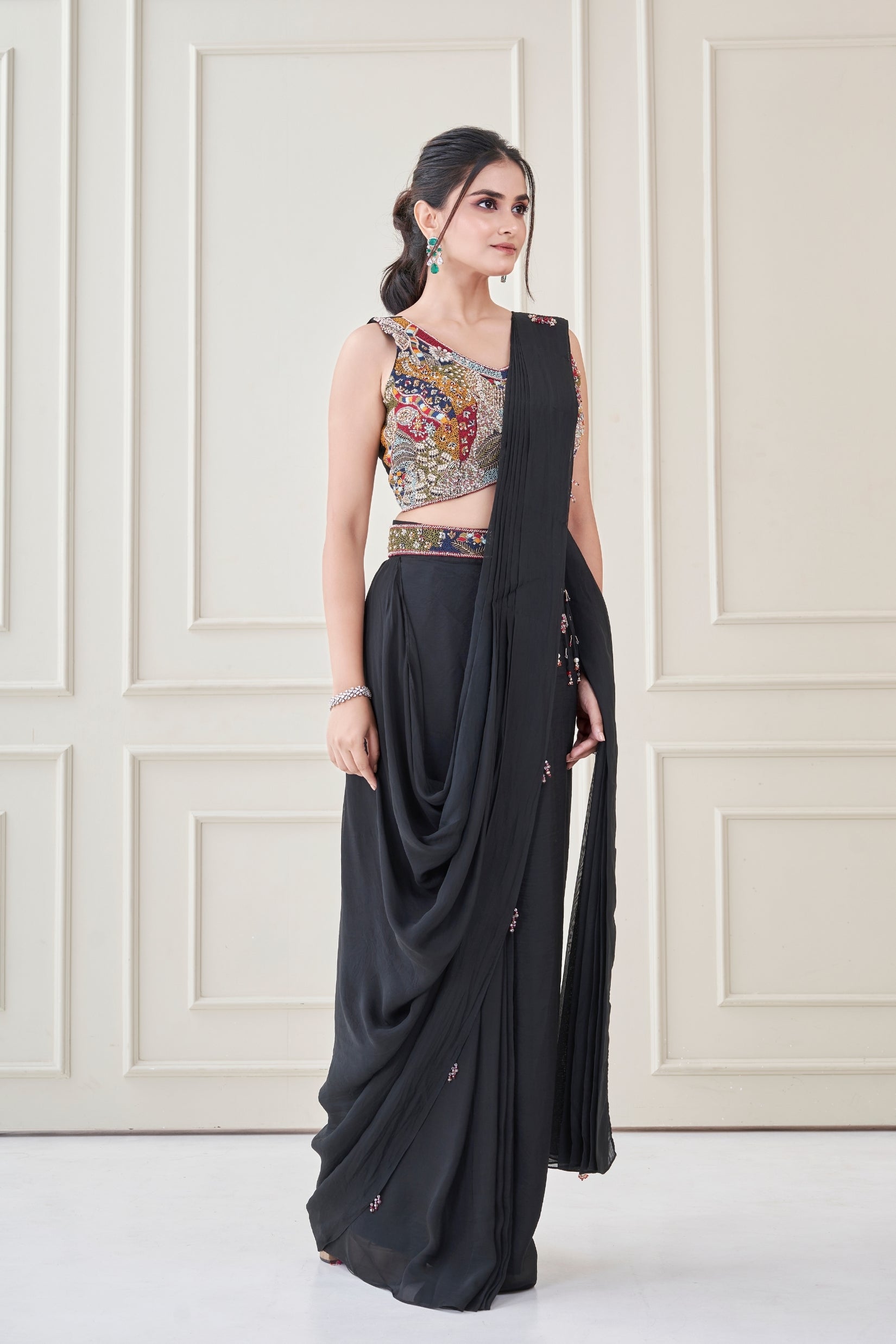 A dramatic black draped saree paired with a fully embellished blouse, featuring a hand-embellished belt detail that cinches the waist with elegance. Rich in colour, texture, and movement — designed for the modern celebration where tradition meets effortless glam.