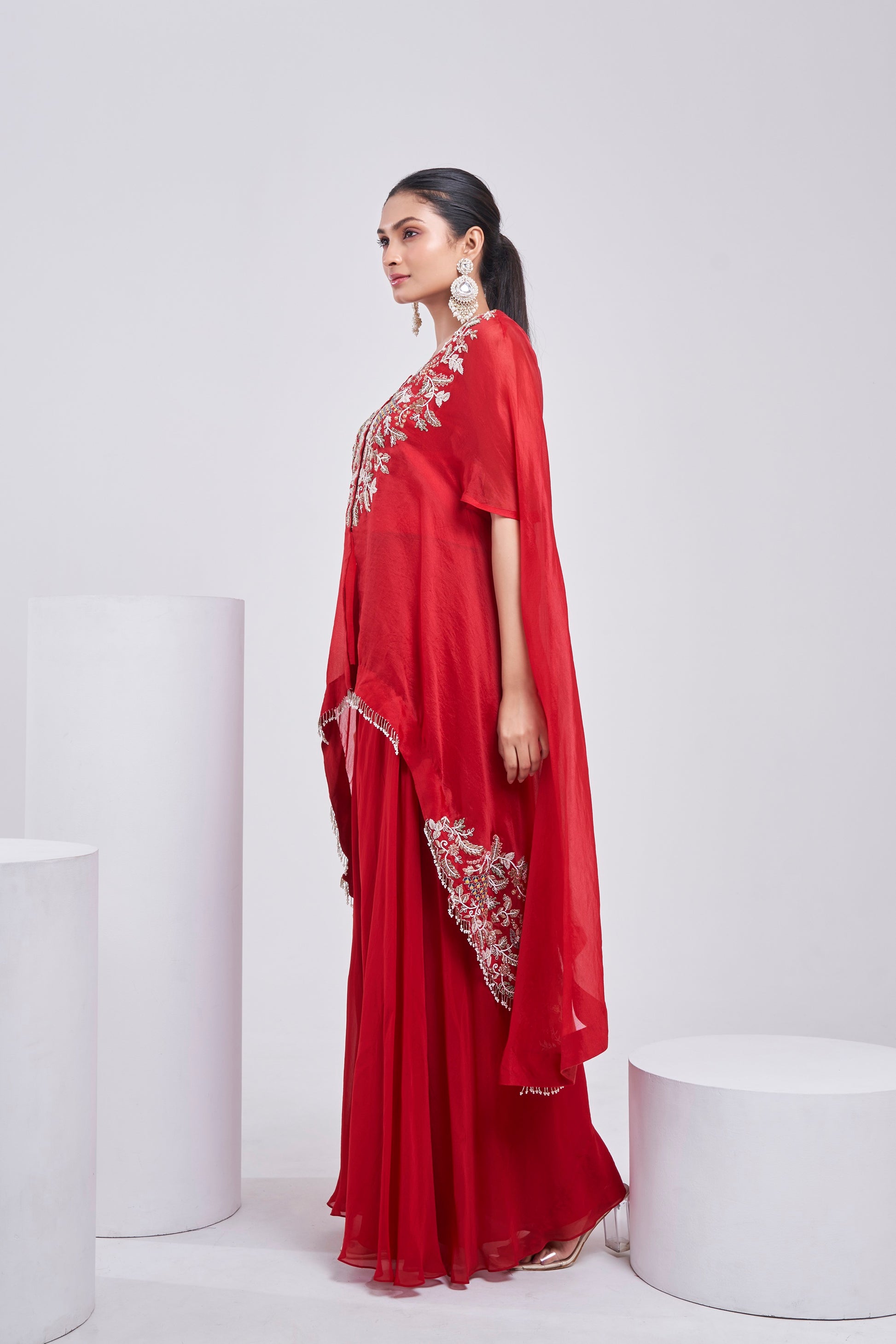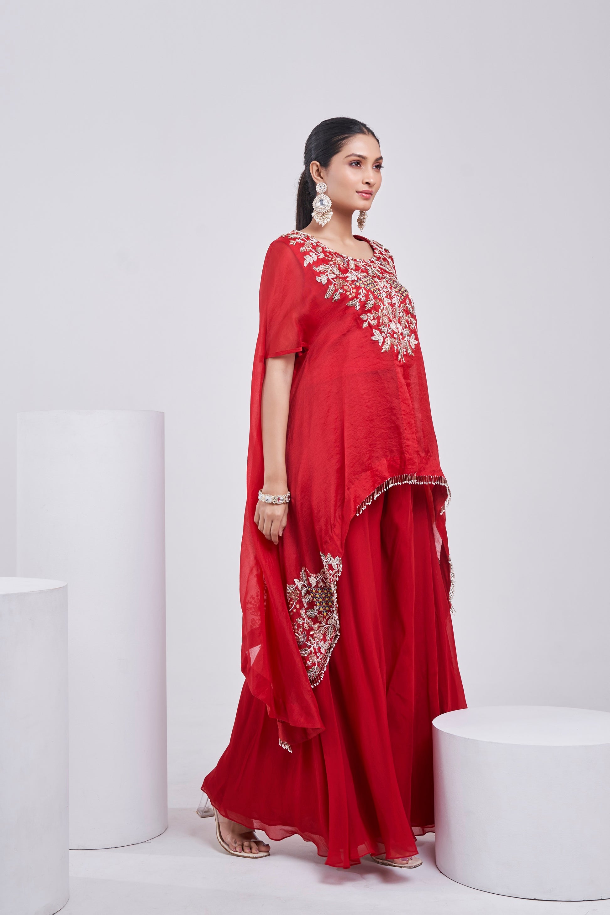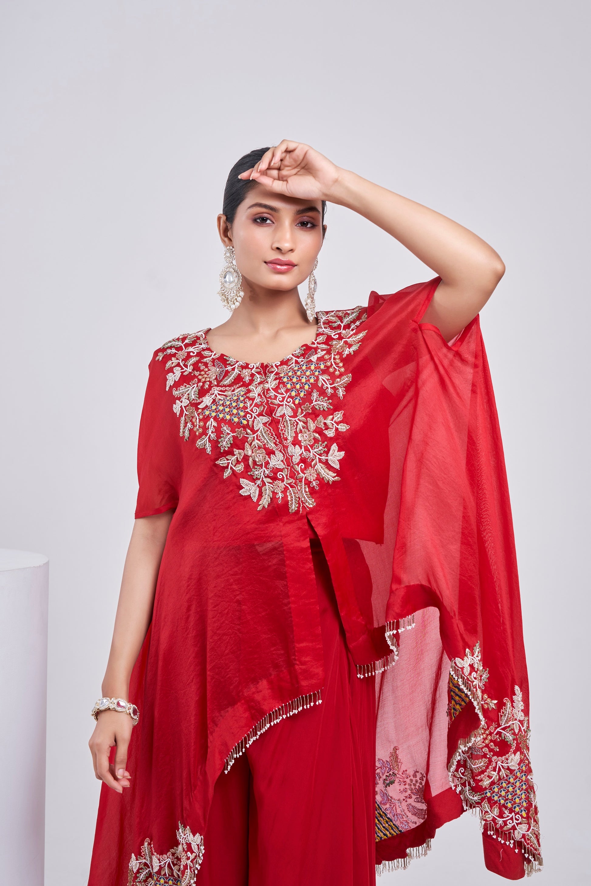 A fierce fusion of flow and finesse, Crimson Tara features a hand-embroidered asymmetrical cape top in luxurious organza, embellished with resham, zari, sequin, and beadwork. The neckline and hem are highlighted with ornate floral vines and latkan detailing, lending movement and richness to every step. Paired with relaxed silk palazzos, this silhouette is perfect for sangeet soirées, festive dinners, or a modern bride’s celebration.