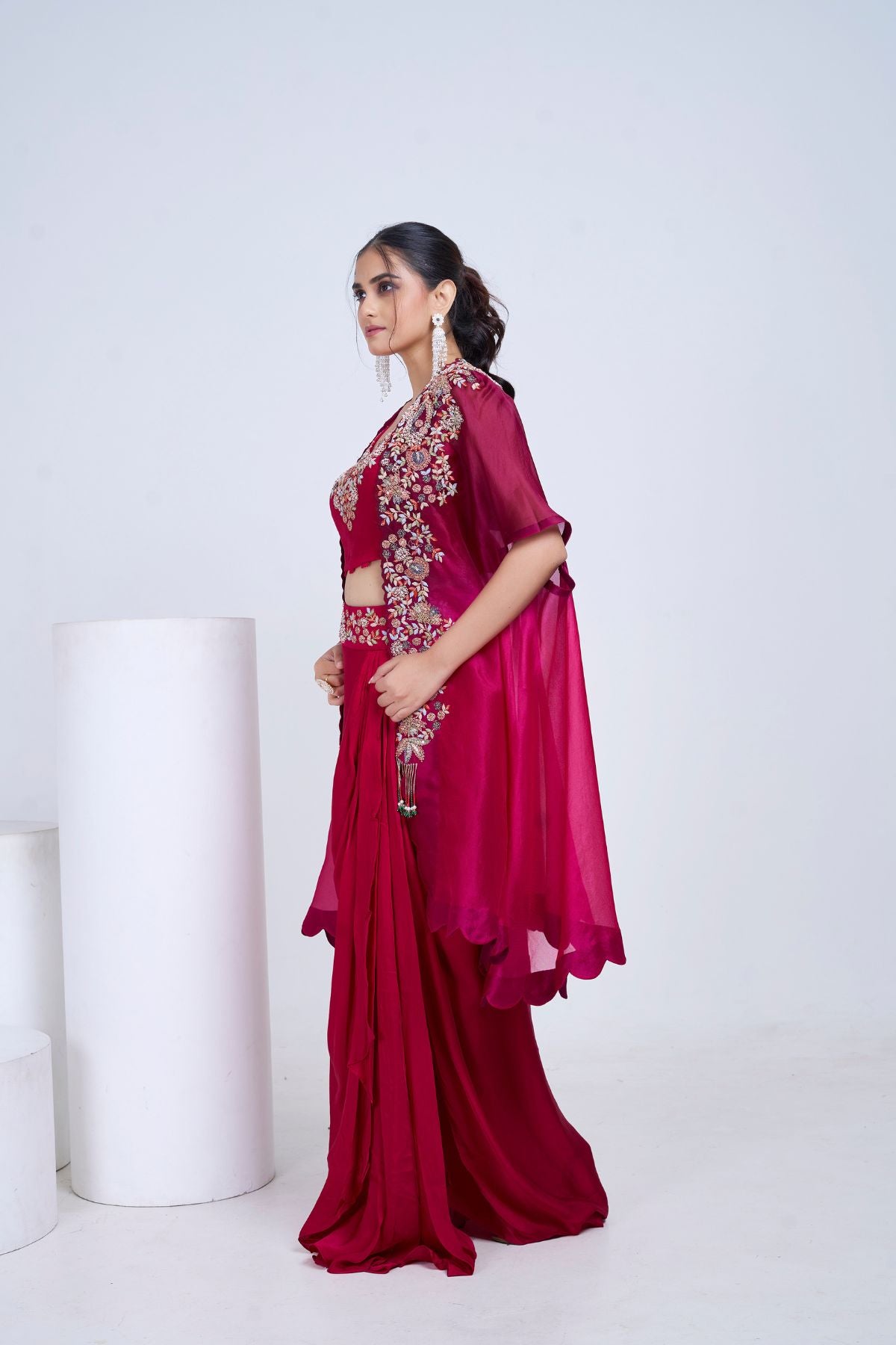 A vibrant drape set in a striking crimson hue, featuring an intricately embroidered blouse paired with a skirt drape and a statement organza cape. Hand-embellished details and scalloped finishing add finesse, making it perfect for cocktail evenings and festive celebrations.