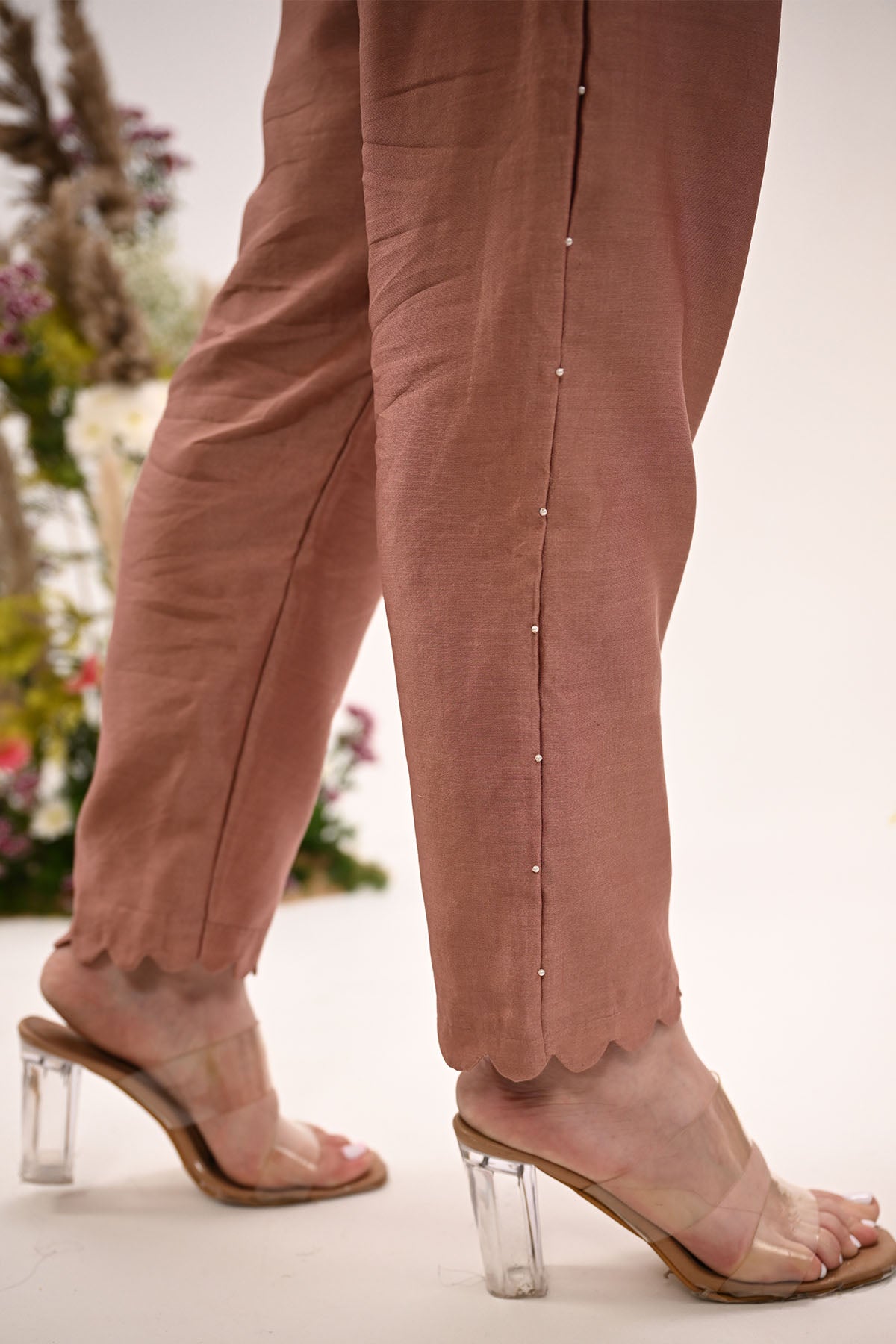 A cinnamon-toned coord set featuring ruched statement sleeves, a flattering tie-up waist, and a bold floral appliqué. Smart, soft, and designed for when structure meets effortless femininity.