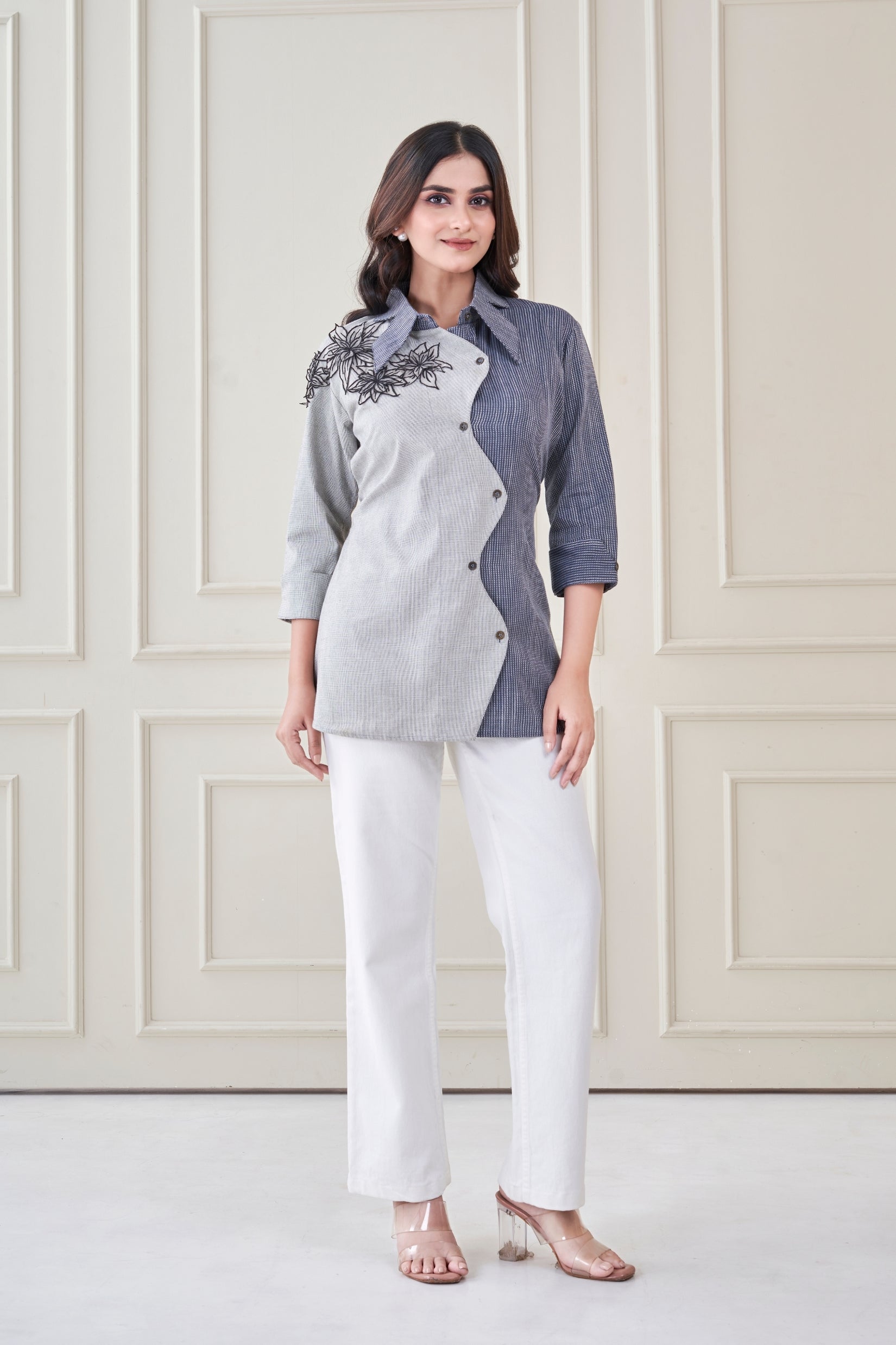 A modern assymetrical shirt with contrast panels and bold hand embroidery florals. Structured, yet soft, its a statement piece that blends edge with elegance