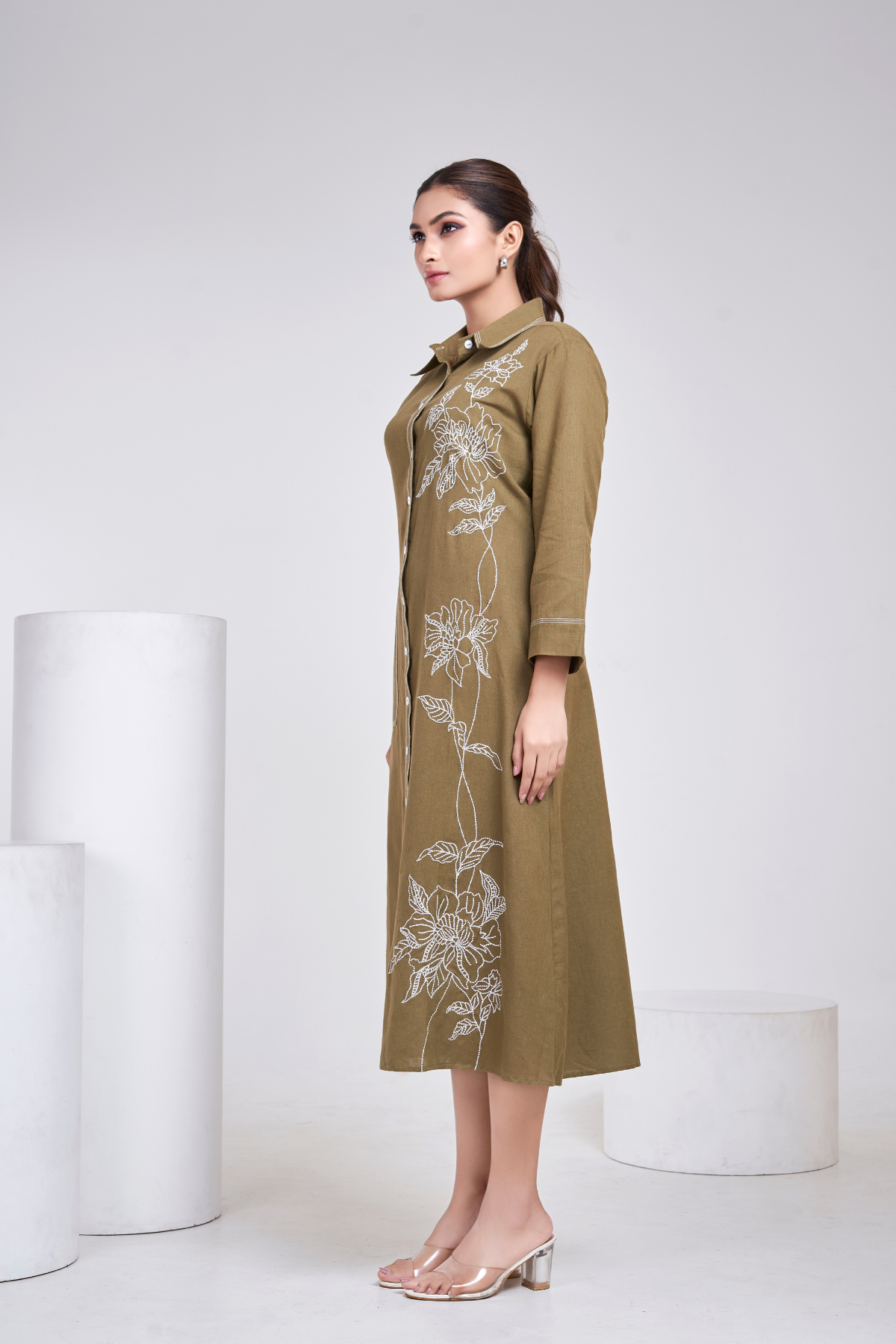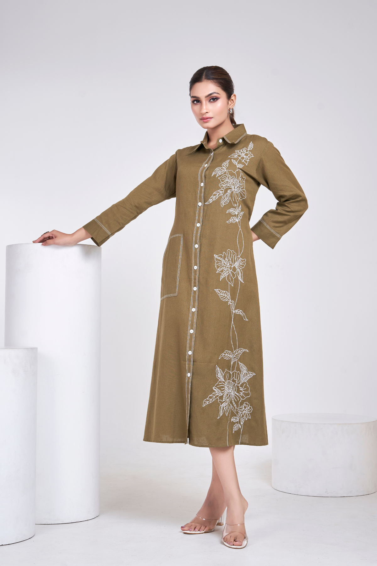 A breezy ode to minimalism, Ecru Botanica is a button-down midi shirt dress crafted in luxe khadi linen, highlighted with delicate monochrome botanical threadwork.