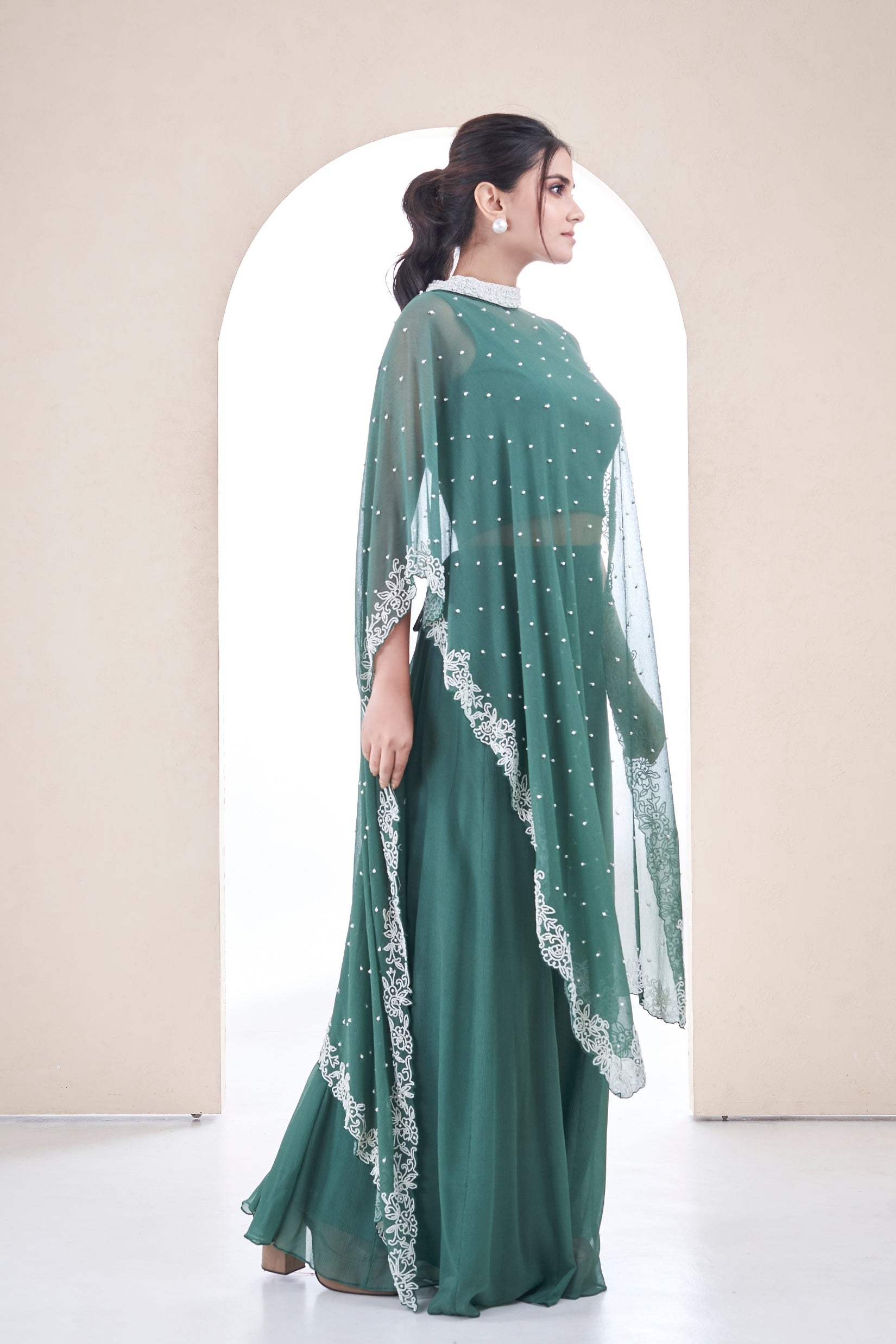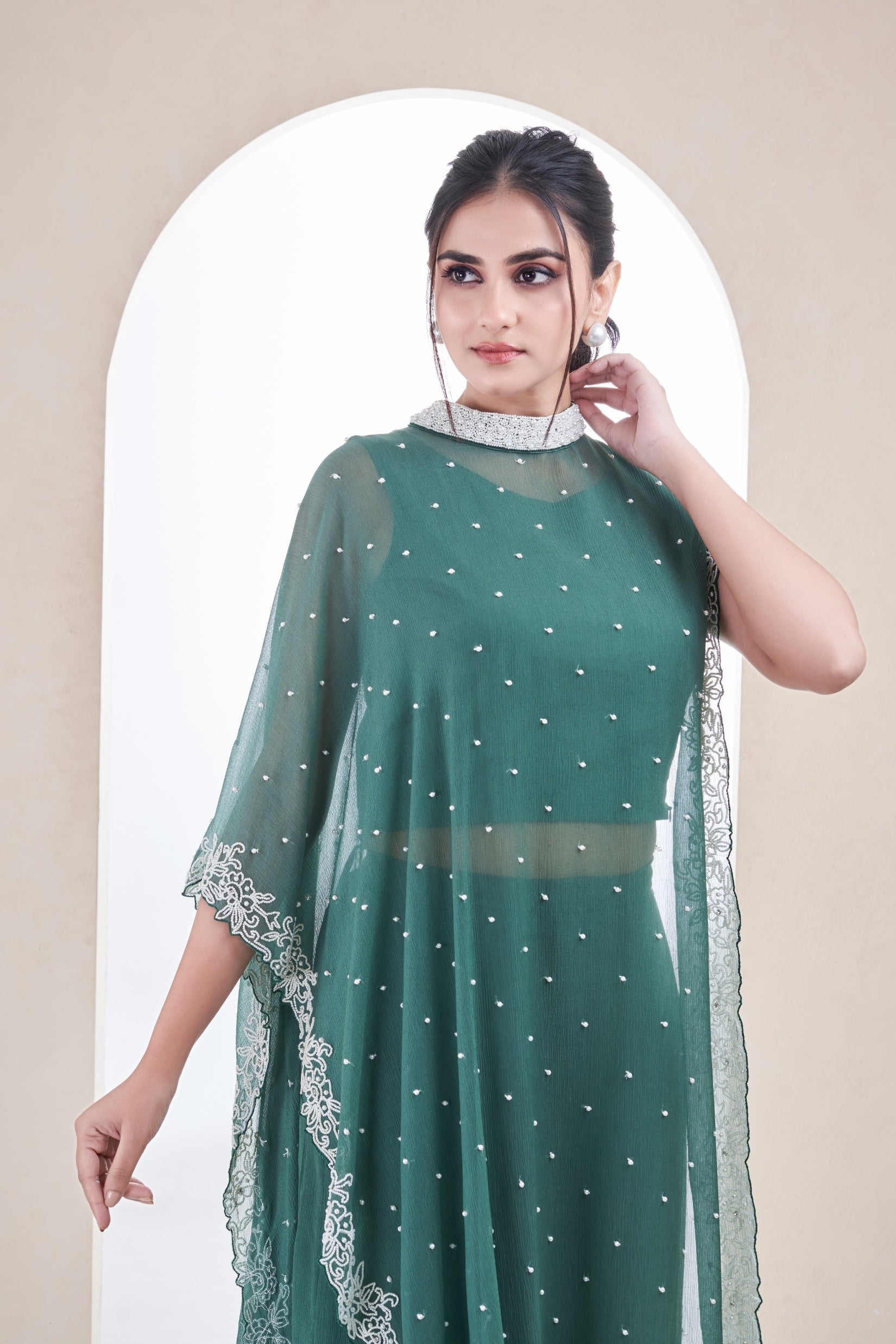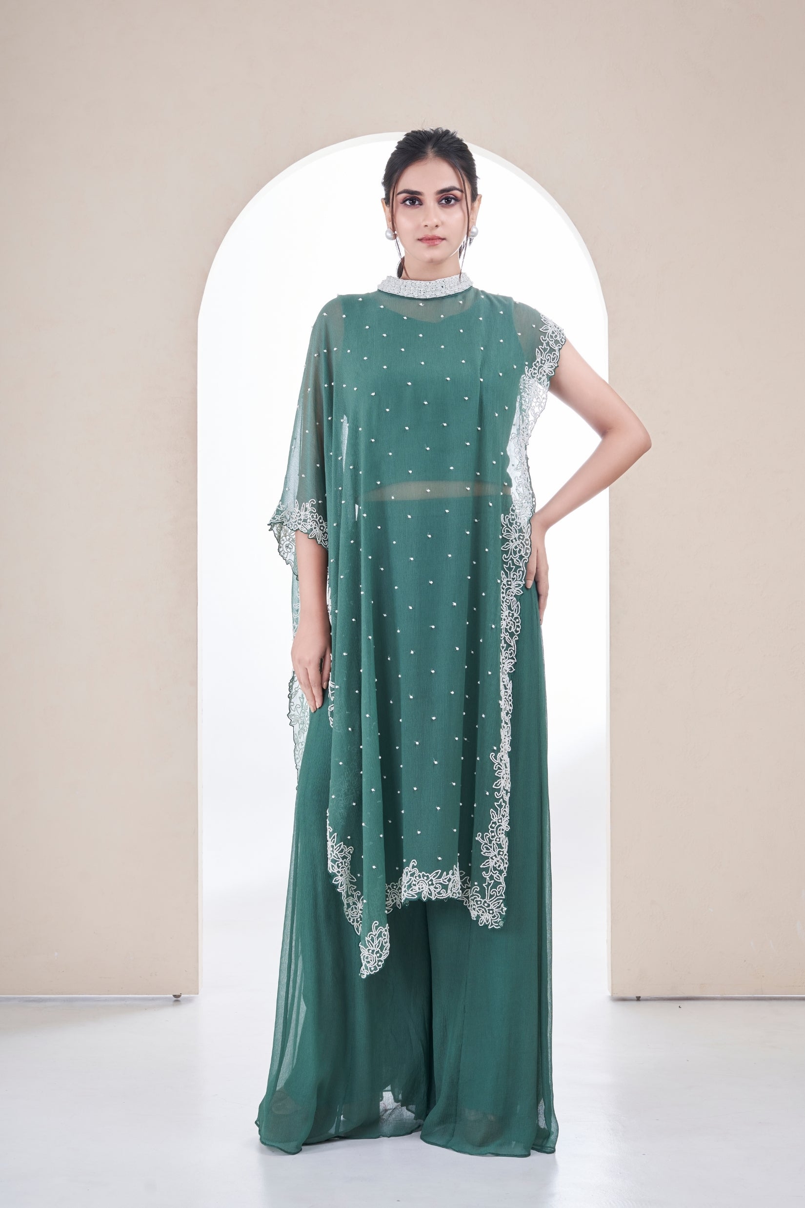 A watermelon red set with flared palazzos, a high-neck blouse, and a pearl-scattered dupatta style cape finished with intricate scallop pearl embroidery. Elegant, fluid, and luminous.
