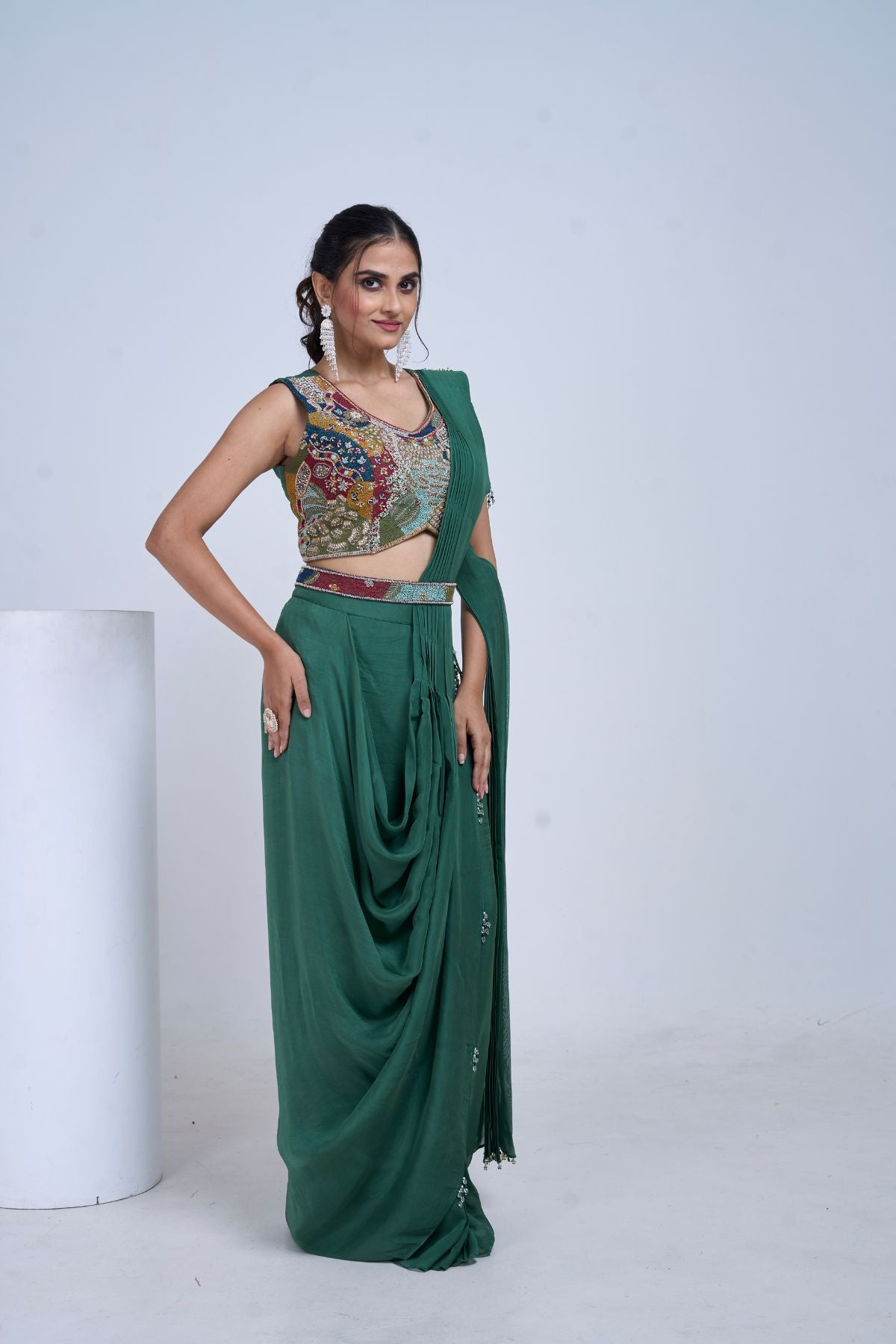 A dramatic green draped saree paired with a fully embellished blouse, featuring a hand-embellished belt detail that cinches the waist with elegance. Rich in colour, texture, and movement — designed for the modern celebration where tradition meets effortless glam.