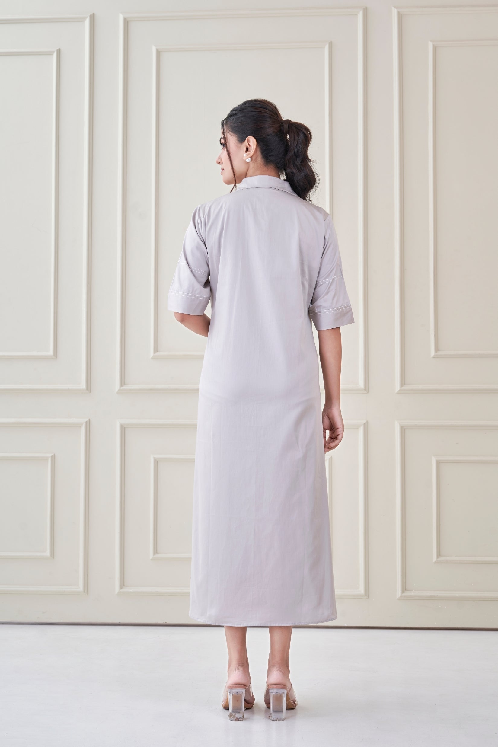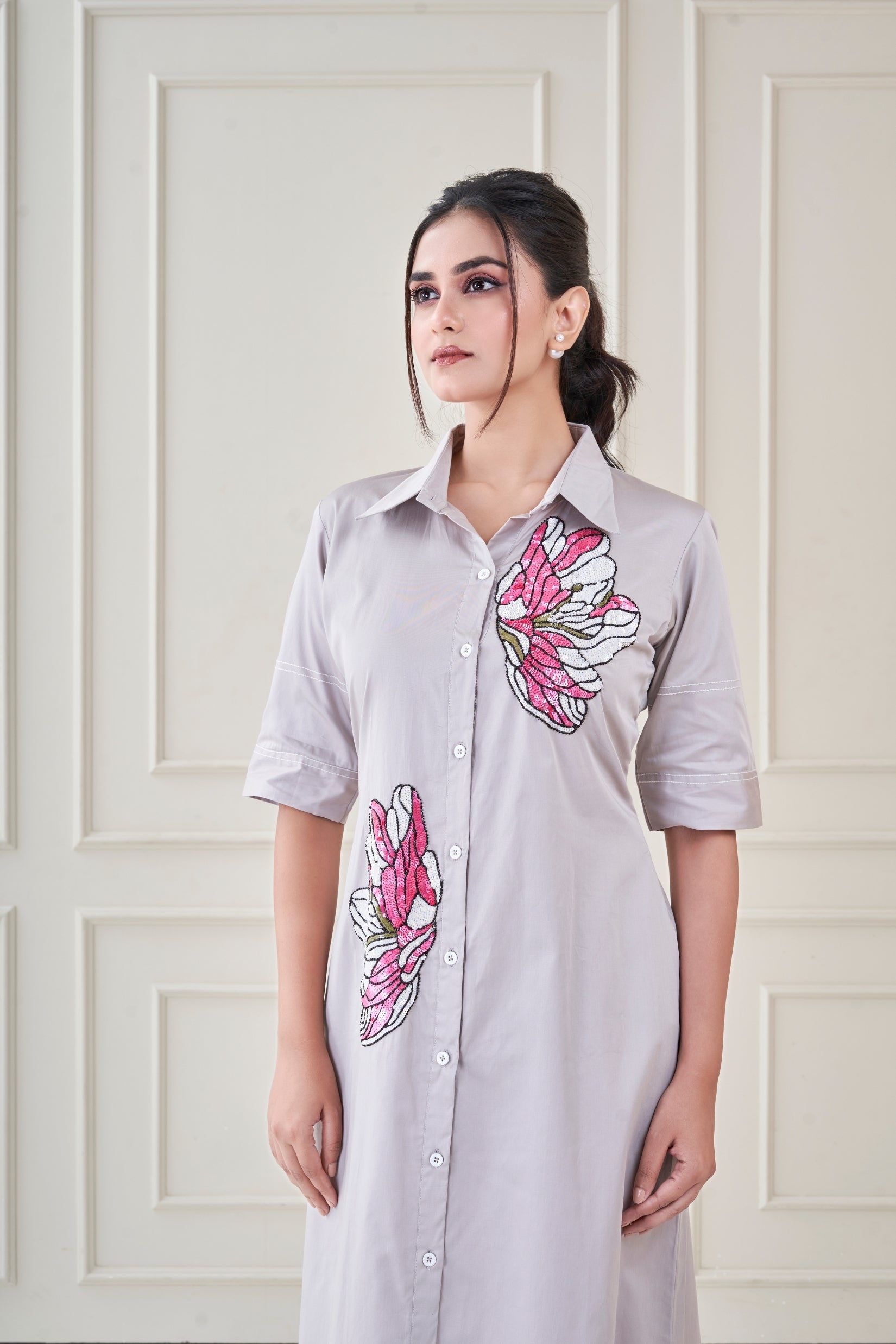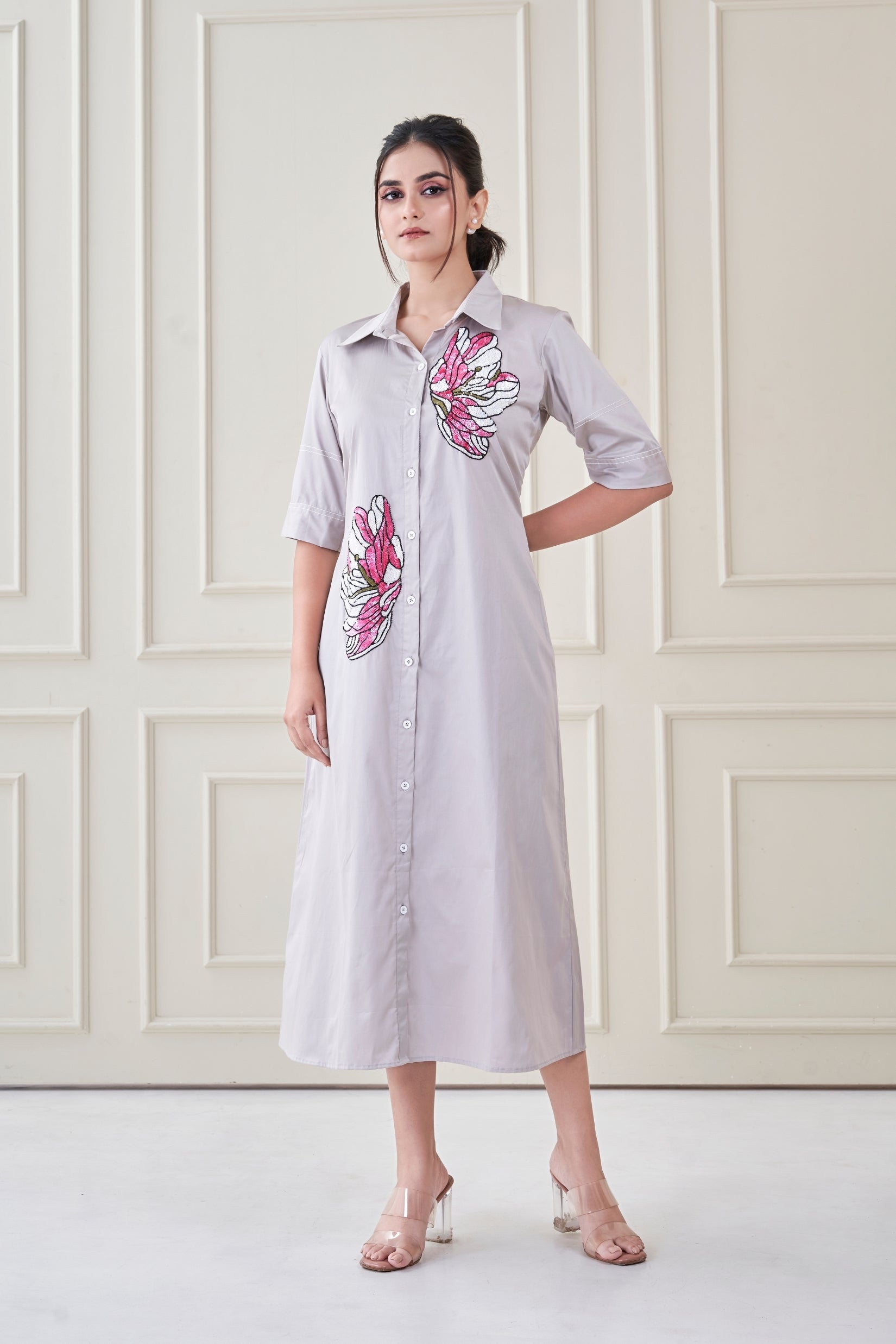 A relaxed shirt dress in light grey, featuring bold floral embroidery in hand-sketched style. An easygoing yet elevated piece that blends comfort with color.