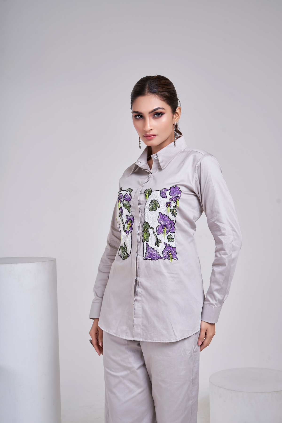 A soft dove-grey co-ord set featuring hand-embroidered floral panels in lilac and green, crafted in breathable cotton with a relaxed fit. Perfect for effortless, everyday elegance.