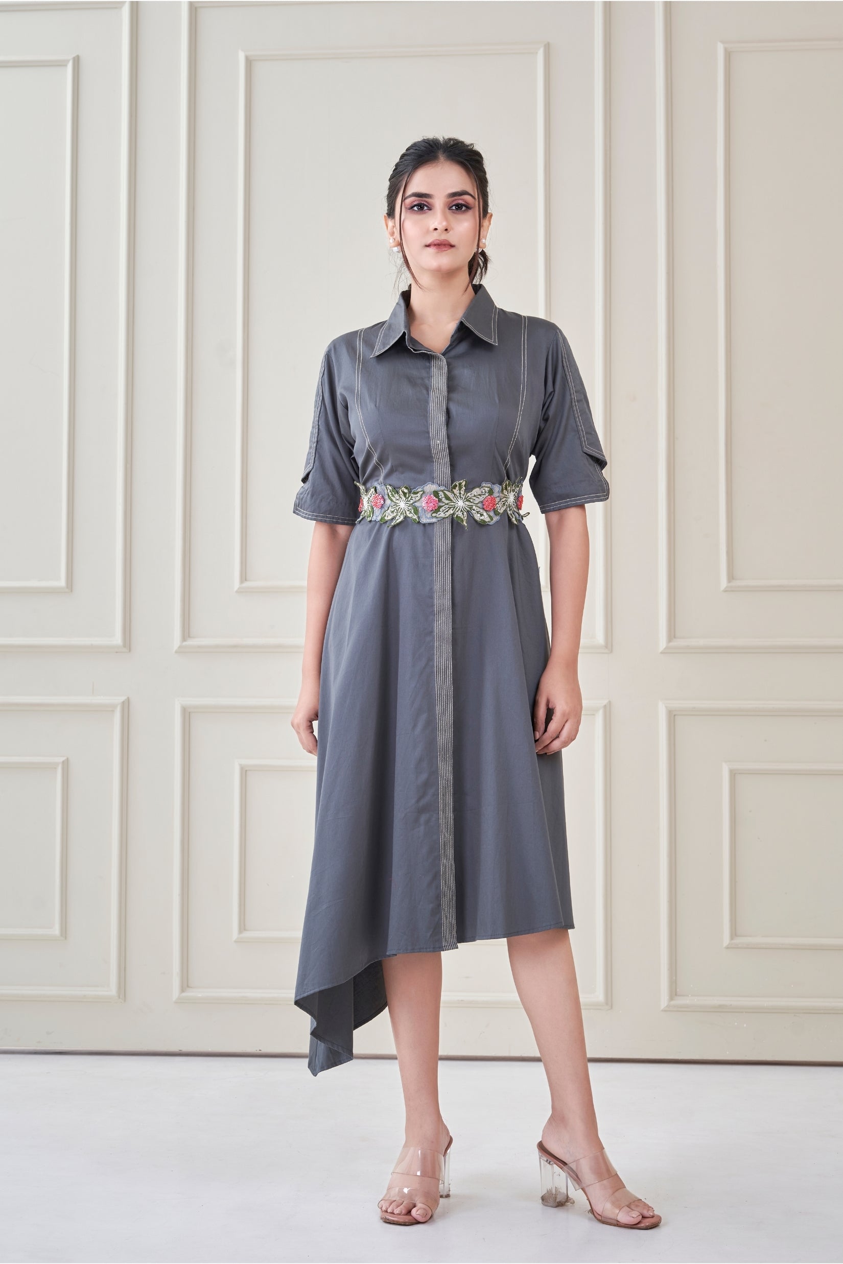 A grey shirt dress with an asymmetric hemline, elevated by hand-embroidered floral detailed belt at the waist. Polished yet romantic — made for everyday elegance with a soft statement.