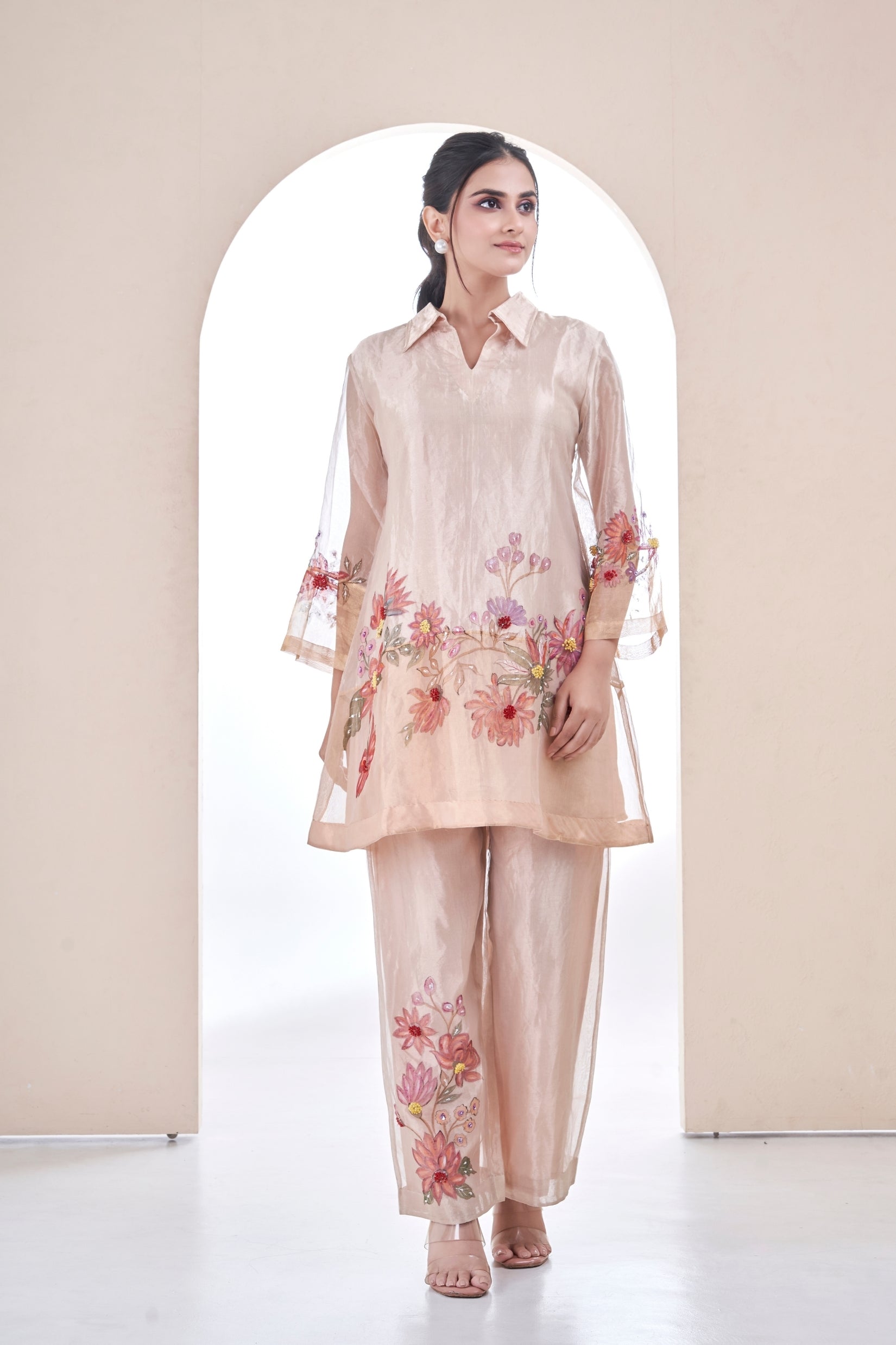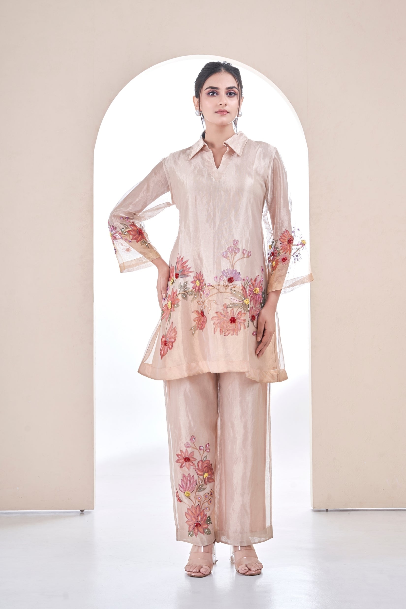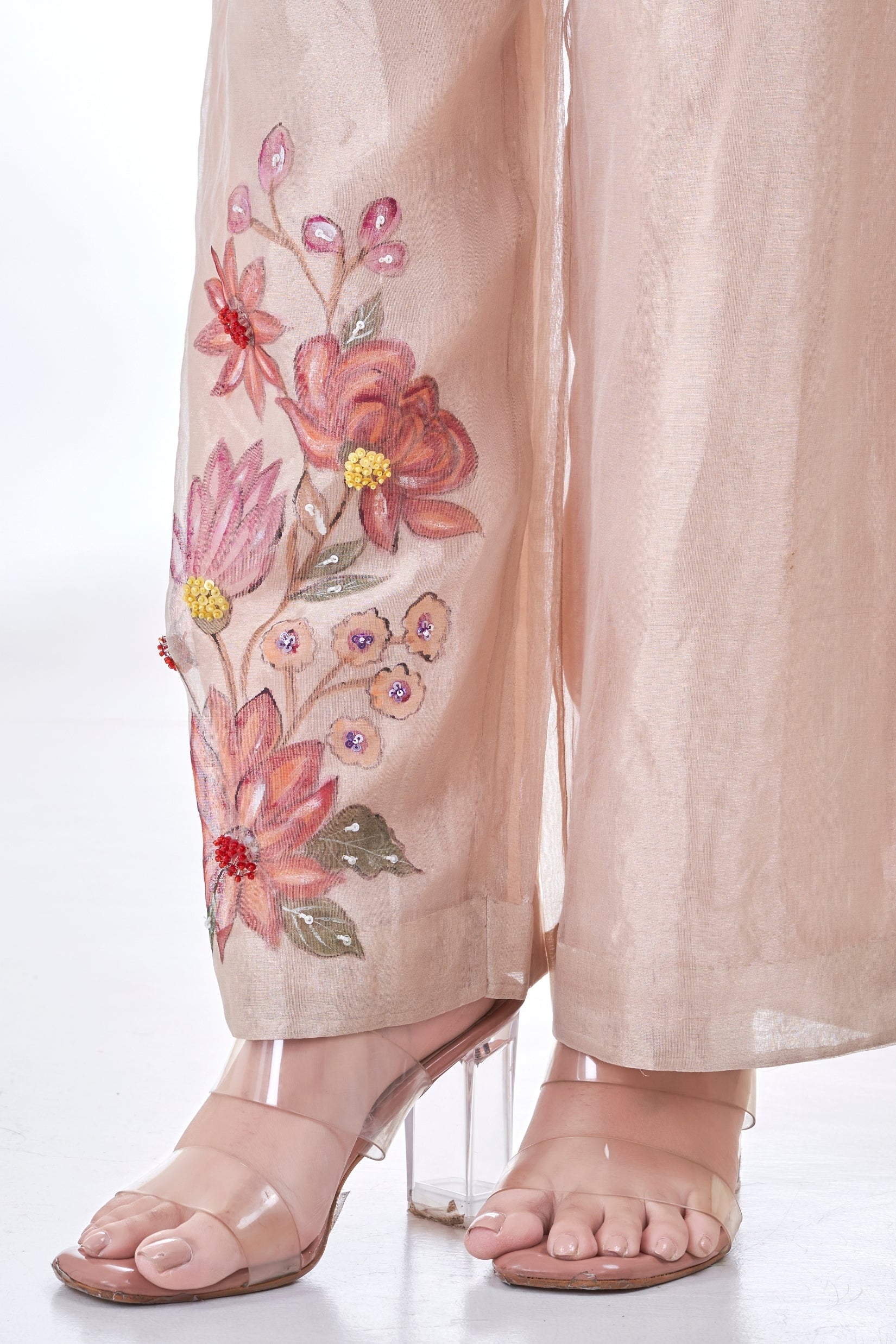 A luminous tissue coord set featuring hand-painted florals that bloom across the kurta and pants. Delicate, festive, and full of ease — ideal for pre-wedding occasions and sunlit celebrations.
