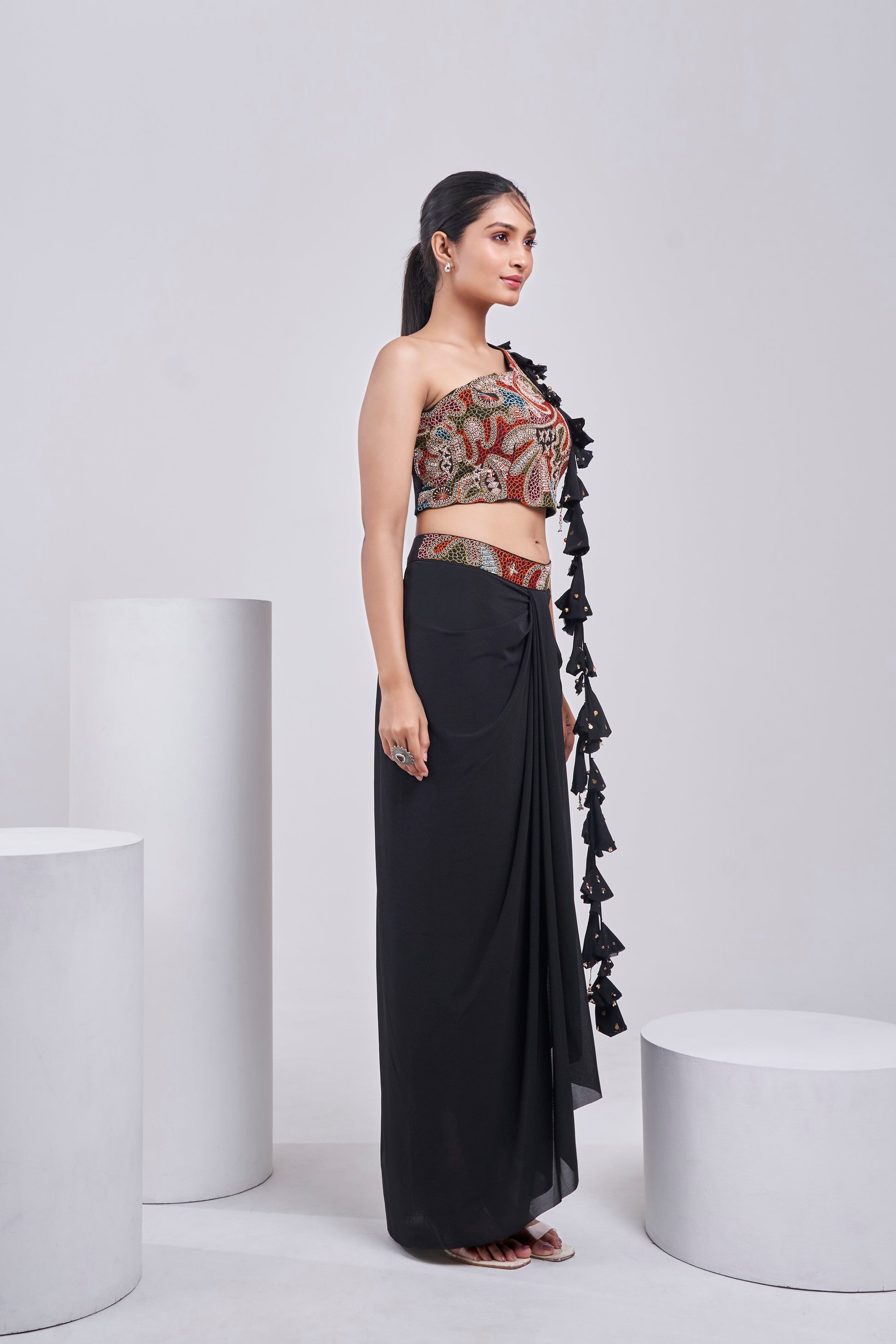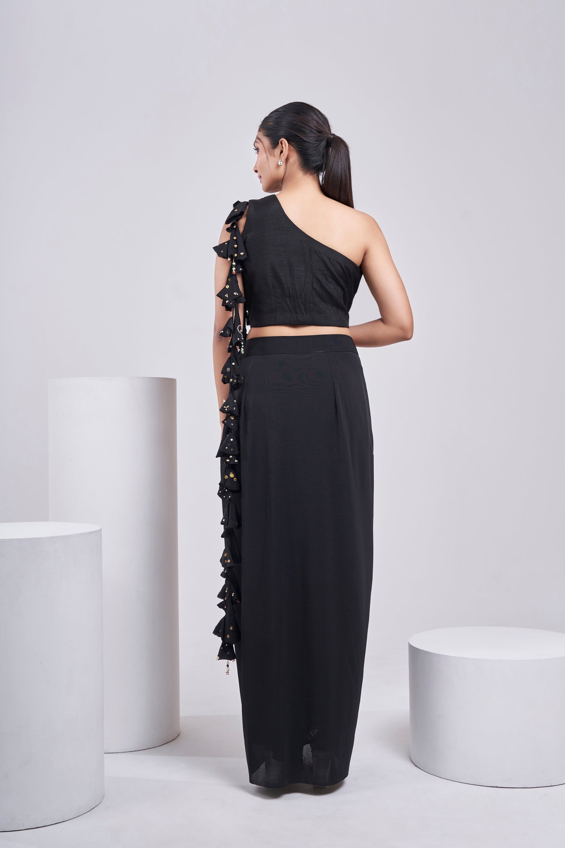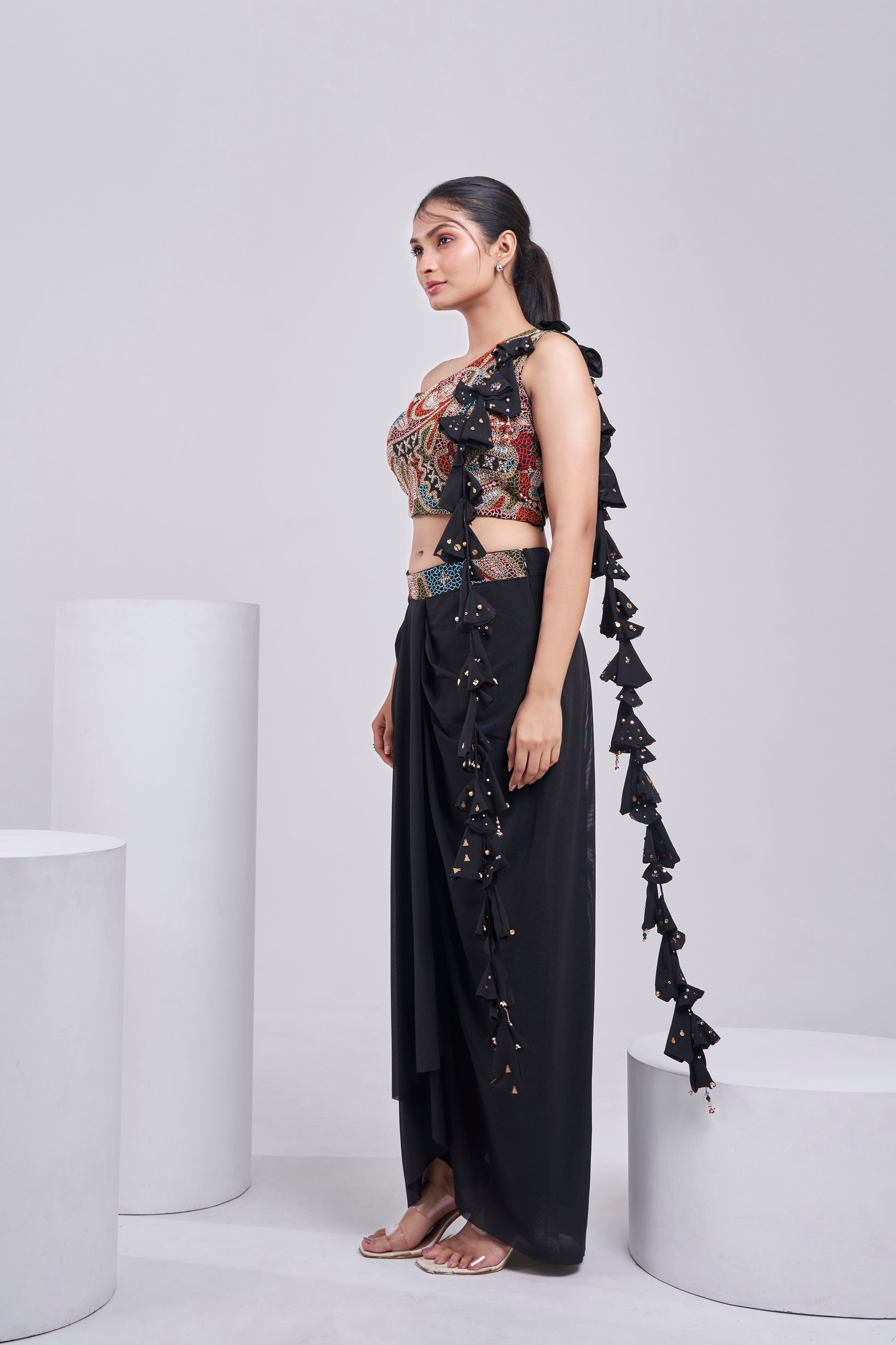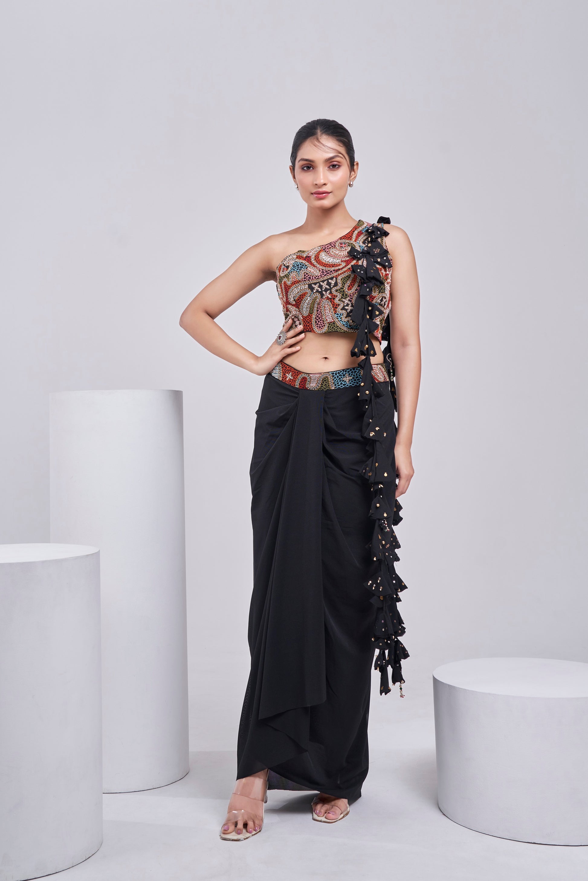 A bold blend of tradition and sass, Indie Noir features a hand-embroidered one-shoulder blouse inspired by Indian tribal and folk motifs, paired with a contemporary draped black dhoti skirt. The statement ruffled palla, finished with delicate embellisments, adds a touch of drama to this striking silhouette. Perfect for cocktail nights, fusion weddings, or when you want to serve desi glam with a twist.