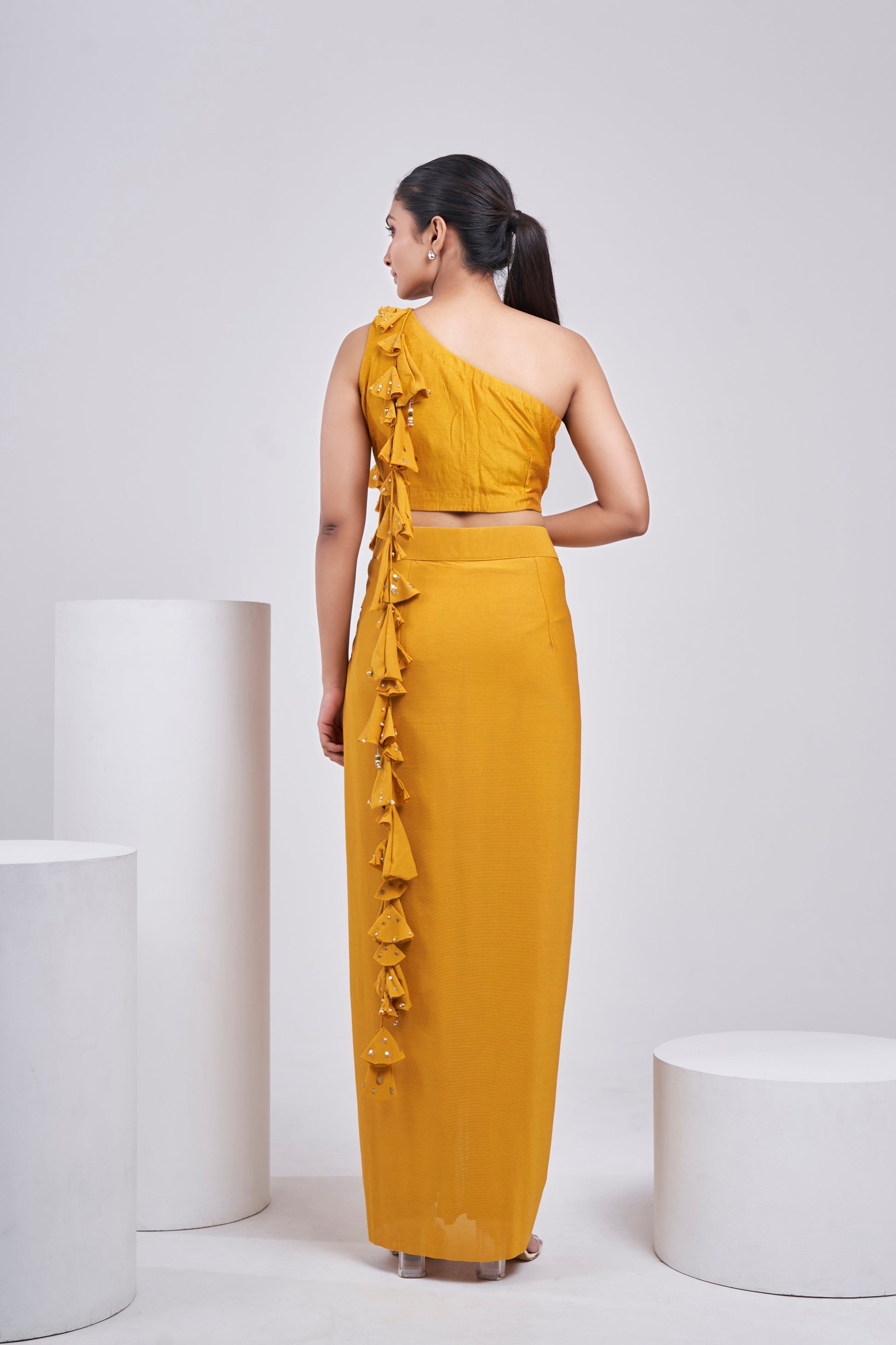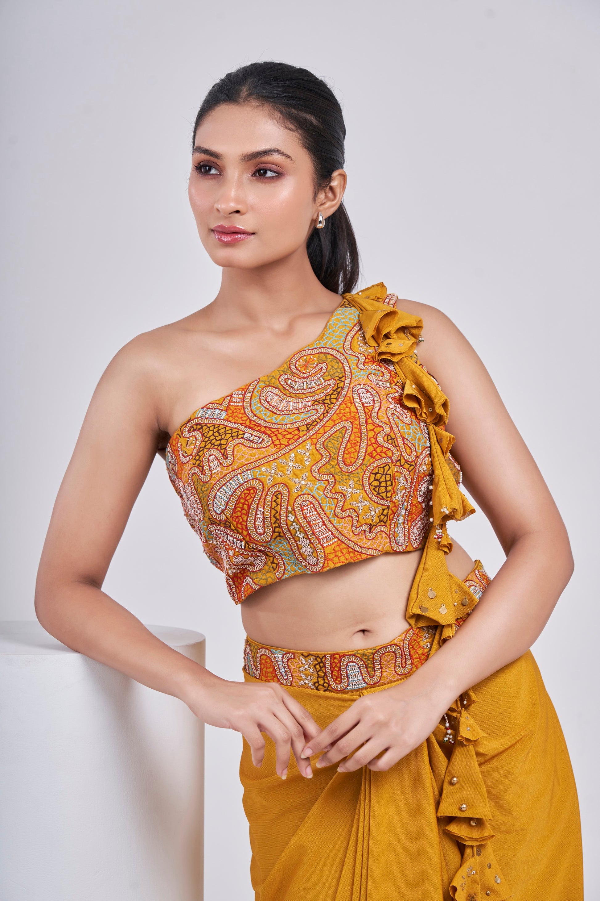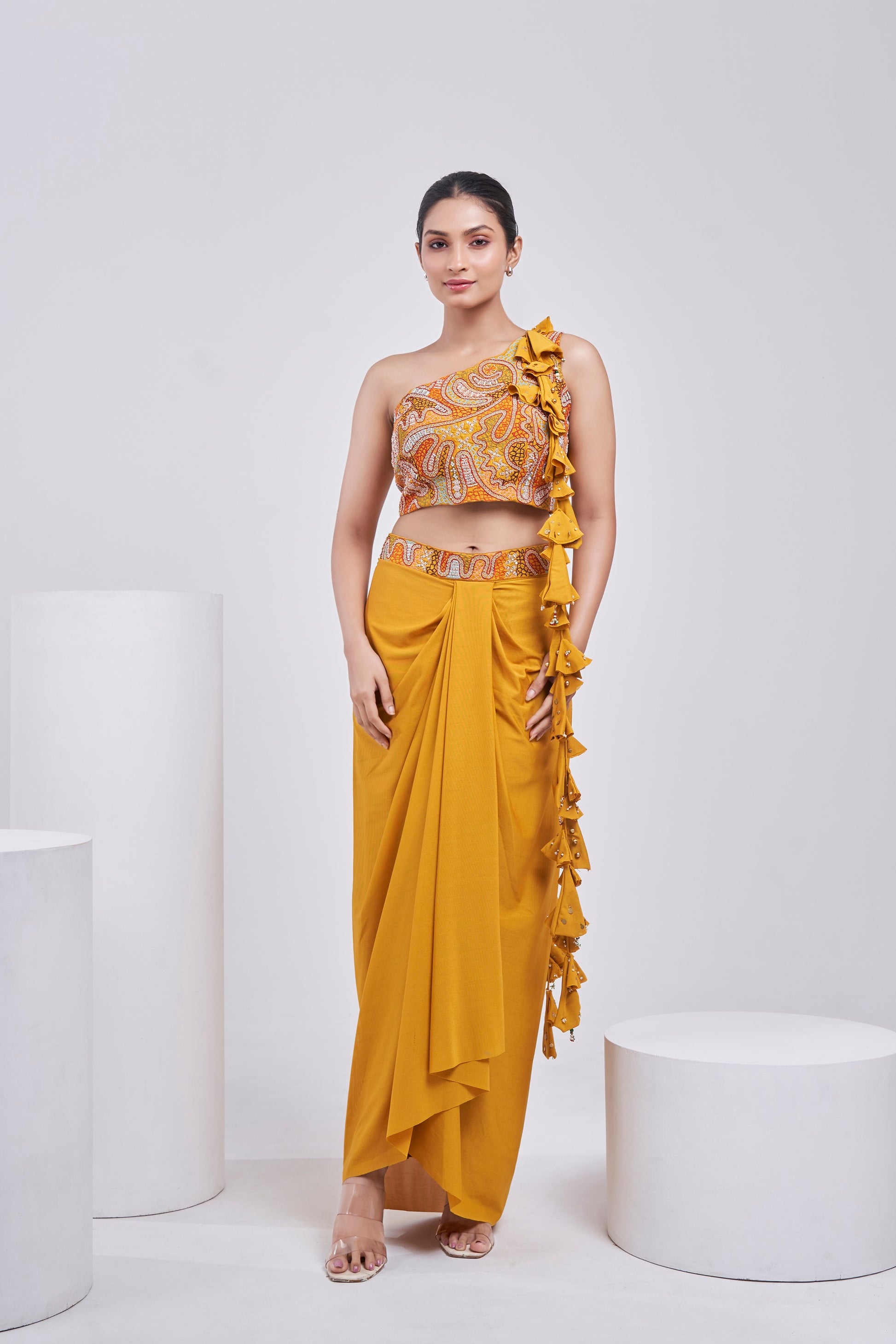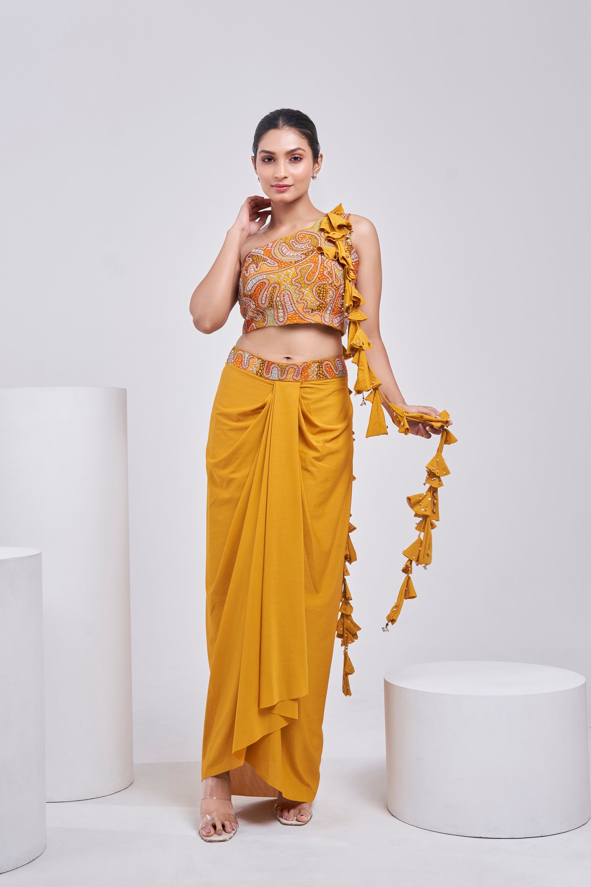 Drenched in festive mustard and fierce energy, Indie Sona is a sunshine-soaked counterpart to its noir twin. The one-shoulder blouse is adorned with intricate threadwork in earthy tones, paired with a draped dhoti skirt and ruffled palla cascading with embellished latkans. A head-turning pick for haldi, day weddings, or when you’re in the mood to steal the spotlight — desi, but make it drama.