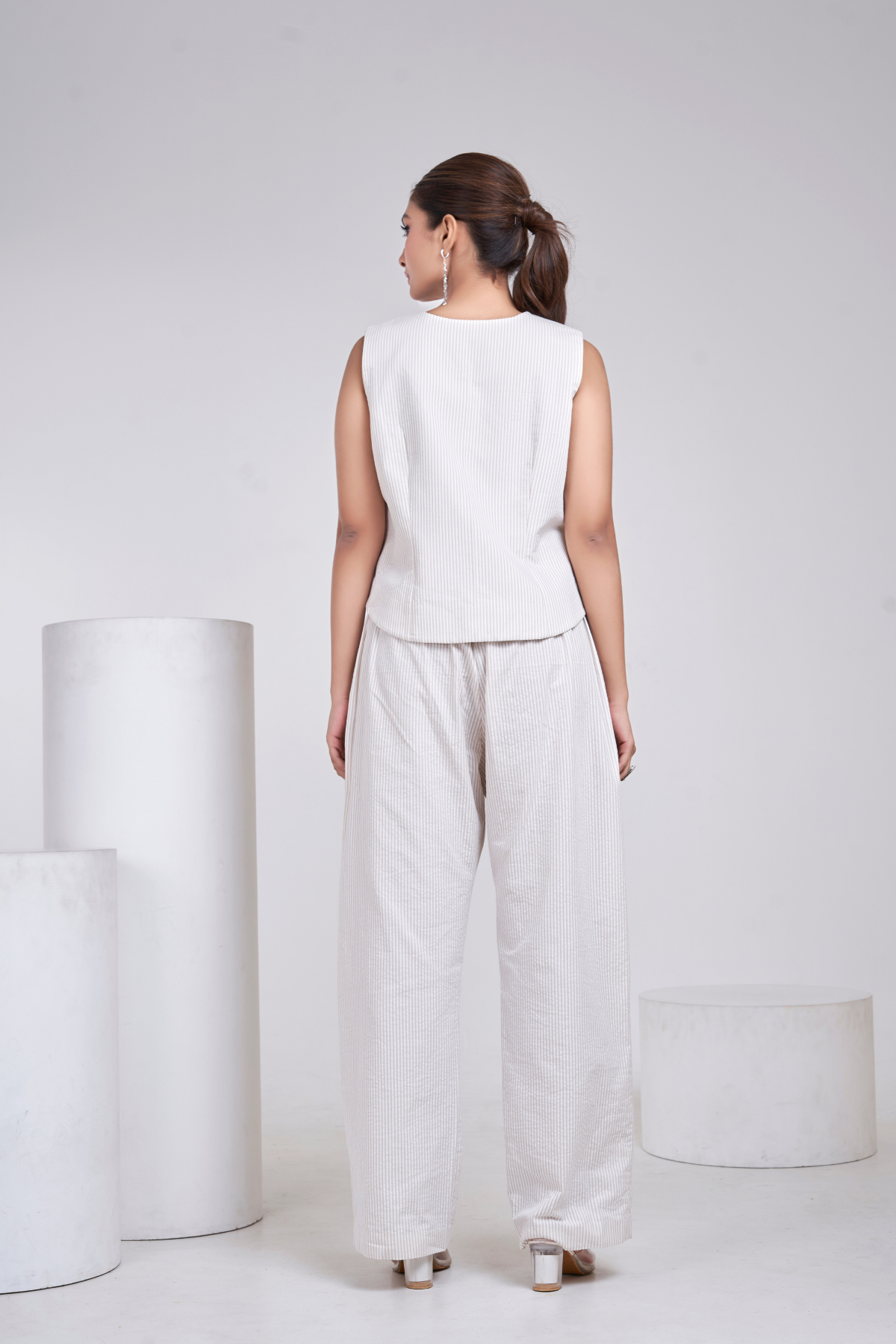 Ivory Bloom is a breezy co-ord set in soft ivory pinstripes, featuring a structured sleeveless waistcoat and tailored straight pants, highlighted with vibrant hand painted floral bunches.