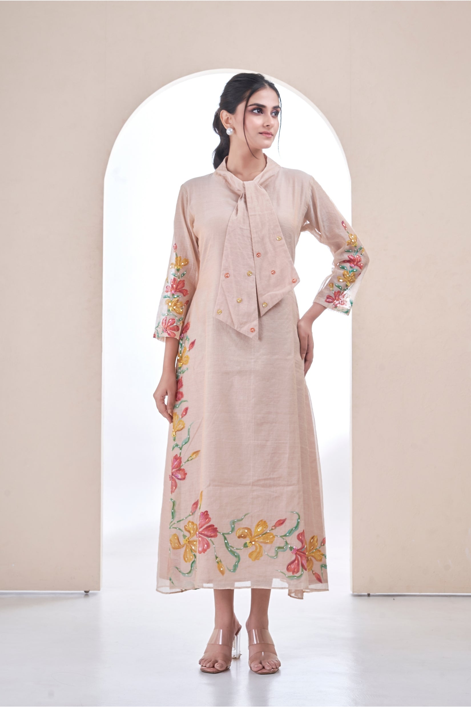 An elegant subtle tissue ivory dress hand-painted with vibrant florals across the sleeves and hem. Featuring a soft gathered neckline with tie detailing, it’s a wearable canvas of craft and colour — perfect for intimate festive moments or day celebrations.