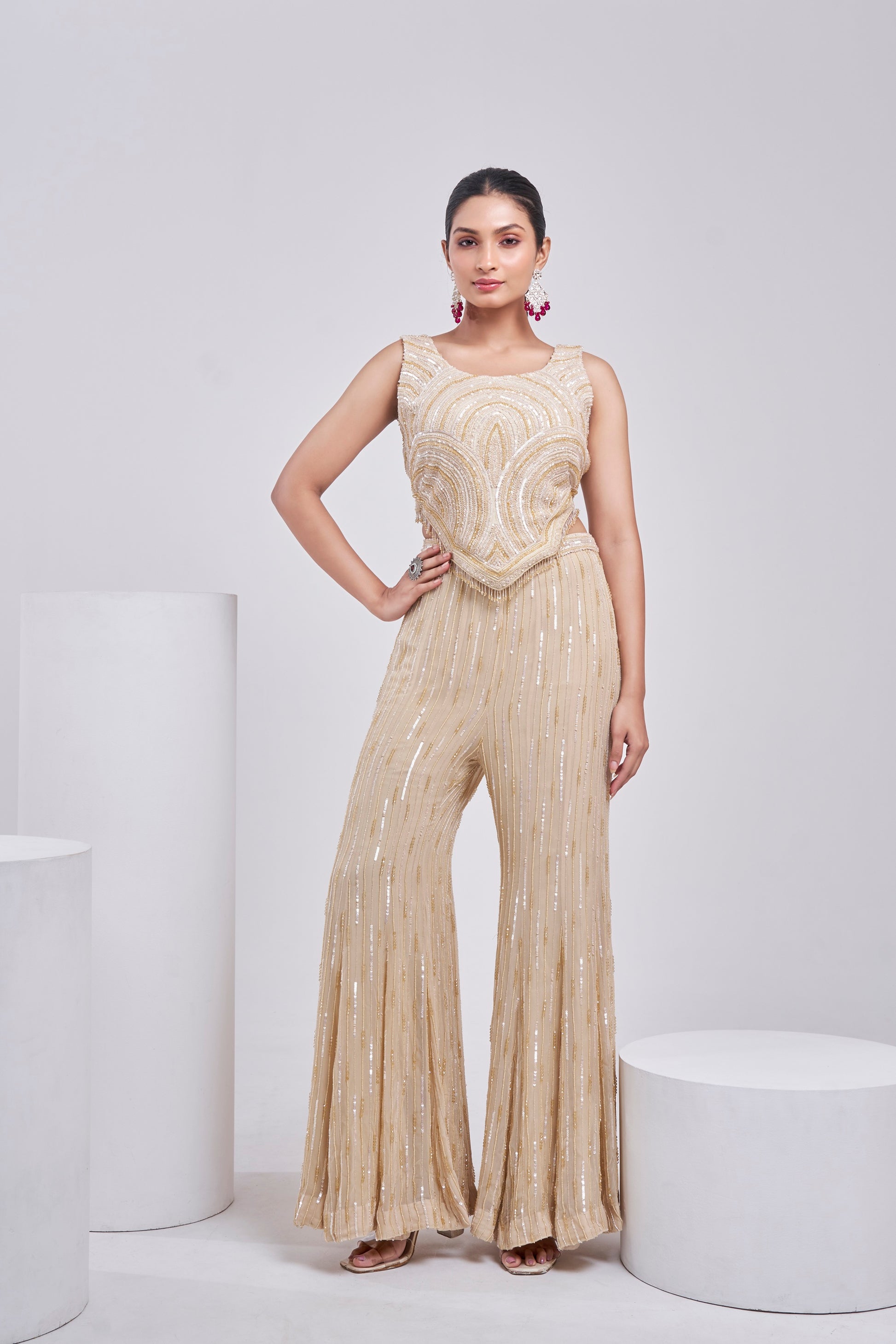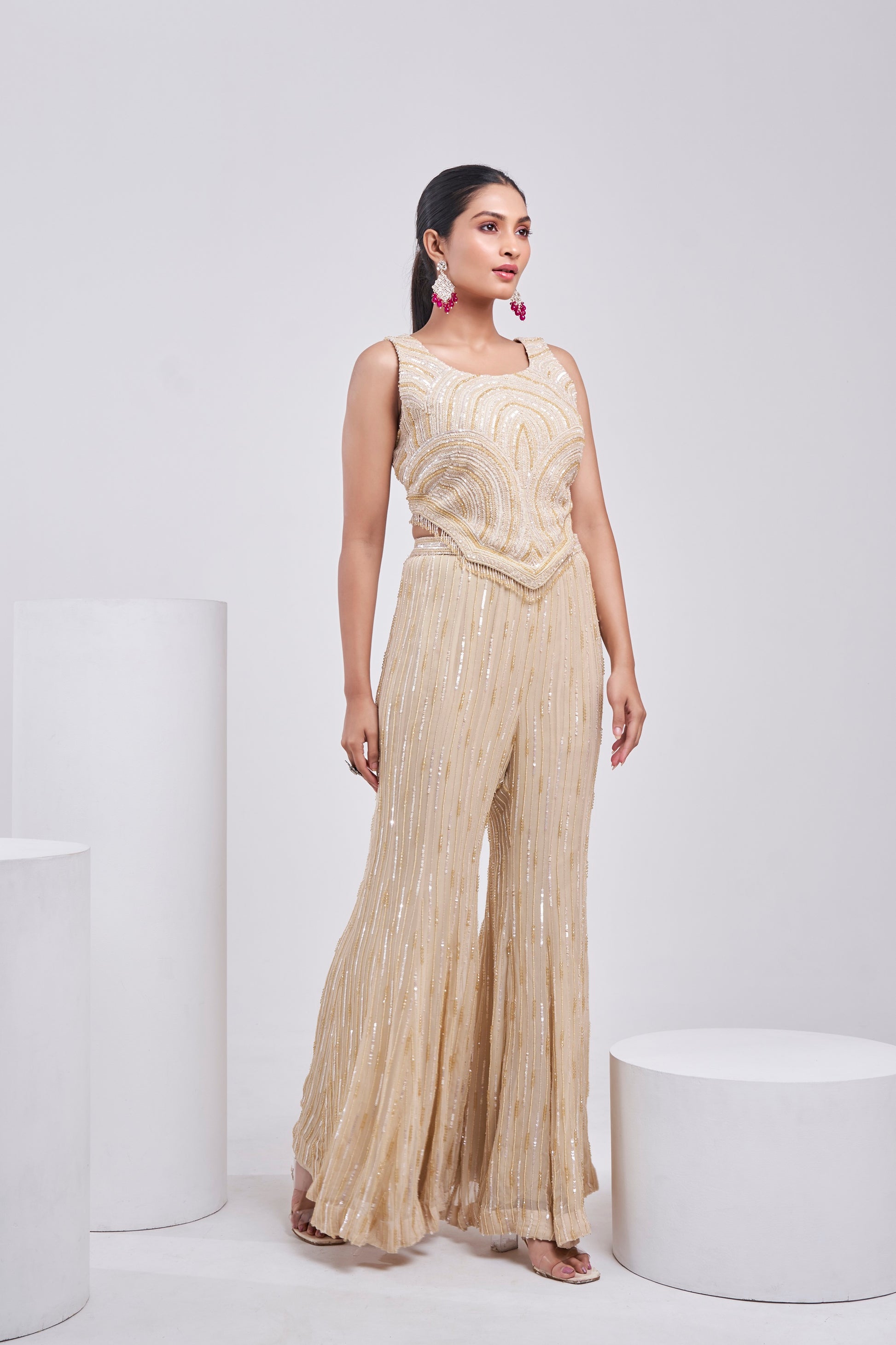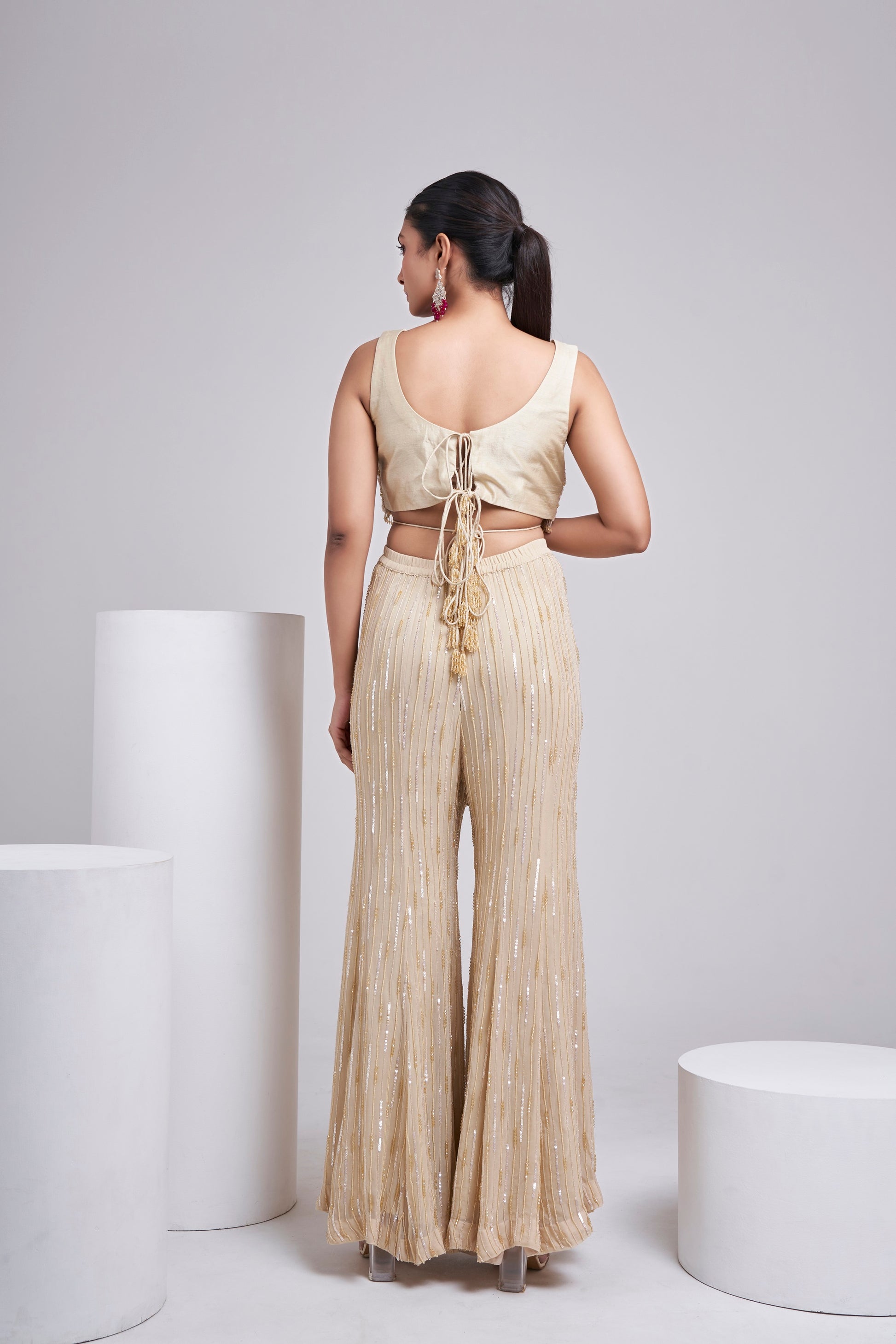 An opulent ode to glamour, Ivory Mirage Set features a hand-embellished backless choli adorned with art deco-inspired beadwork and sequin detailing that exudes vintage charm. Paired with a flowy sharara crafted with tonal shimmer, the set glistens with every movement. Perfect for cocktail celebrations, mehendi evenings, or any modern festive affair that calls for effortless drama and grace.