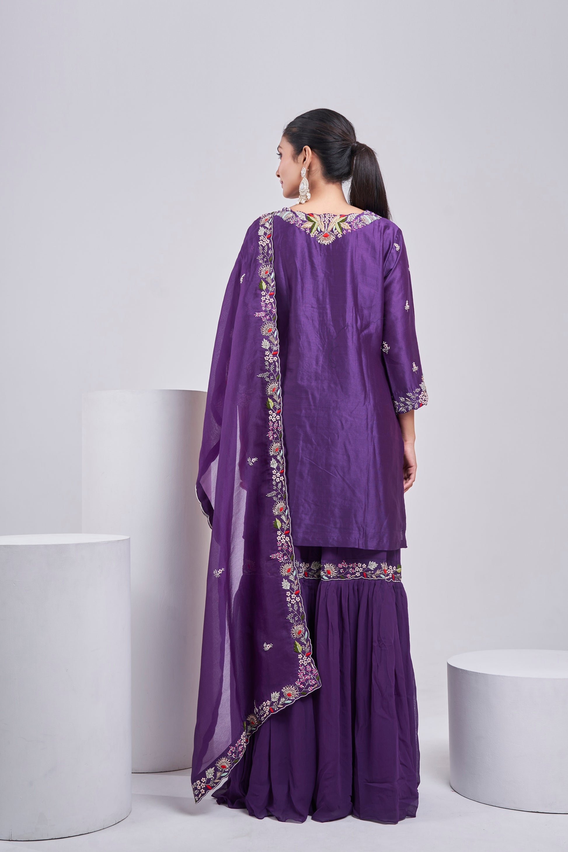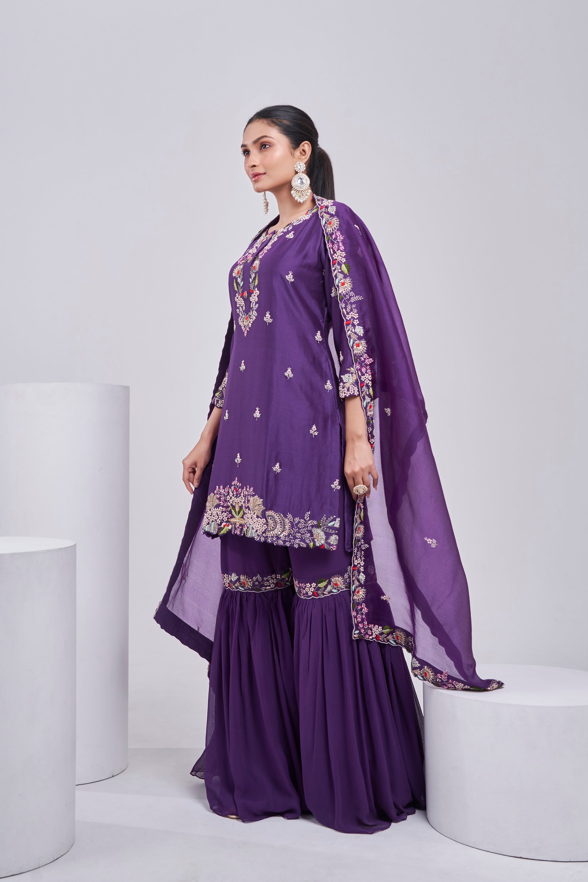 Rooted in rich heritage, Jamuni Baagh is a regal three-piece ensemble in deep plum that captures the charm of heirloom craftsmanship. The kurta features intricate embroidery ,paired with a voluminous sharara and a soft organza dupatta adorned with delicate borders and scattered butis. A perfect pick for festive luncheons, mehendi gatherings, or weddings — this set is where tradition meets timeless elegance.