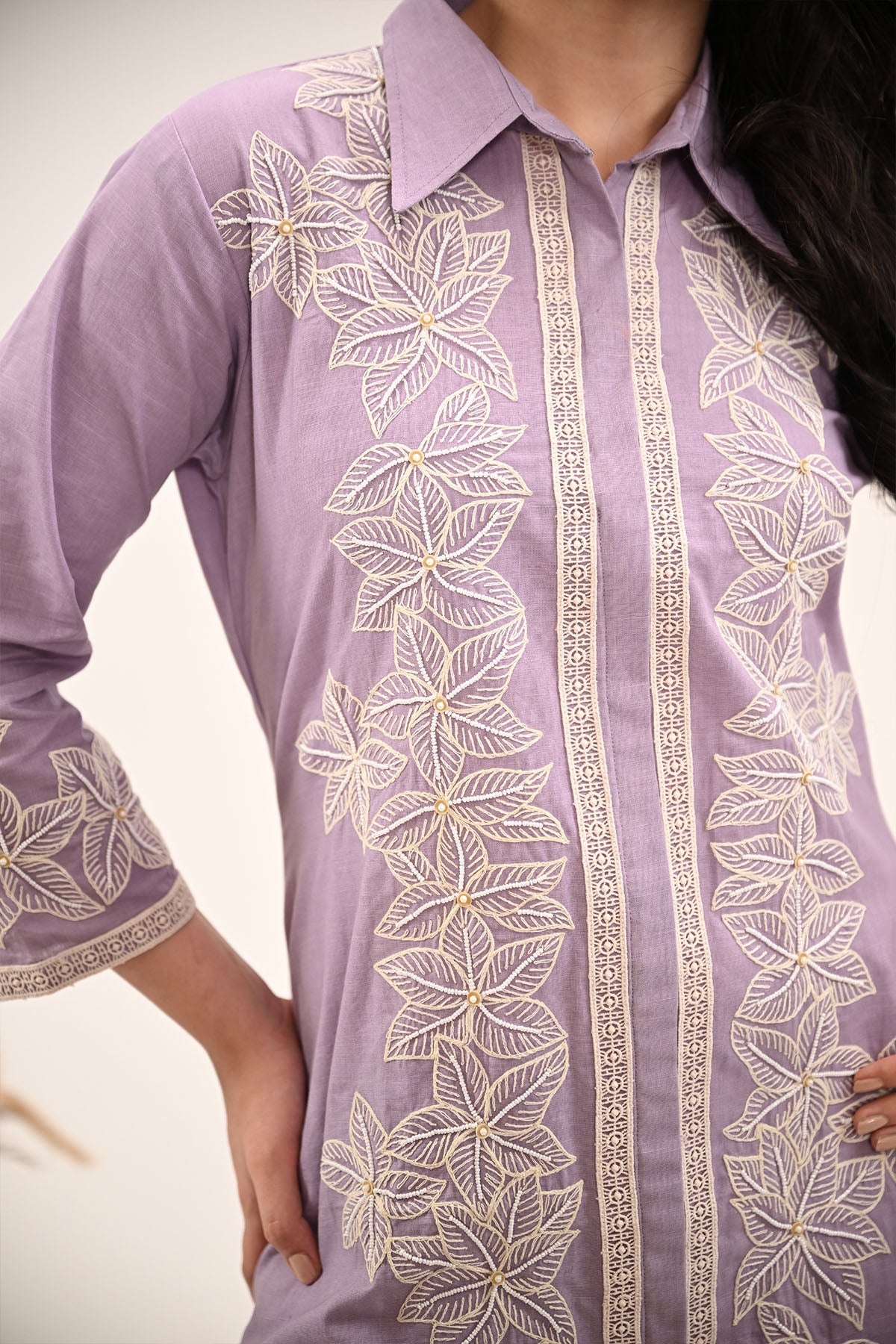 A Lavender Linen coord set with intricate thread embroidery running through the kurta and pant borders. Finished with scalloped sleeves and delicate detailing, it’s a graceful pick for both festive and elevated everyday moments.