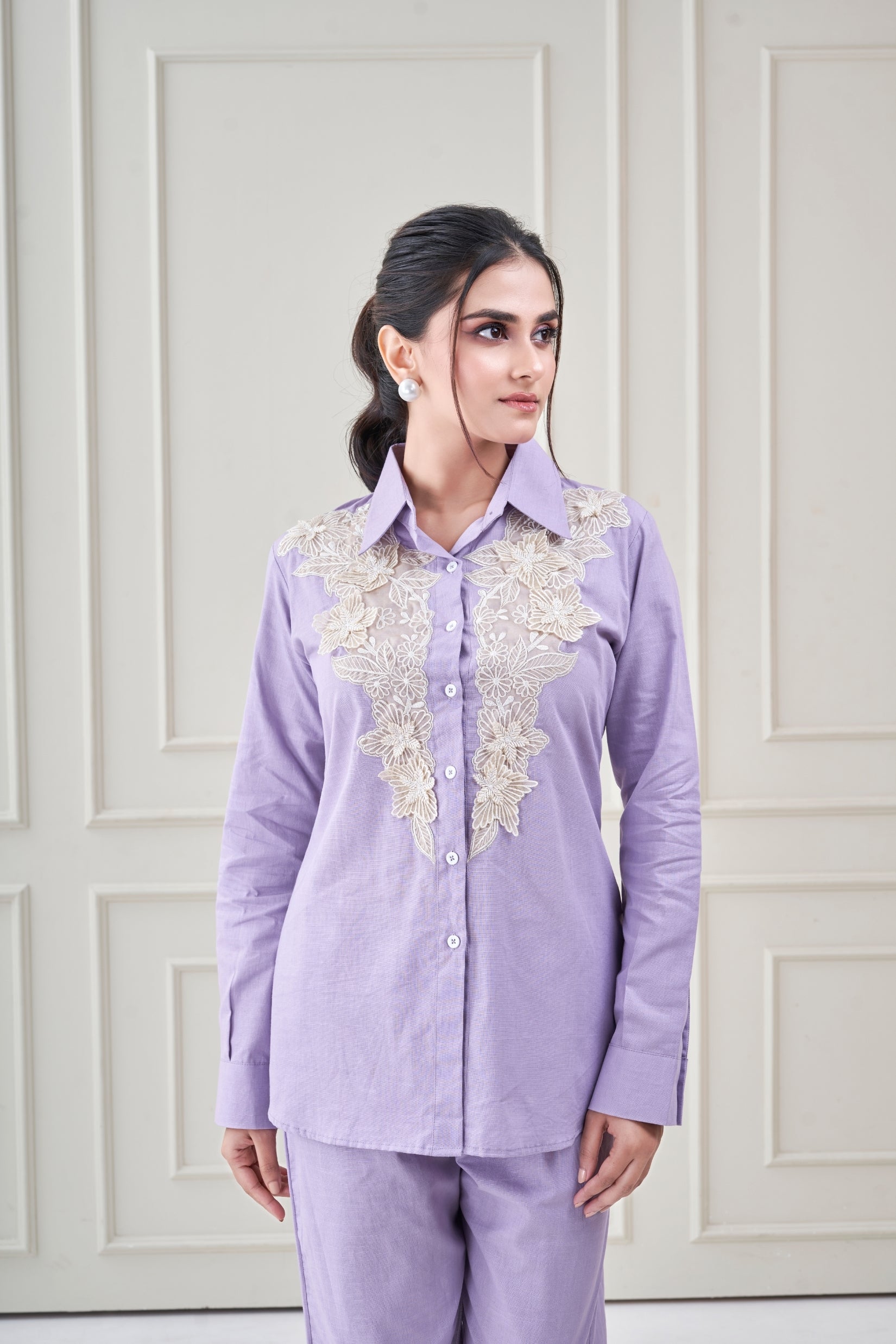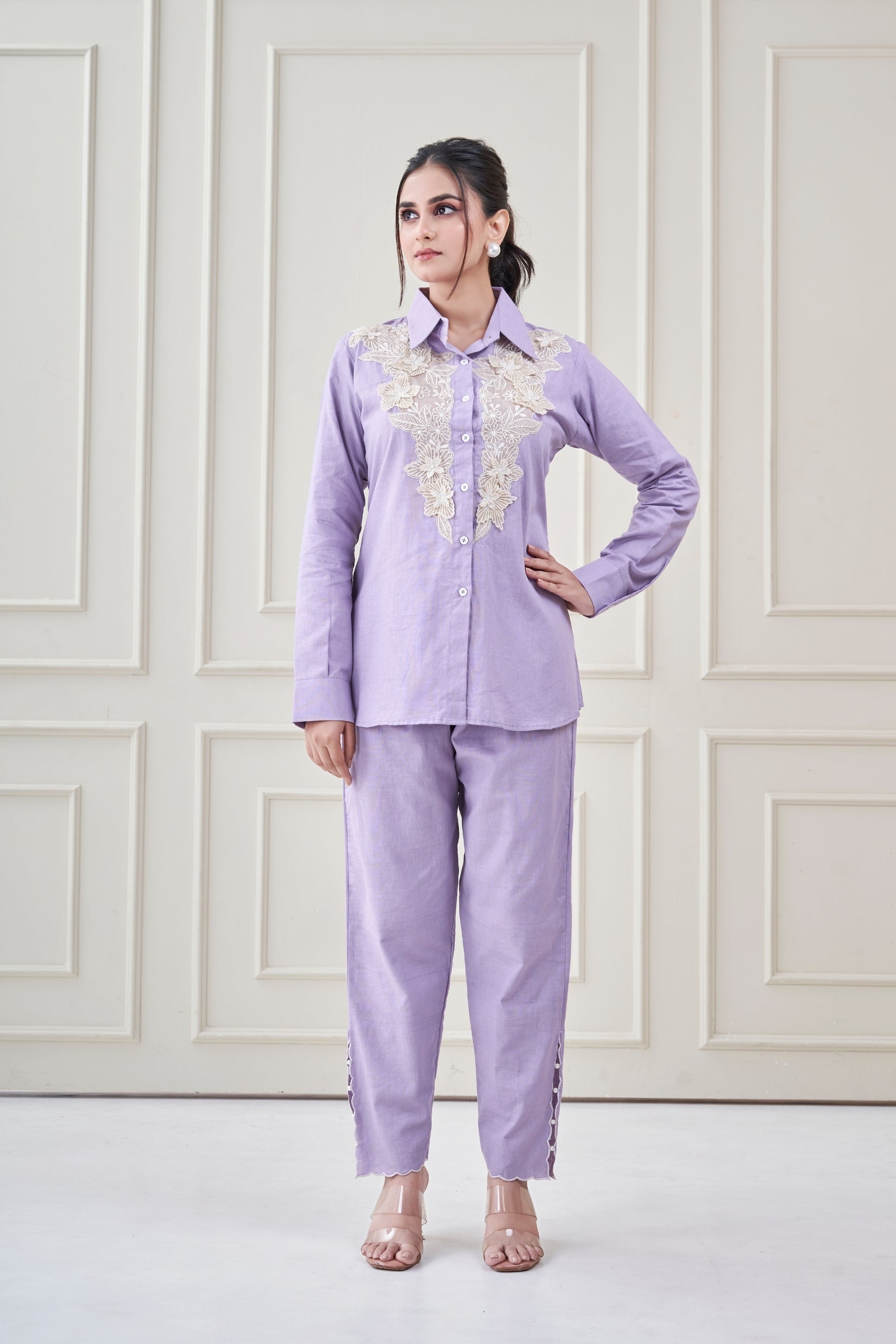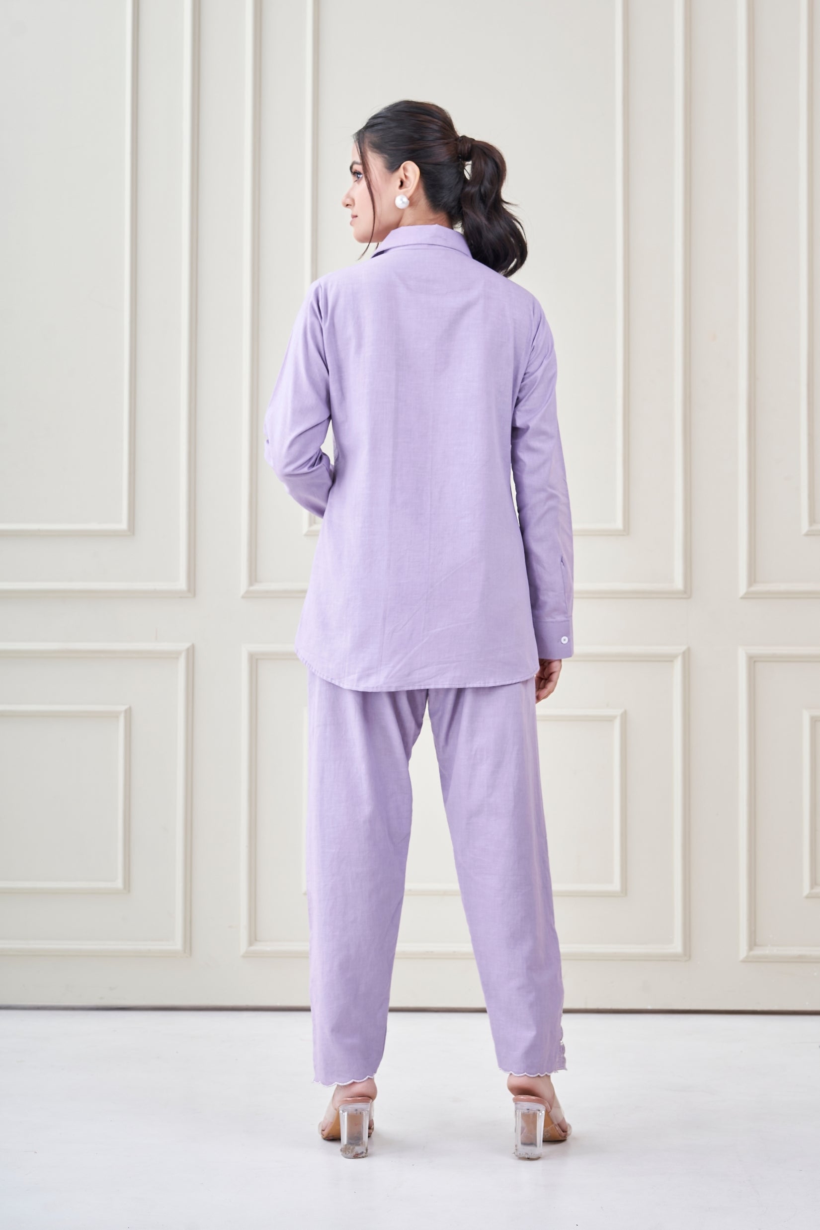 A Lilac linen coord set with intricate thread embroidery running through the kurta and pant borders. Finished with scalloped sleeves and delicate detailing, it’s a graceful pick for both festive and elevated everyday moments.