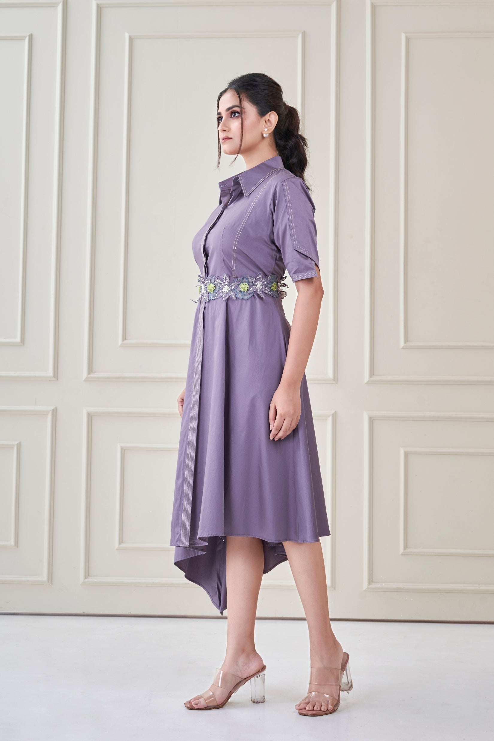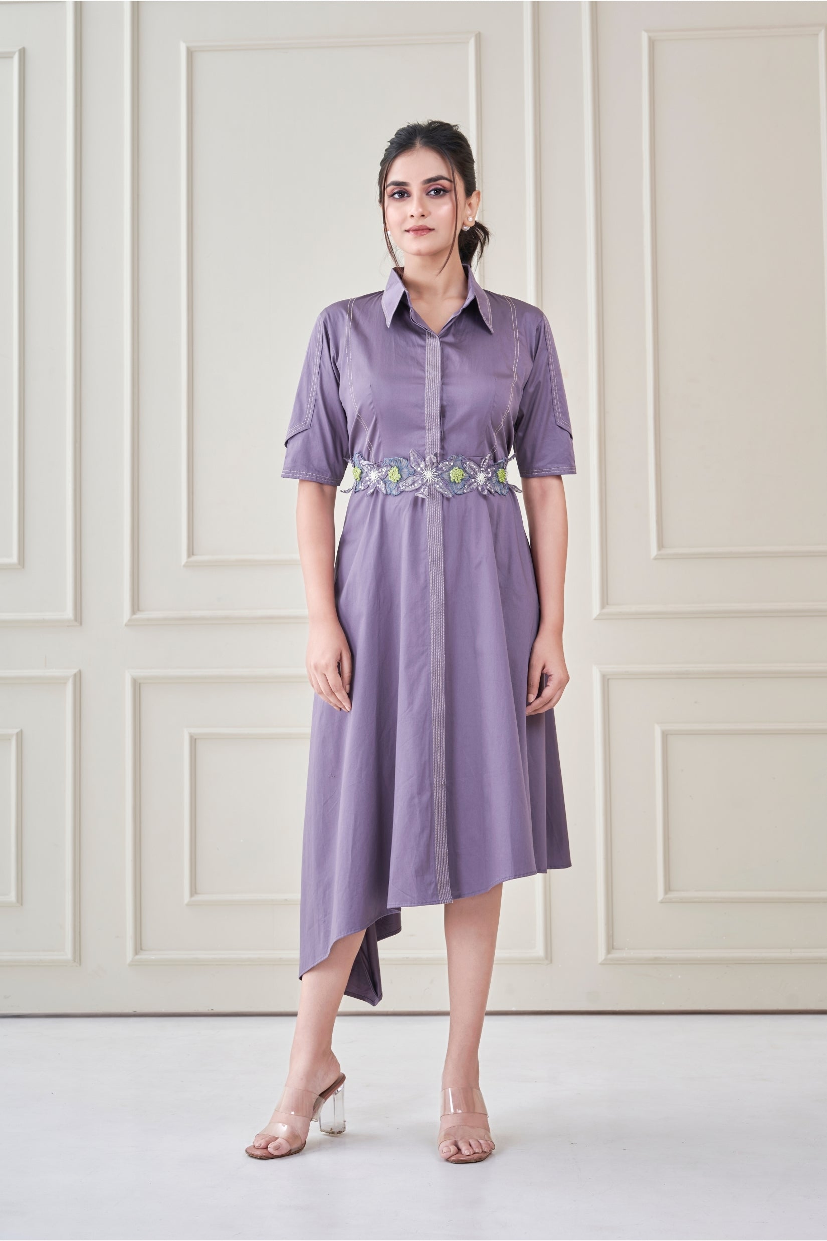 A Mauve shirt dress with an asymmetric hemline, elevated by hand-embroidered floral detailed belt at the waist. Polished yet romantic — made for everyday elegance with a soft statement.