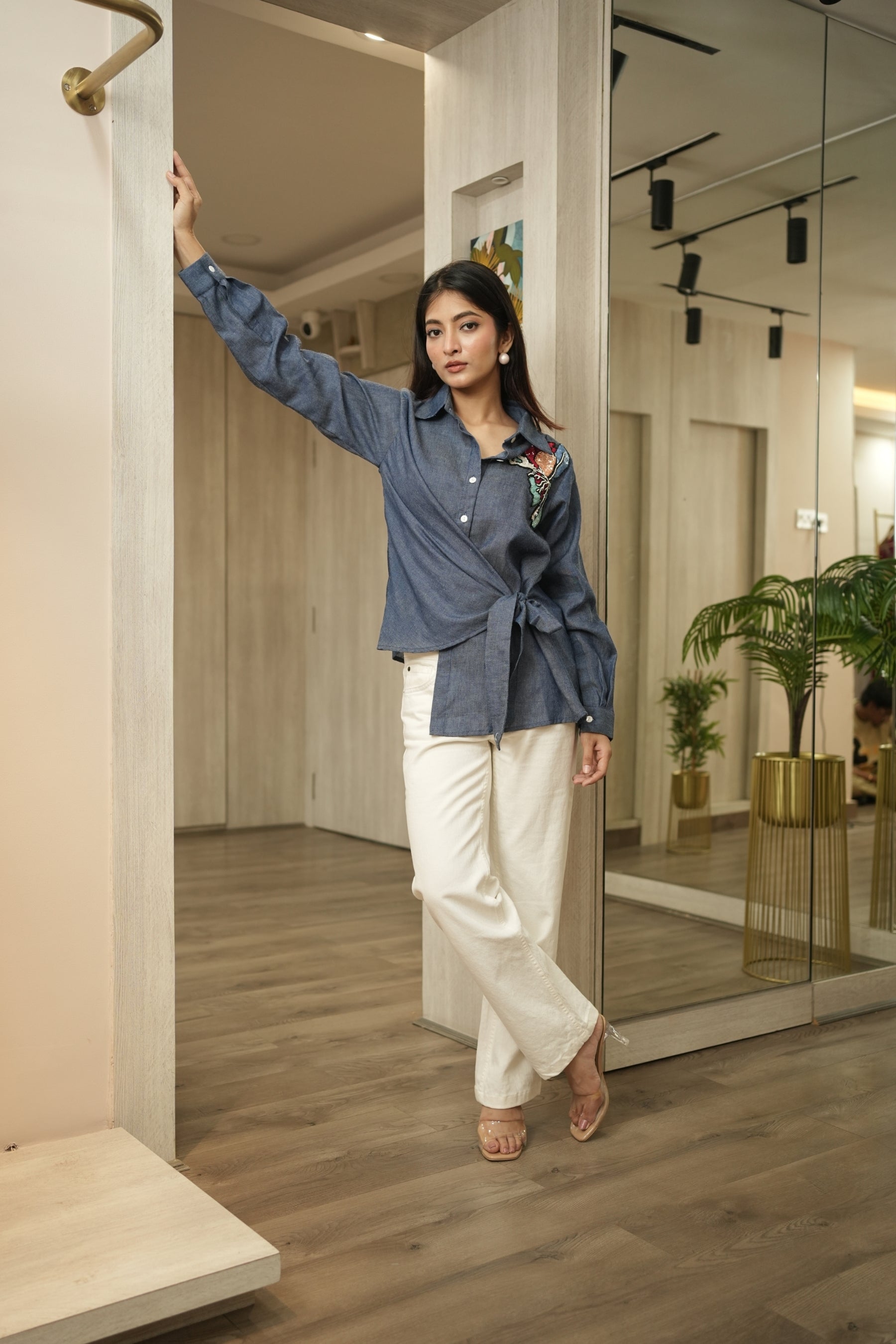 A collared denim-toned wrap shirt with a front-tie waist and floral embroidery on the shoulder. Designed in breathable soft denim with a structured silhouette — this piece blends polish with play, perfect for power lunches or gallery strolls.