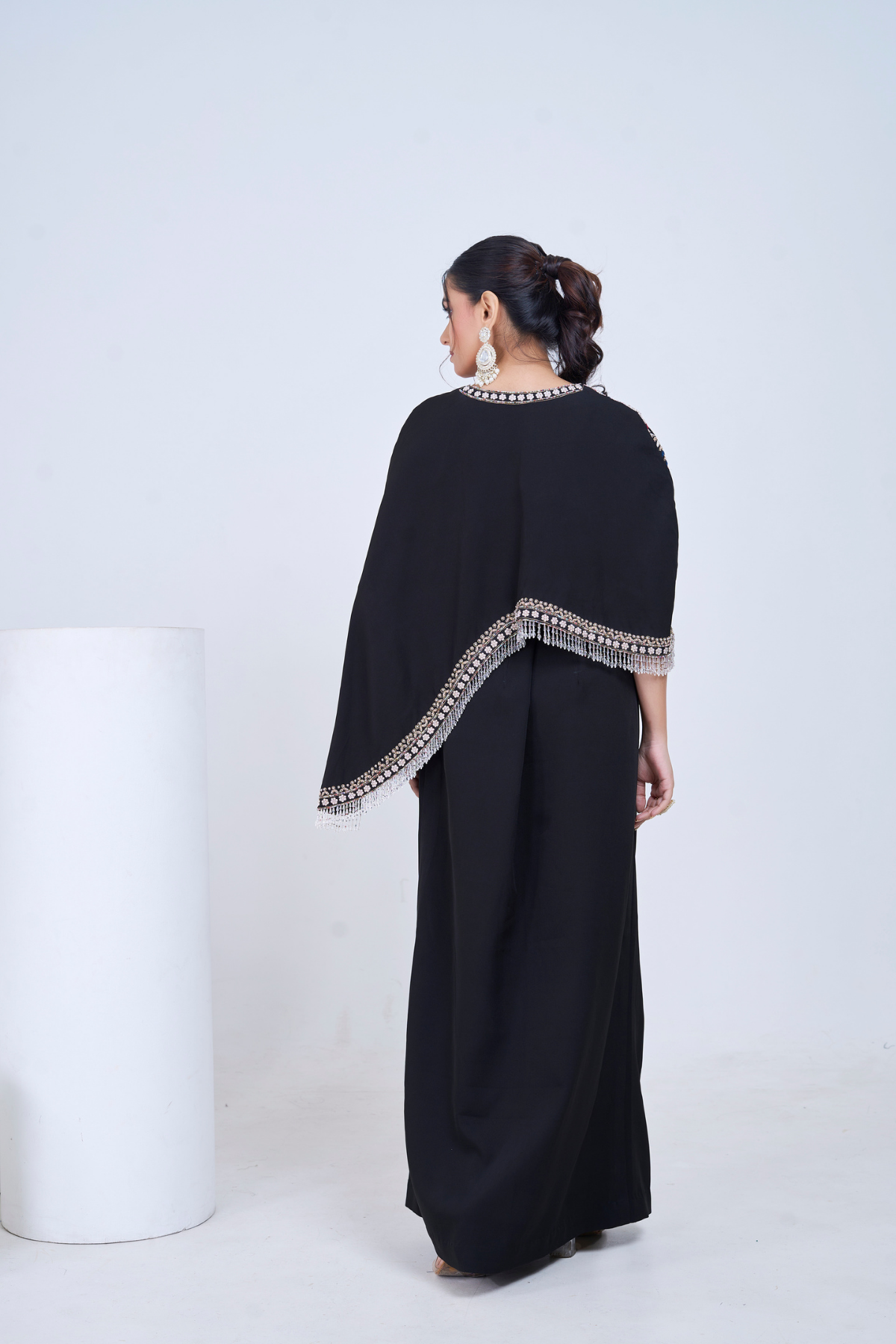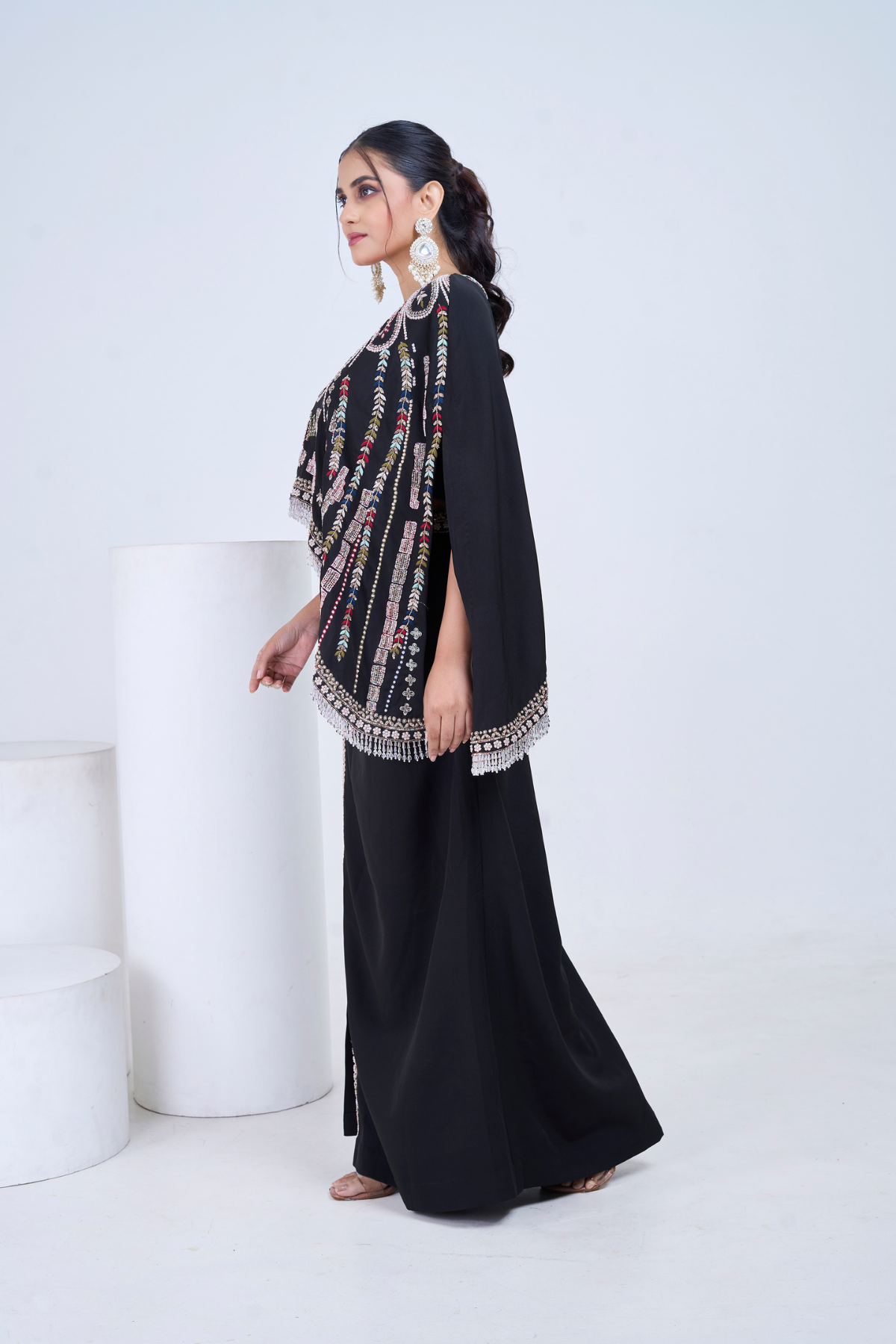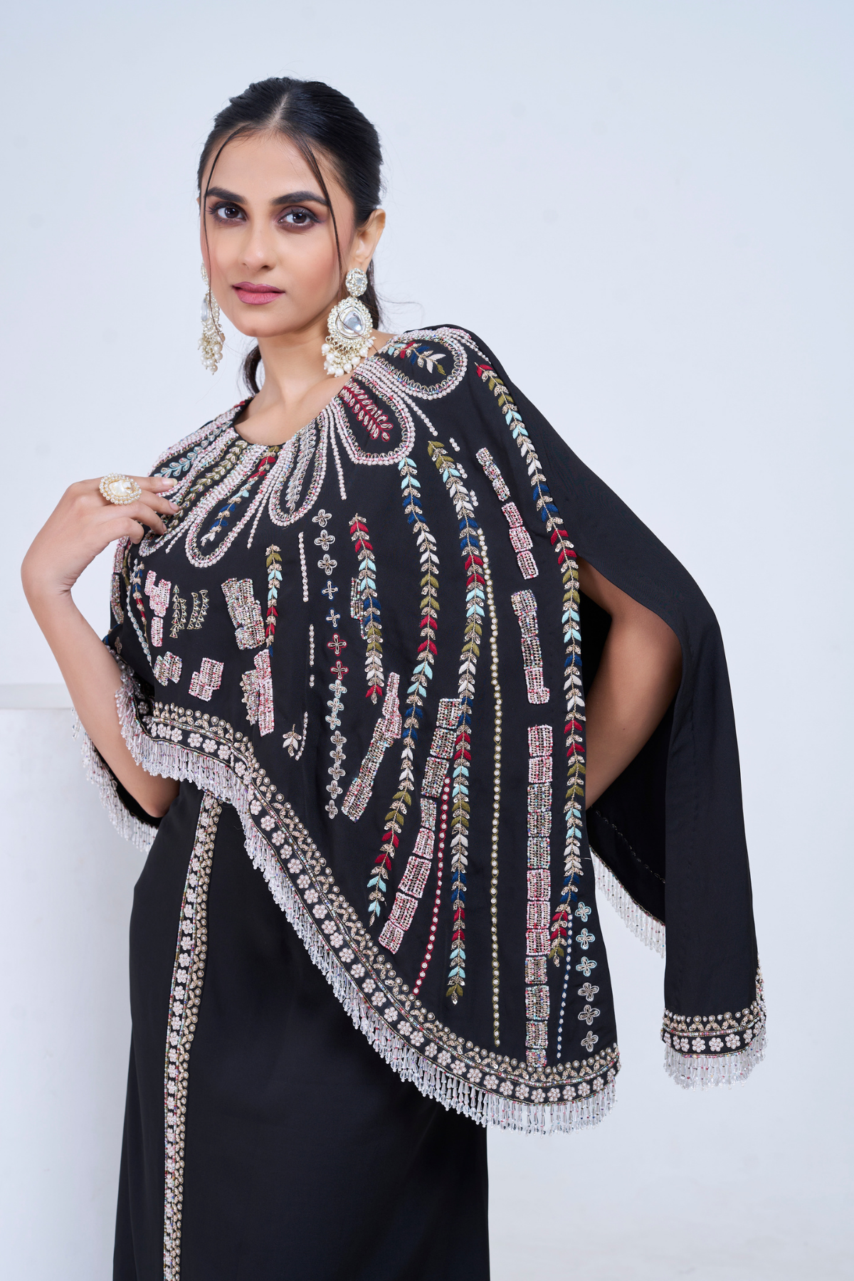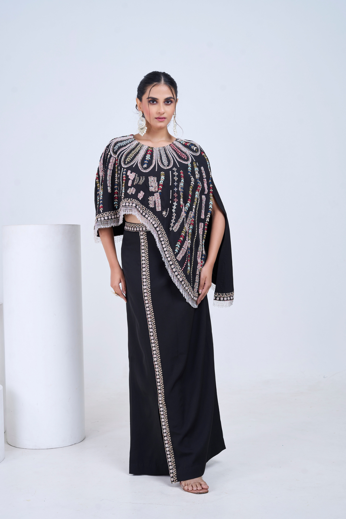 An unapologetically bold black co-ord set that commands attention. The top is crafted in an asymmetric cape silhouette, richly hand-embellished with intricate threadwork and mirror accents in mosaic-inspired motifs. Tasselled edging adds playful movement, while the skirt with coordinated embroidery keep the ensemble sleek yet celebratory. Think statement evenings, cocktail weddings, or artful soirées — this one is not for the faint-hearted.
