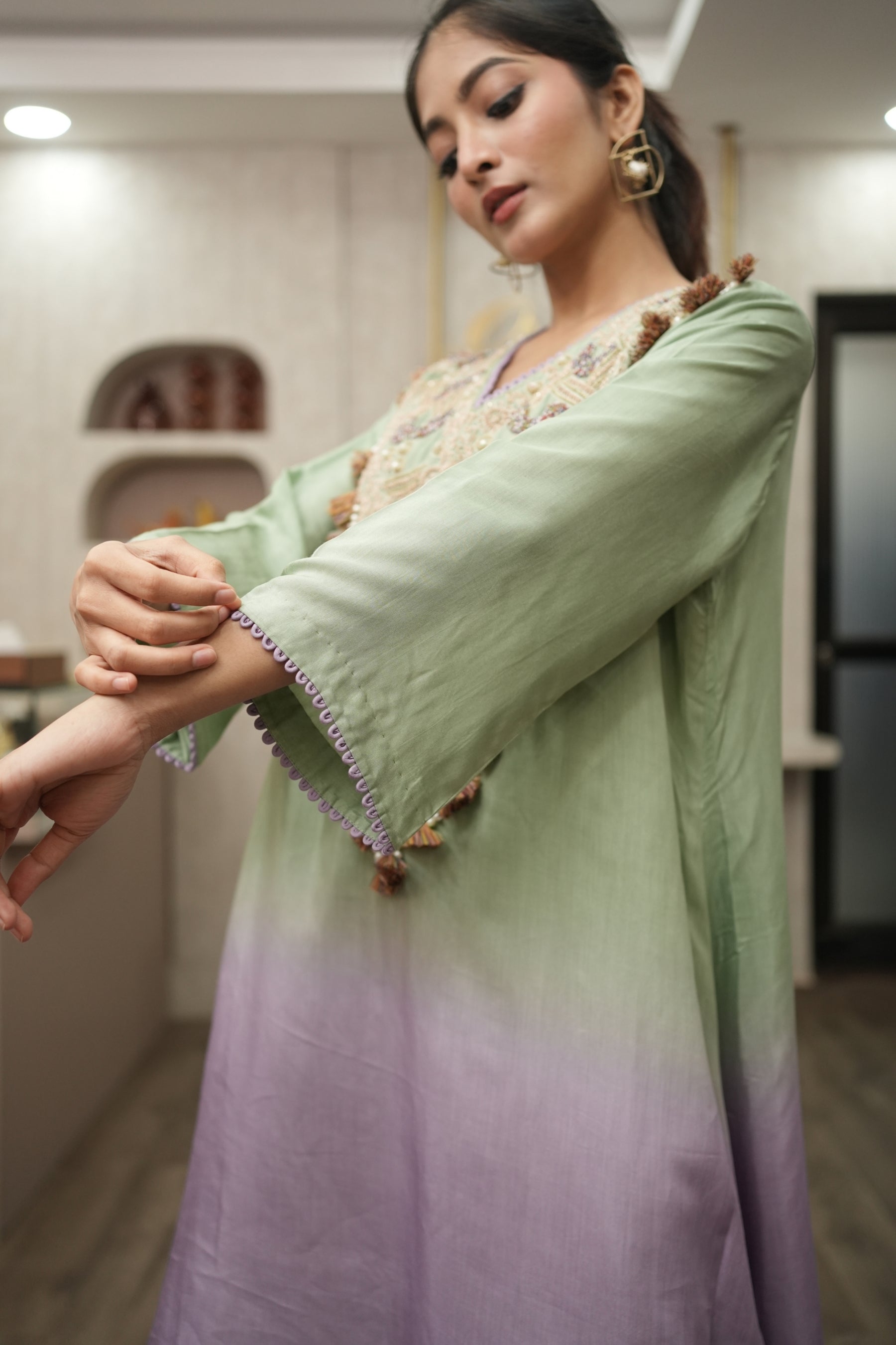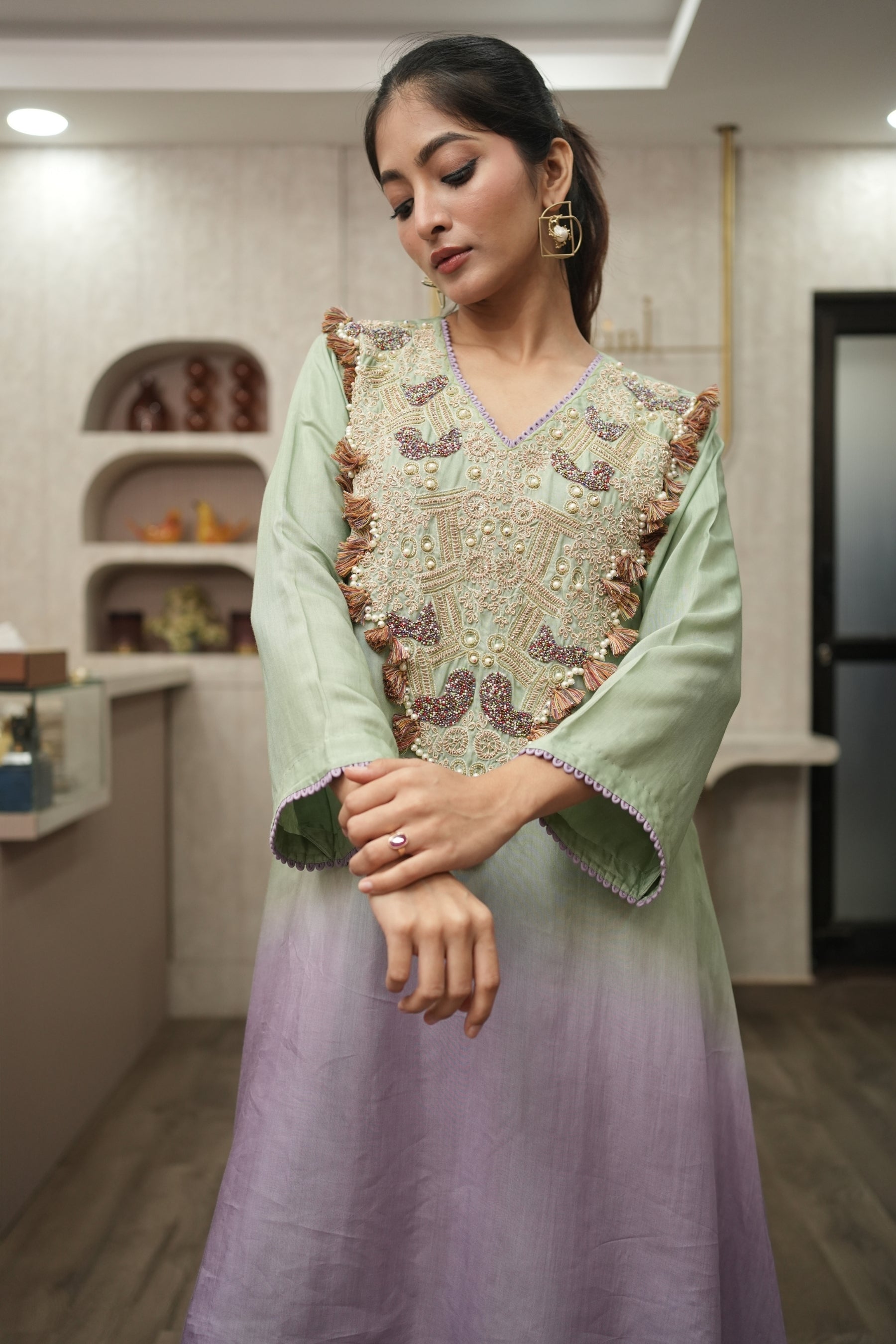 A pastel ombré kurta set with intricate light-gold embellishment and scalloped tulip pants. Its soft mint and lilac tones make it a dream pick for intimate celebrations or day weddings.