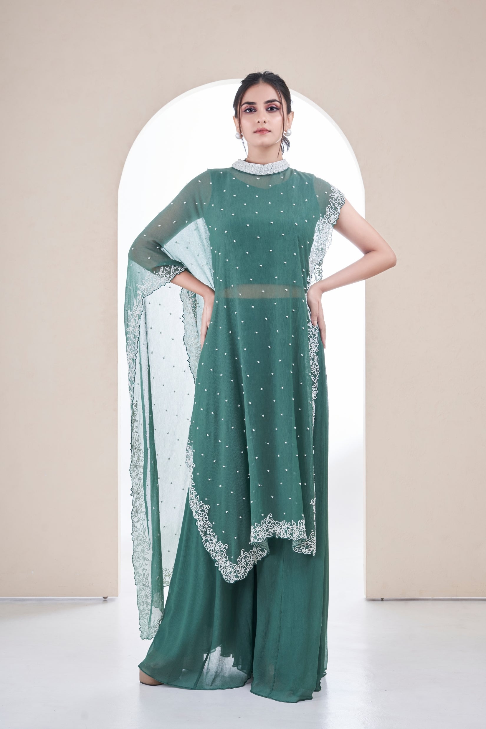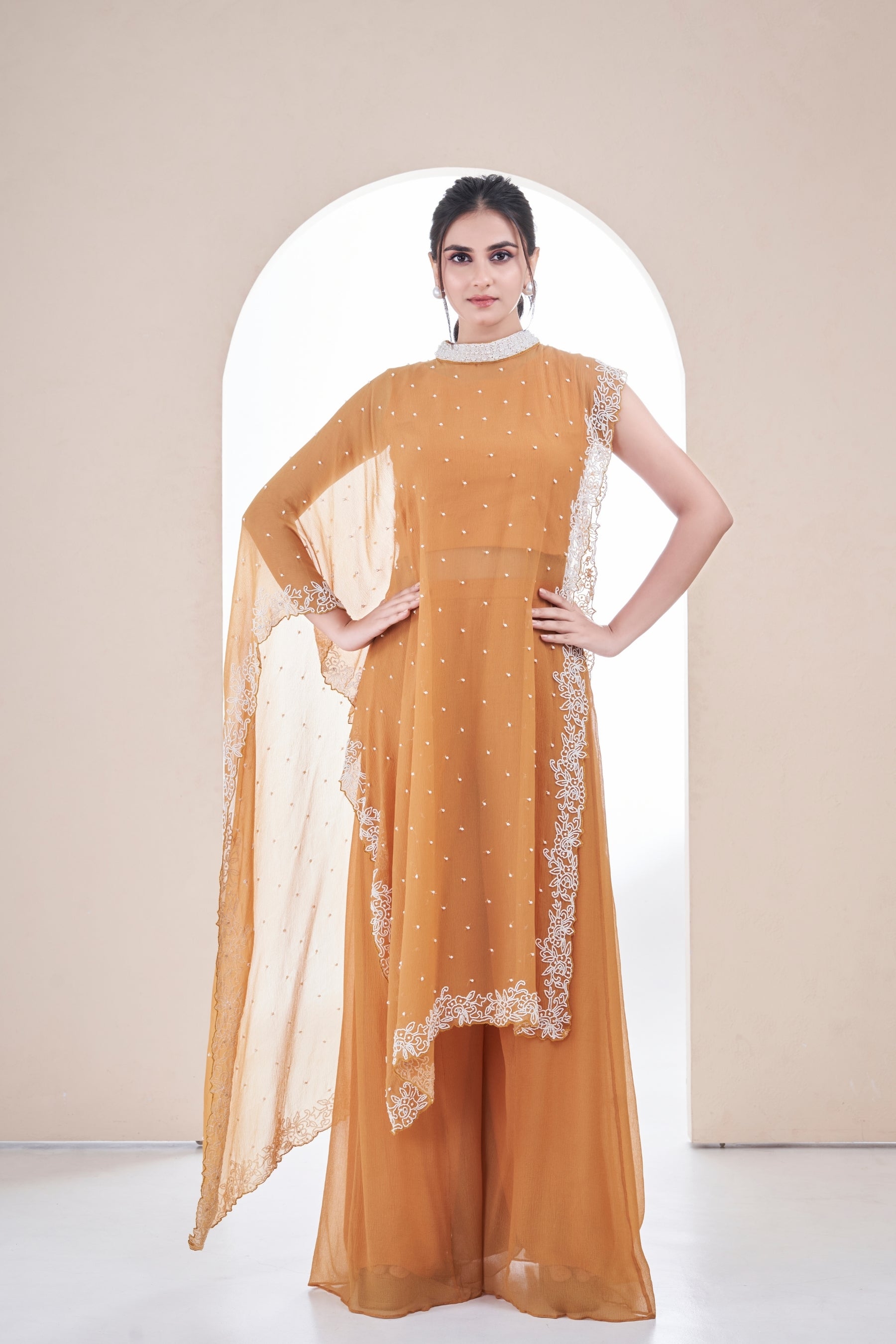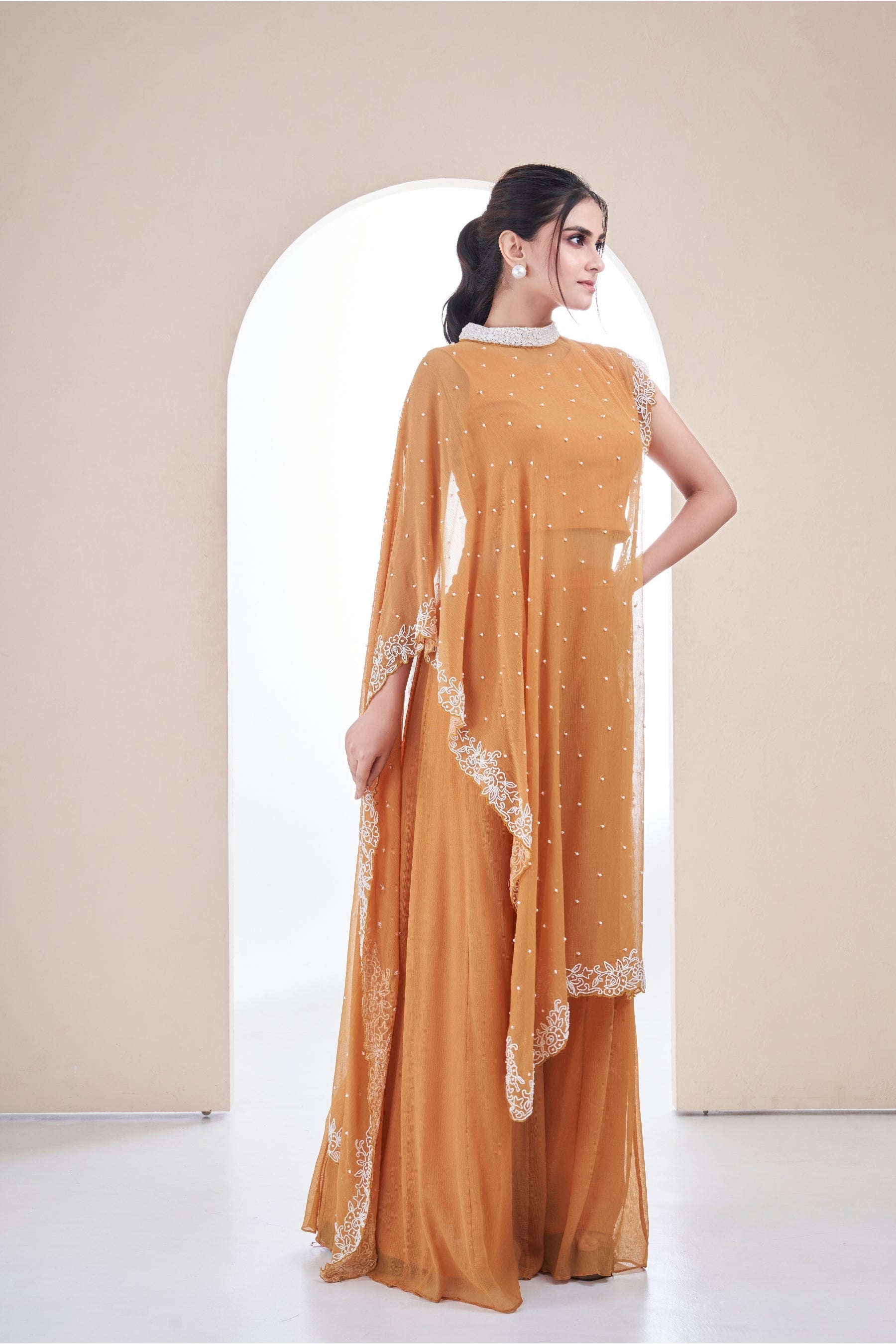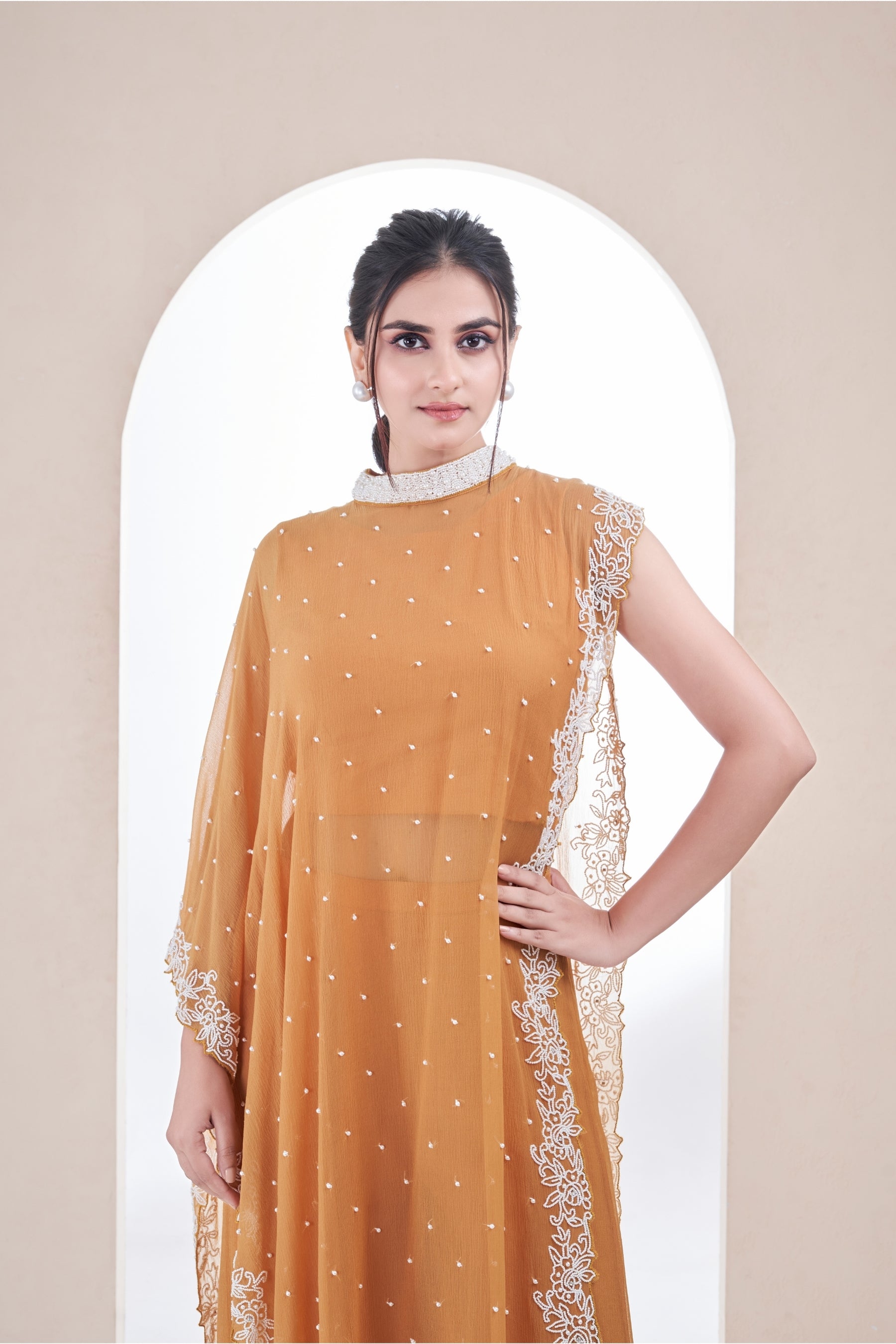 A mustard yellow set with flared palazzos, a high-neck blouse, and a pearl-scattered dupatta style cape finished with intricate scallop pearl embroidery. Elegant, fluid, and luminous — made for golden-hour celebrations.