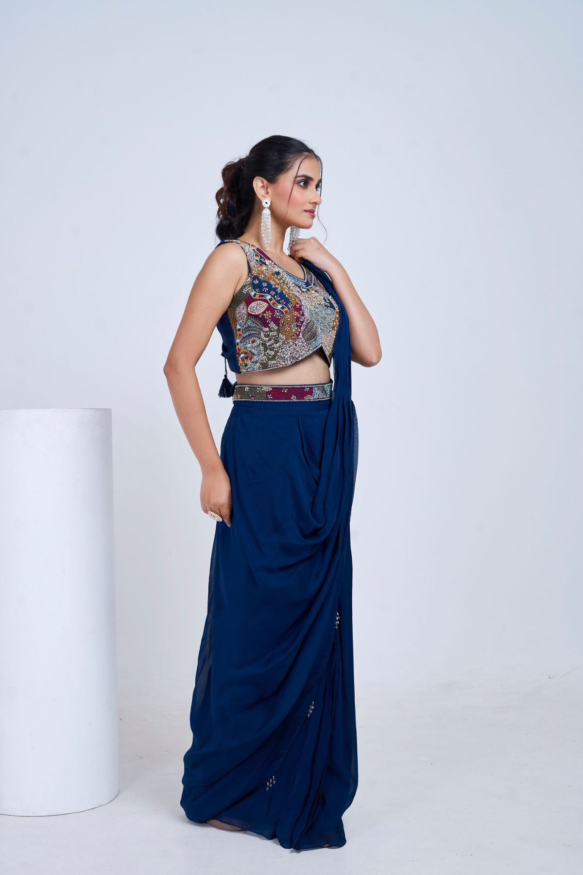 A dramatic navy draped saree paired with a fully embellished blouse, featuring a hand-embellished belt detail that cinches the waist with elegance. Rich in colour, texture, and movement — designed for the modern celebration where tradition meets effortless glam.