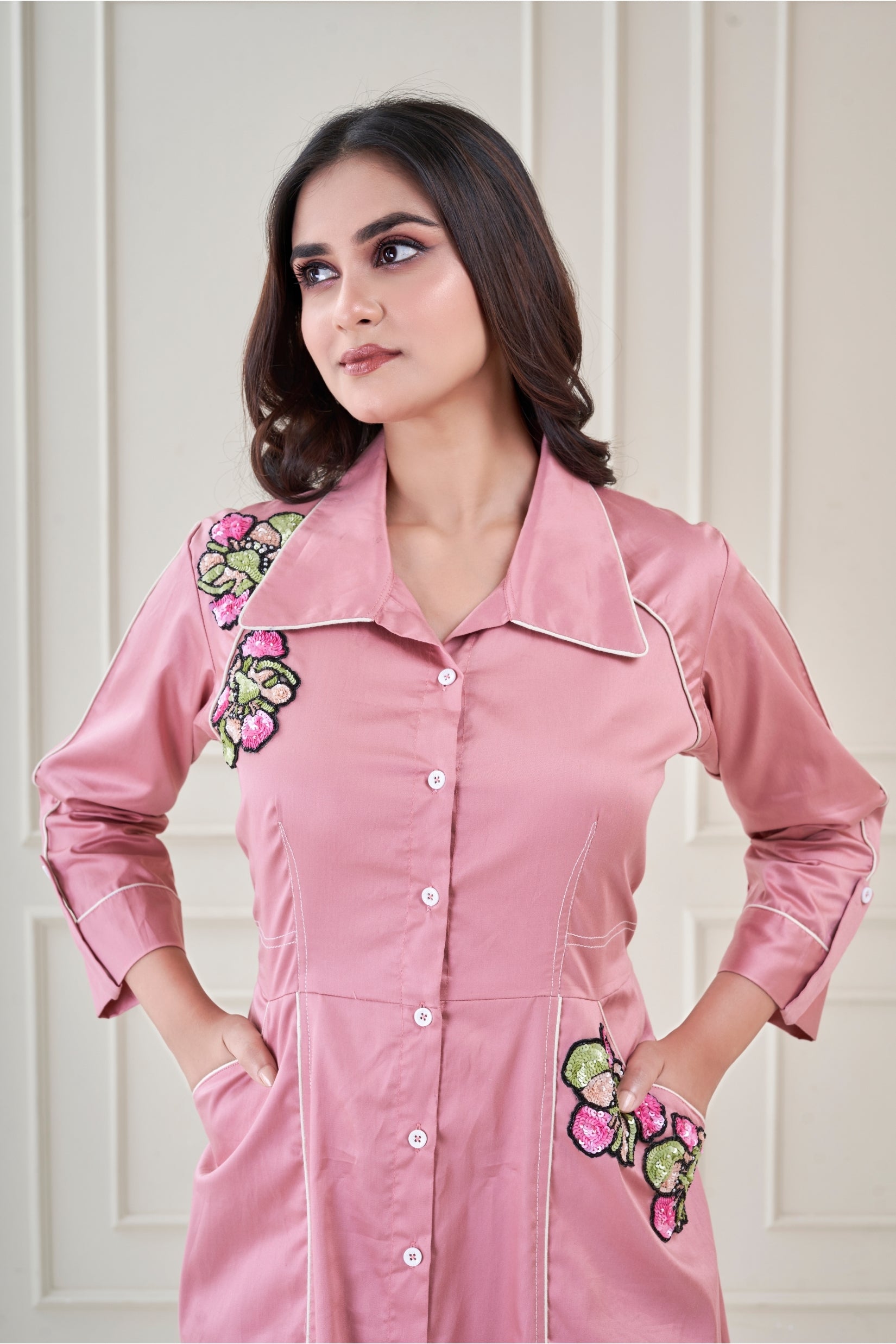 Crafted in rich cotton, the sienna Dress is a timeless shirt dress silhoutte elevated with hand embroidered floral details. Contrast piping and a full button down front add tailored charm.