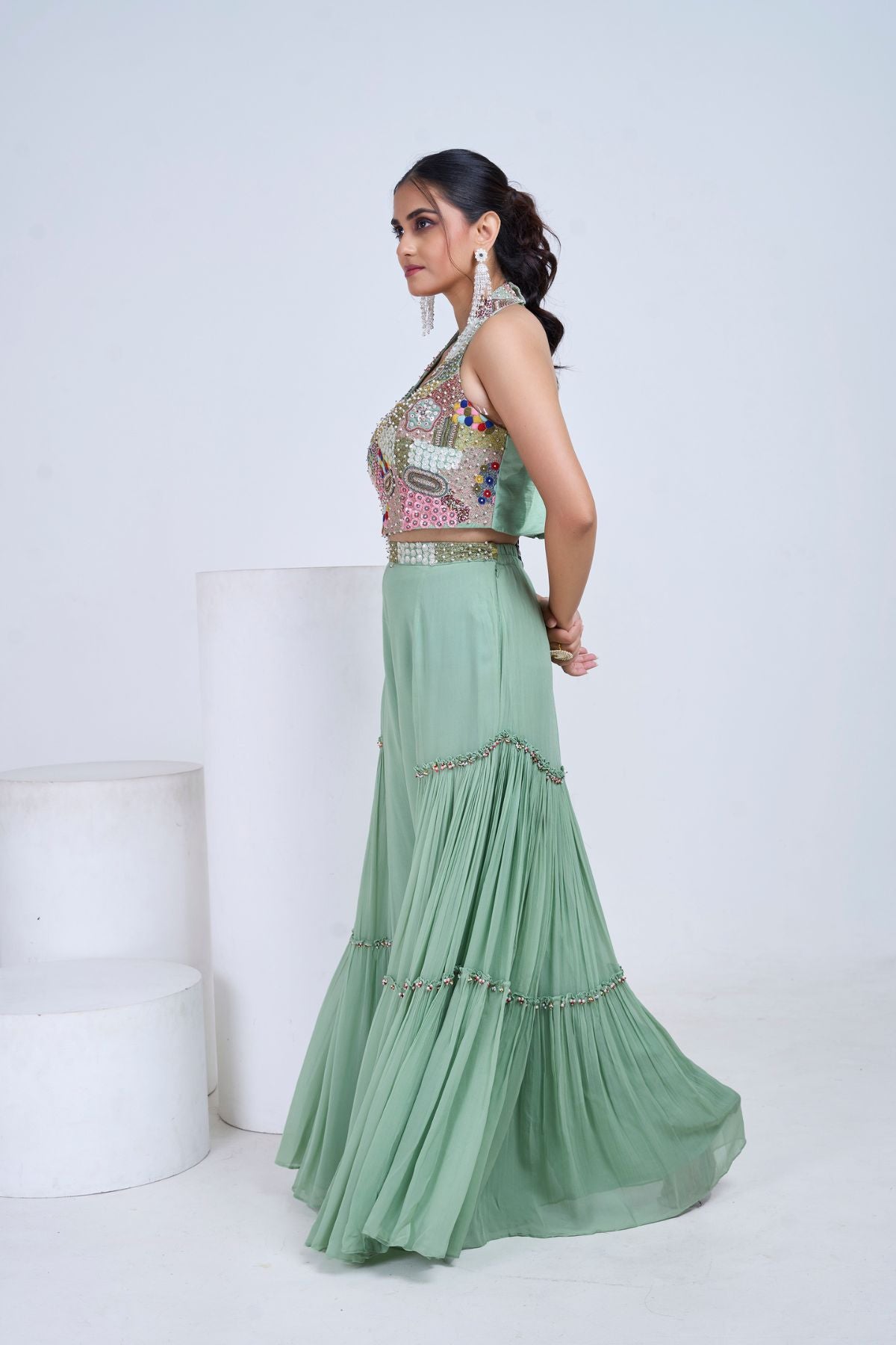 A playful nod to bohemian glam — this pistachio green co-ord set features fluid pleated palazzos with delicate beadwork at the tiers. Paired with a halter embroidered blouse in multicoloured thread and patch embellishments, this piece celebrates colour, craft, and carefree movement. Style it with statement earrings and soft waves for a festive brunch or mehendi soirée.