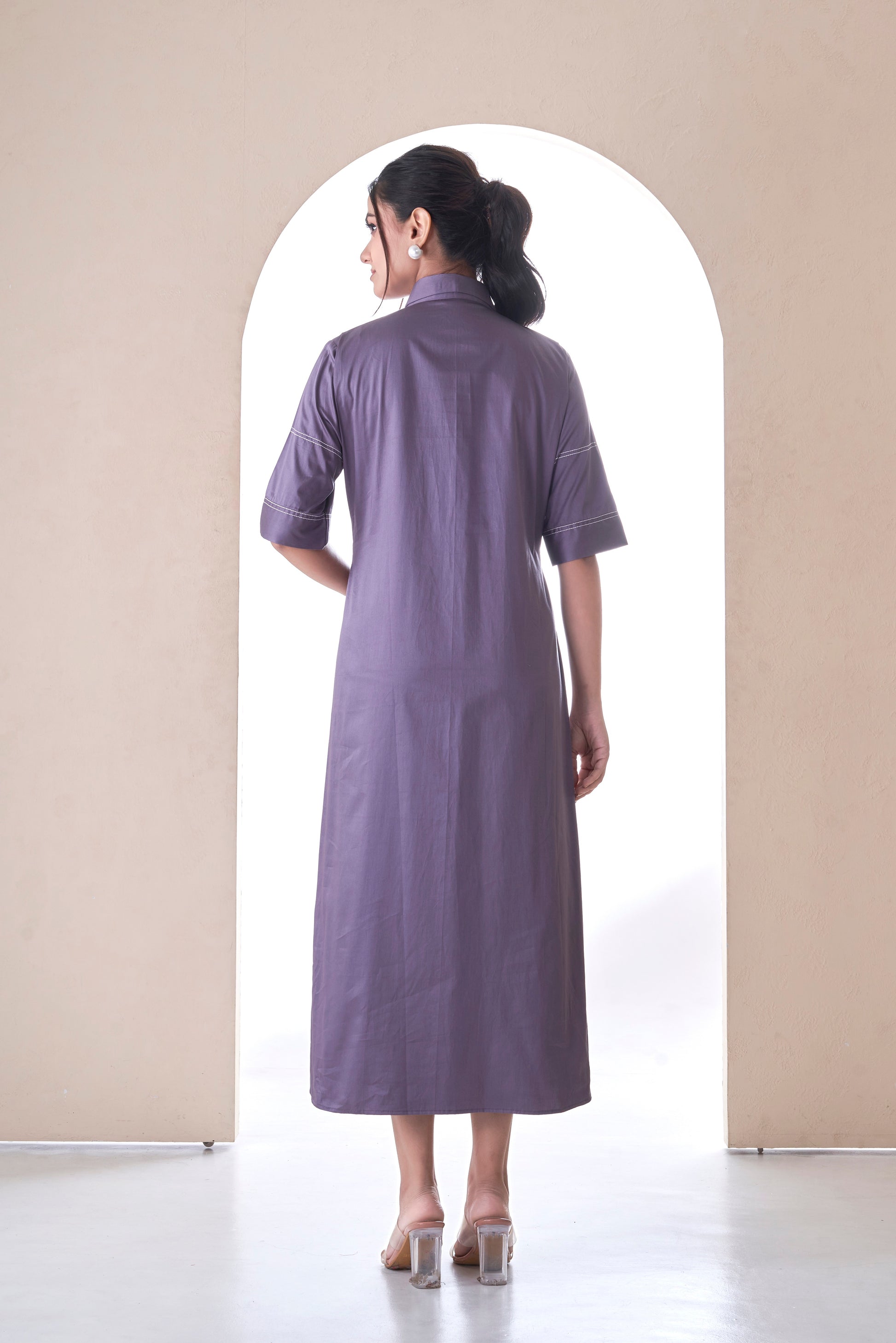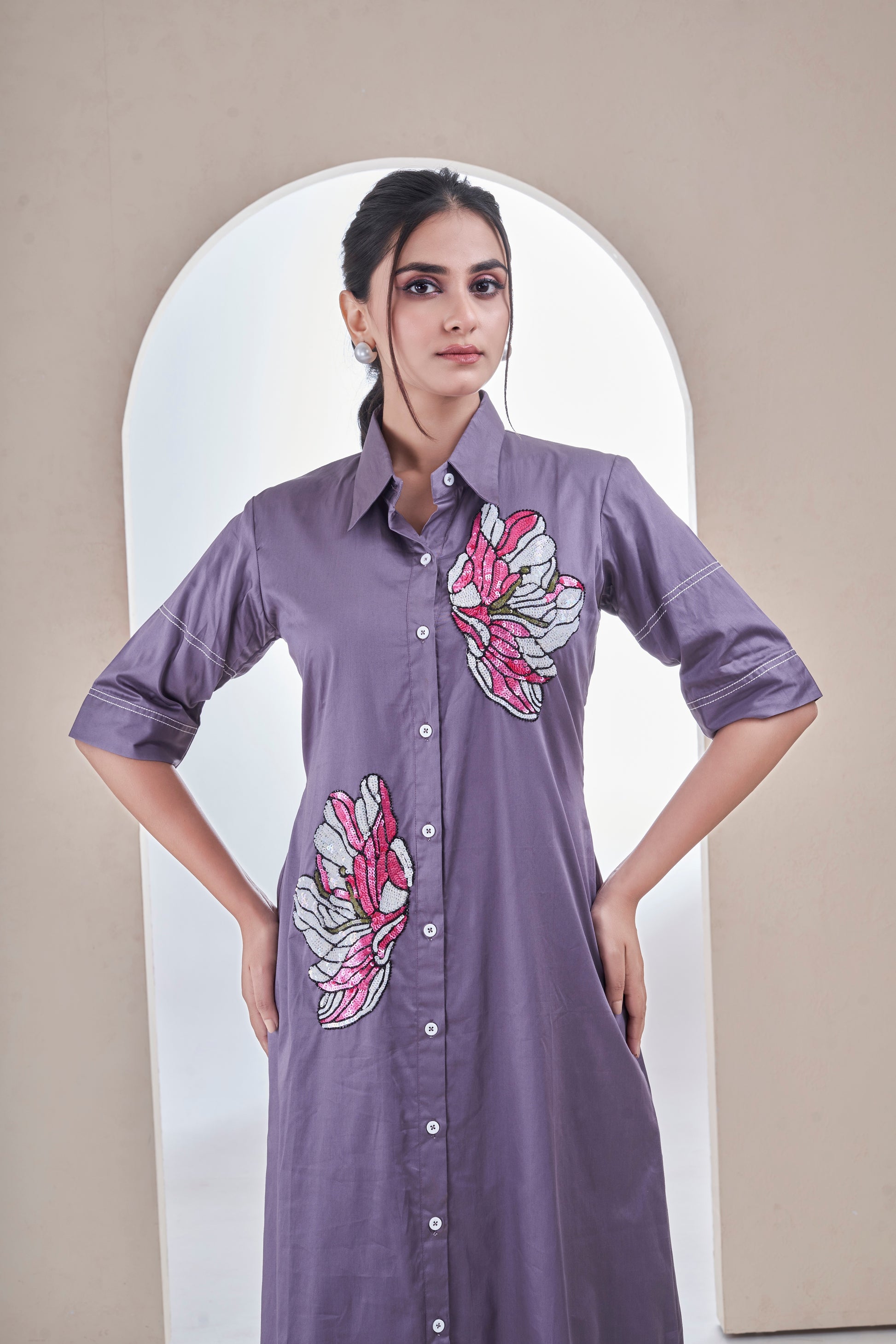 A relaxed shirt dress in purple , featuring bold floral embroidery in hand-sketched style. An easygoing yet elevated piece that blends comfort with color.