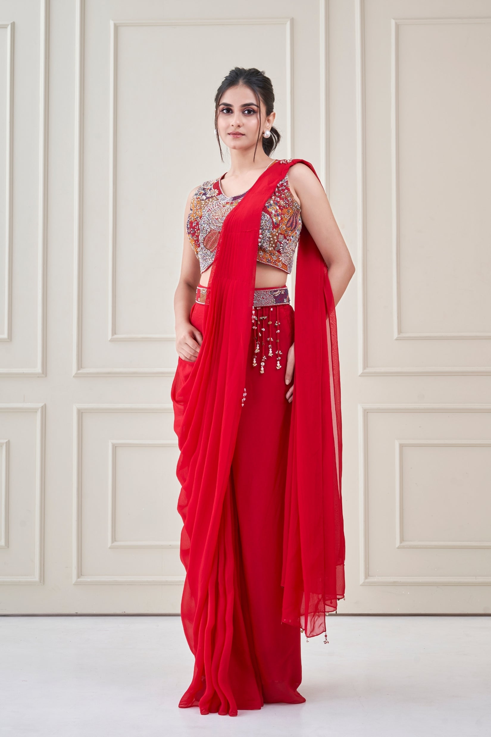 A dramatic red draped saree paired with a fully embellished blouse, featuring a hand-embellished belt detail that cinches the waist with elegance. Rich in colour, texture, and movement — designed for the modern celebration where tradition meets effortless glam.
