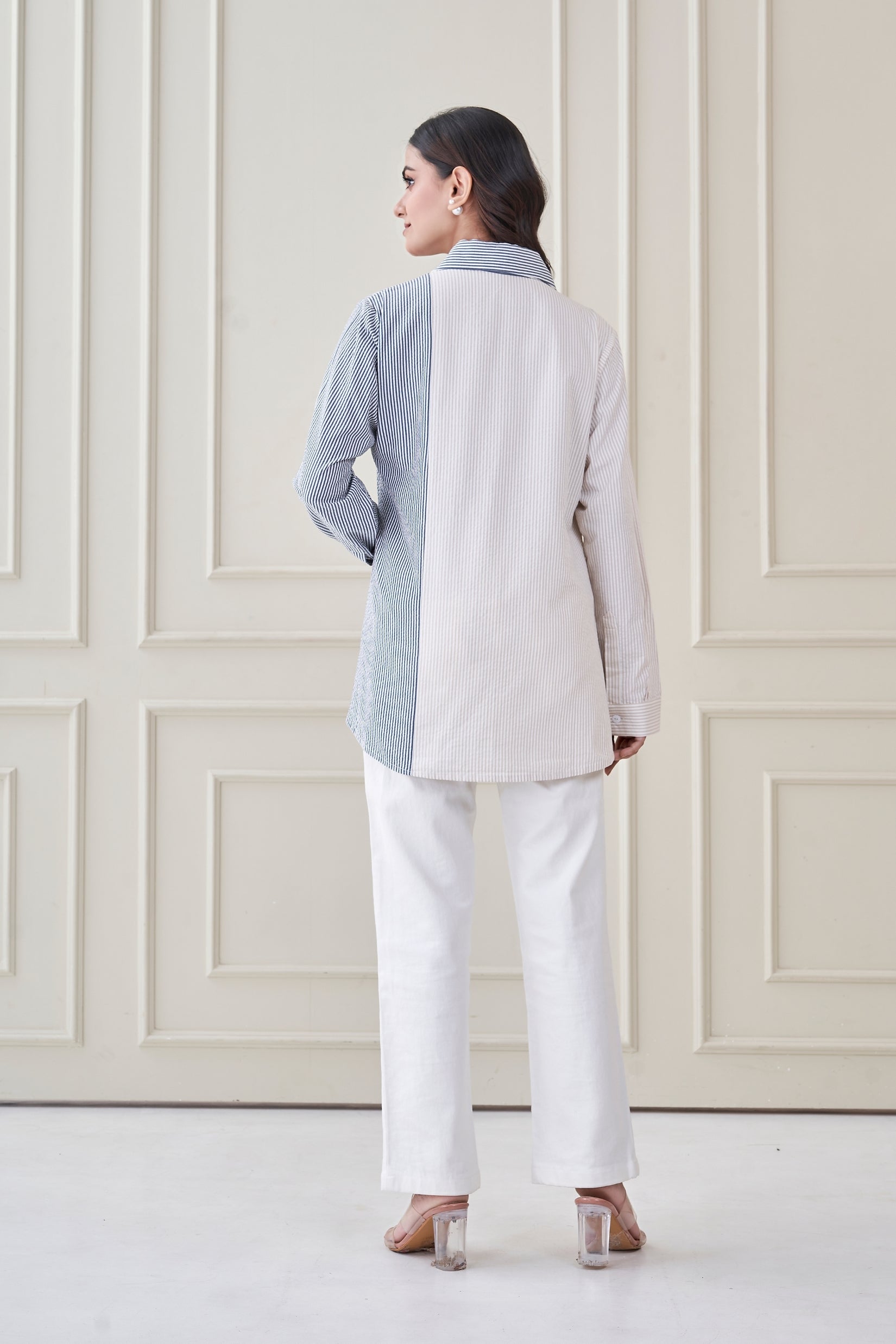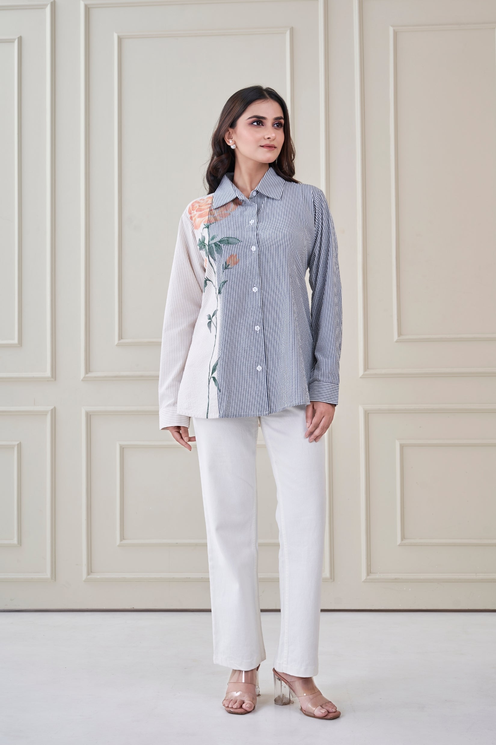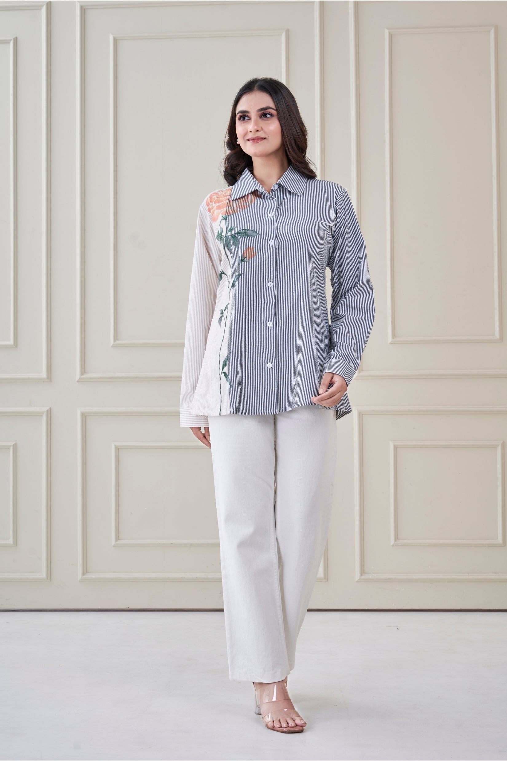 A dual pinstripe cotton shirt hand- painted with a soft rose motif. The blend of structure and artistry makes it a standout for slow, statement dressing