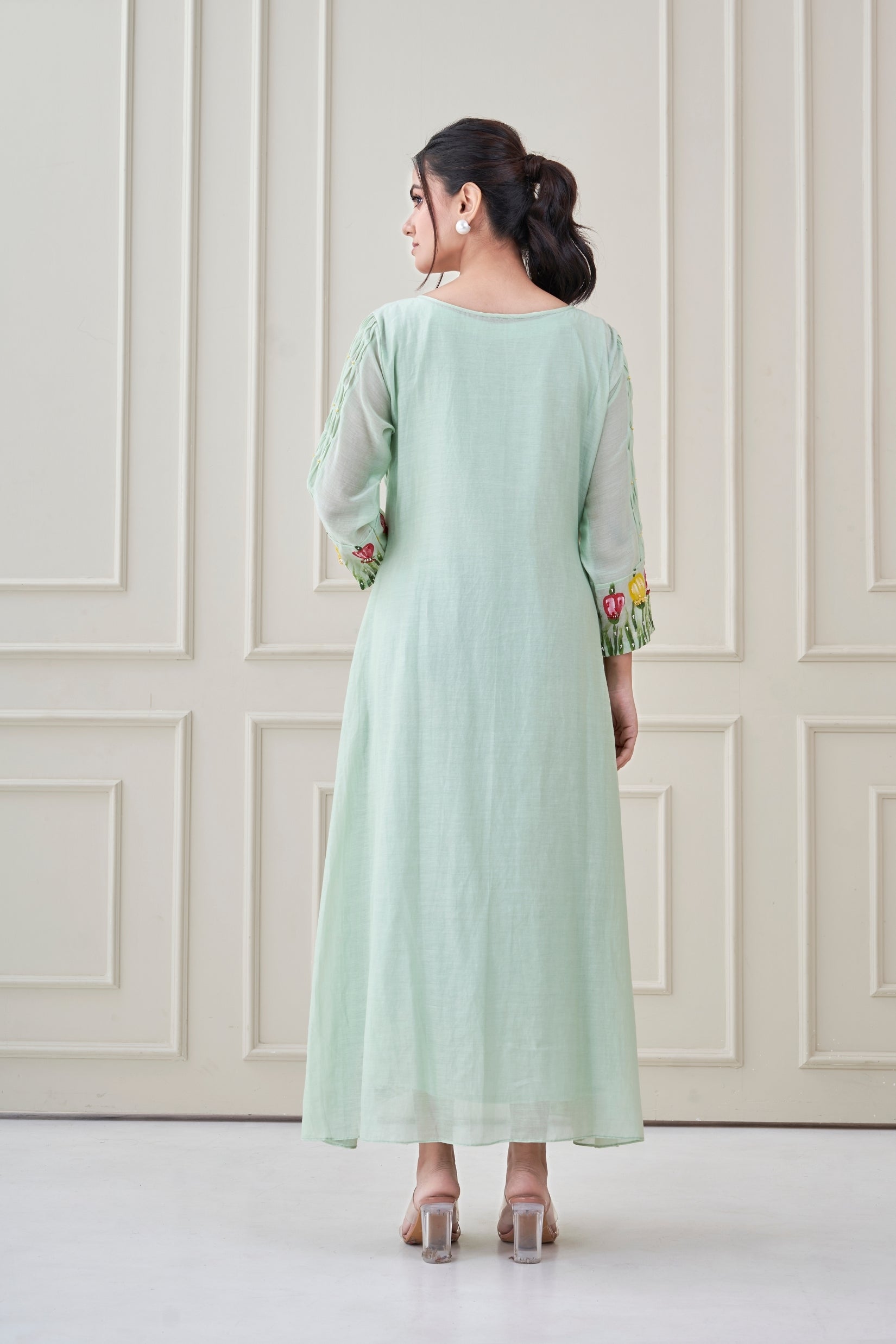 A sea green dress featuring a hand-smocked bodice and whimsical hand-painted wildflowers across the hem and sleeves. Light, airy, and joyfully detailed — perfect for springtime celebrations or dreamy daywear.