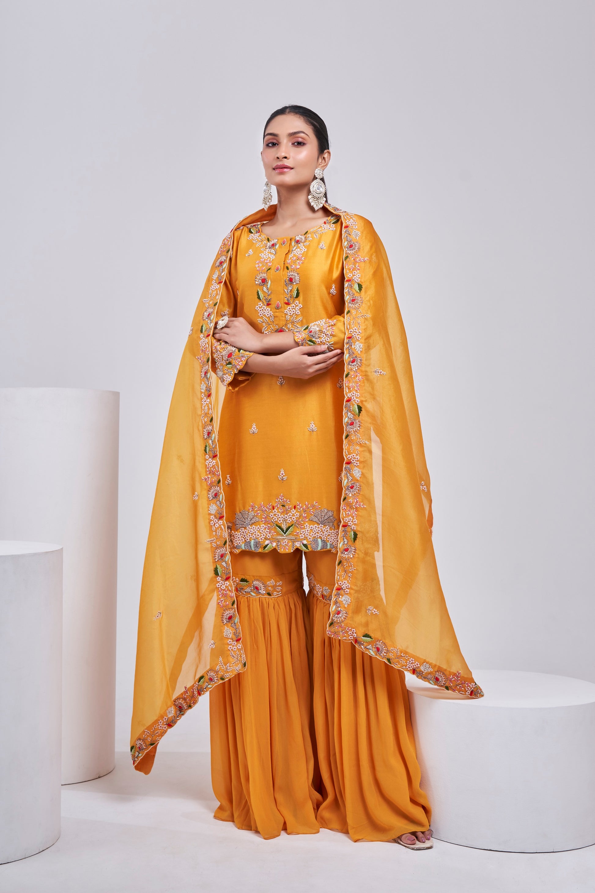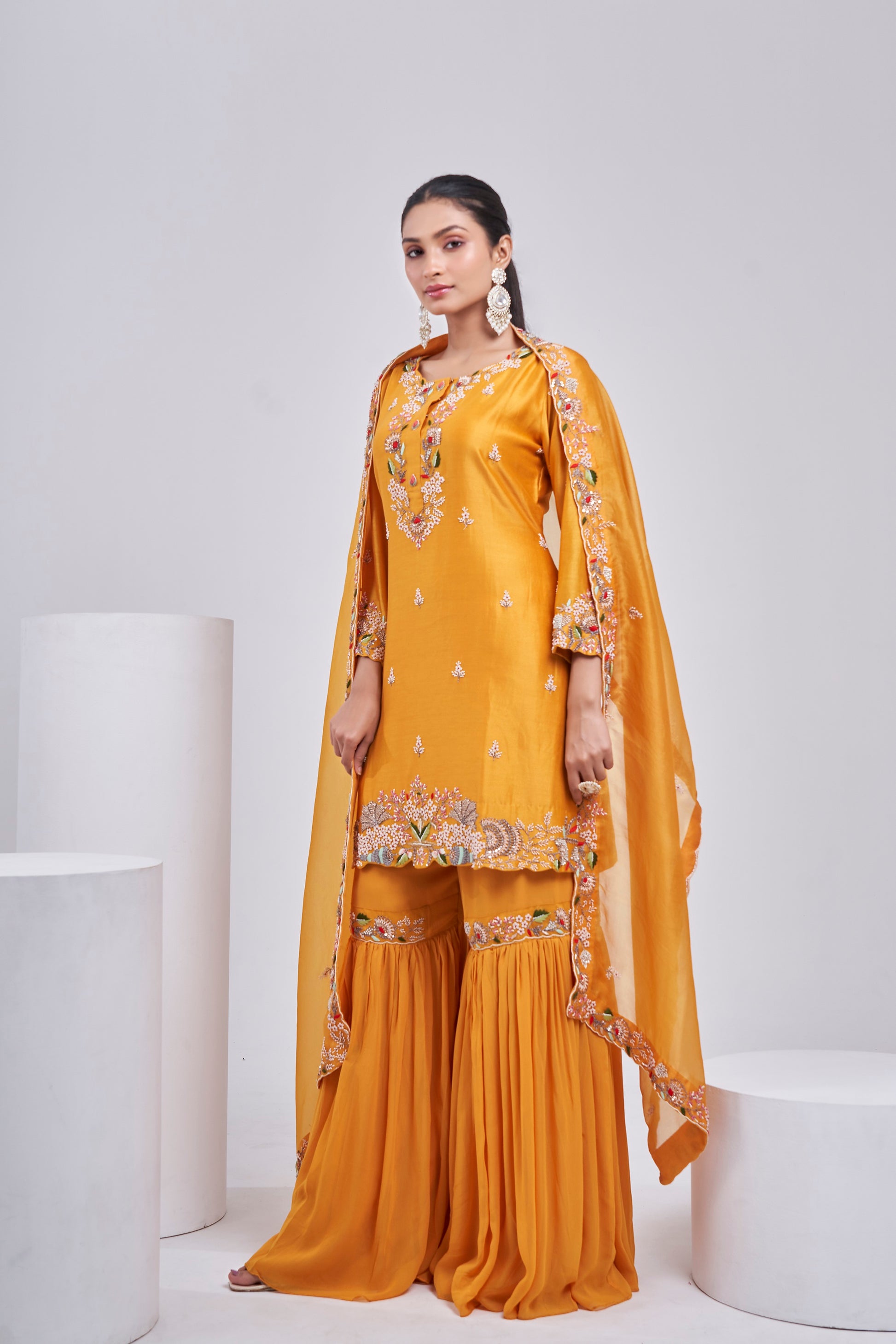 Rooted in rich heritage, Sunheri Baagh is a regal three-piece ensemble in a vibrant mango that captures the charm of heirloom craftsmanship. The kurta features intricate embroidery ,paired with a voluminous sharara and a soft organza dupatta adorned with delicate borders and scattered butis. A perfect pick for festive luncheons, mehendi gatherings, or weddings — this set is where tradition meets timeless elegance.