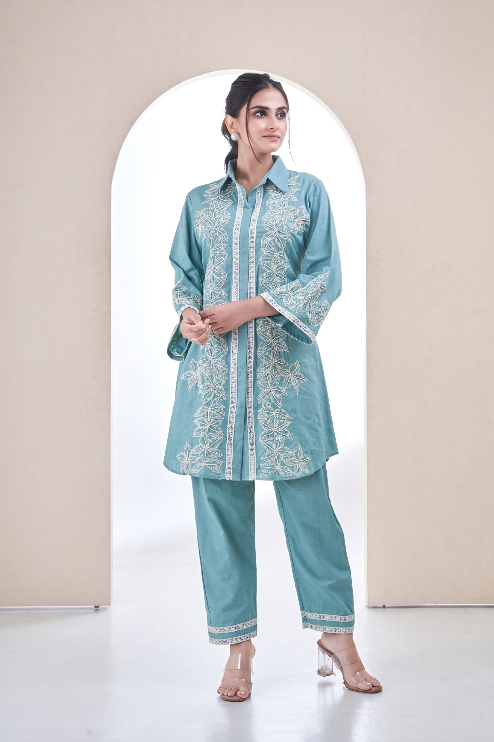 A teal blue Linen coord set with intricate thread embroidery running through the kurta and pant borders. Finished with scalloped sleeves and delicate detailing, it’s a graceful pick for both festive and elevated everyday moments.