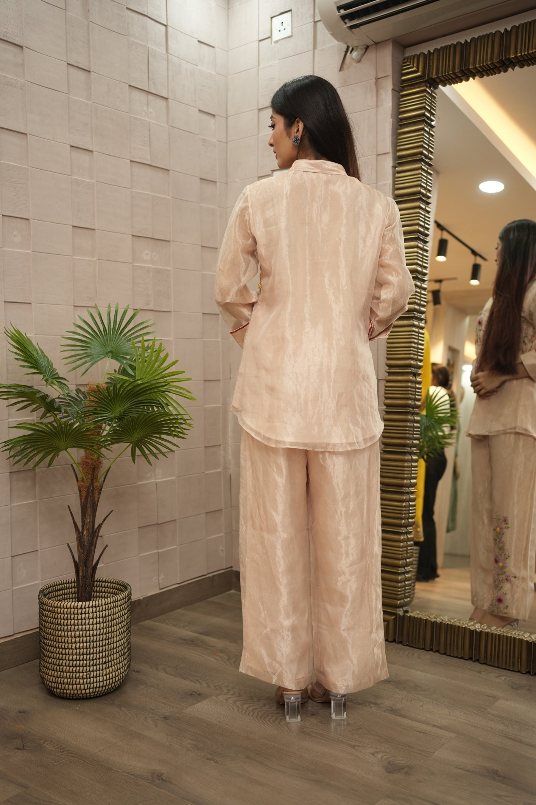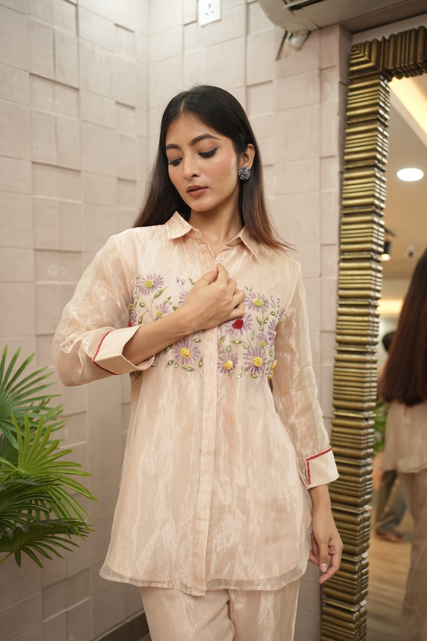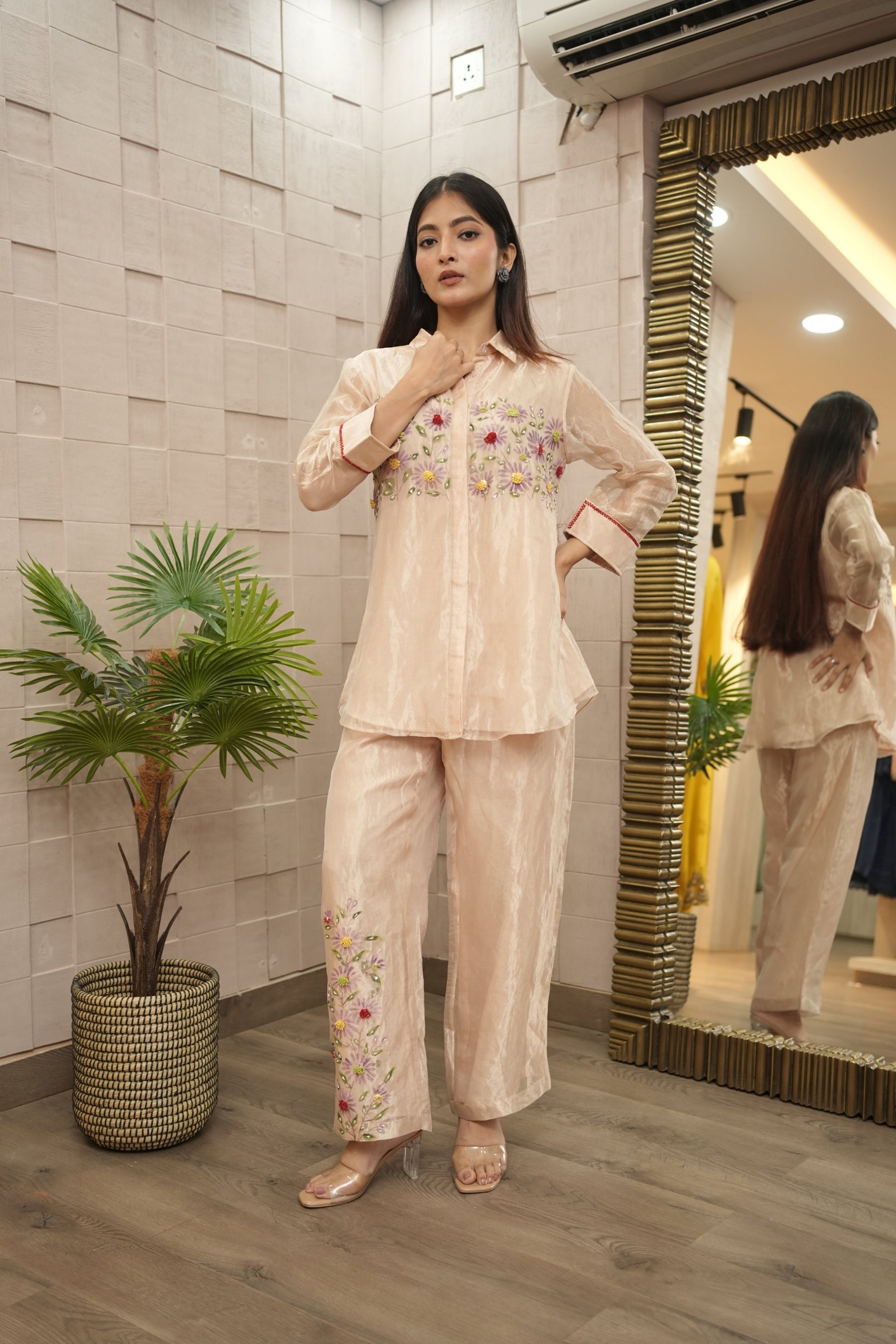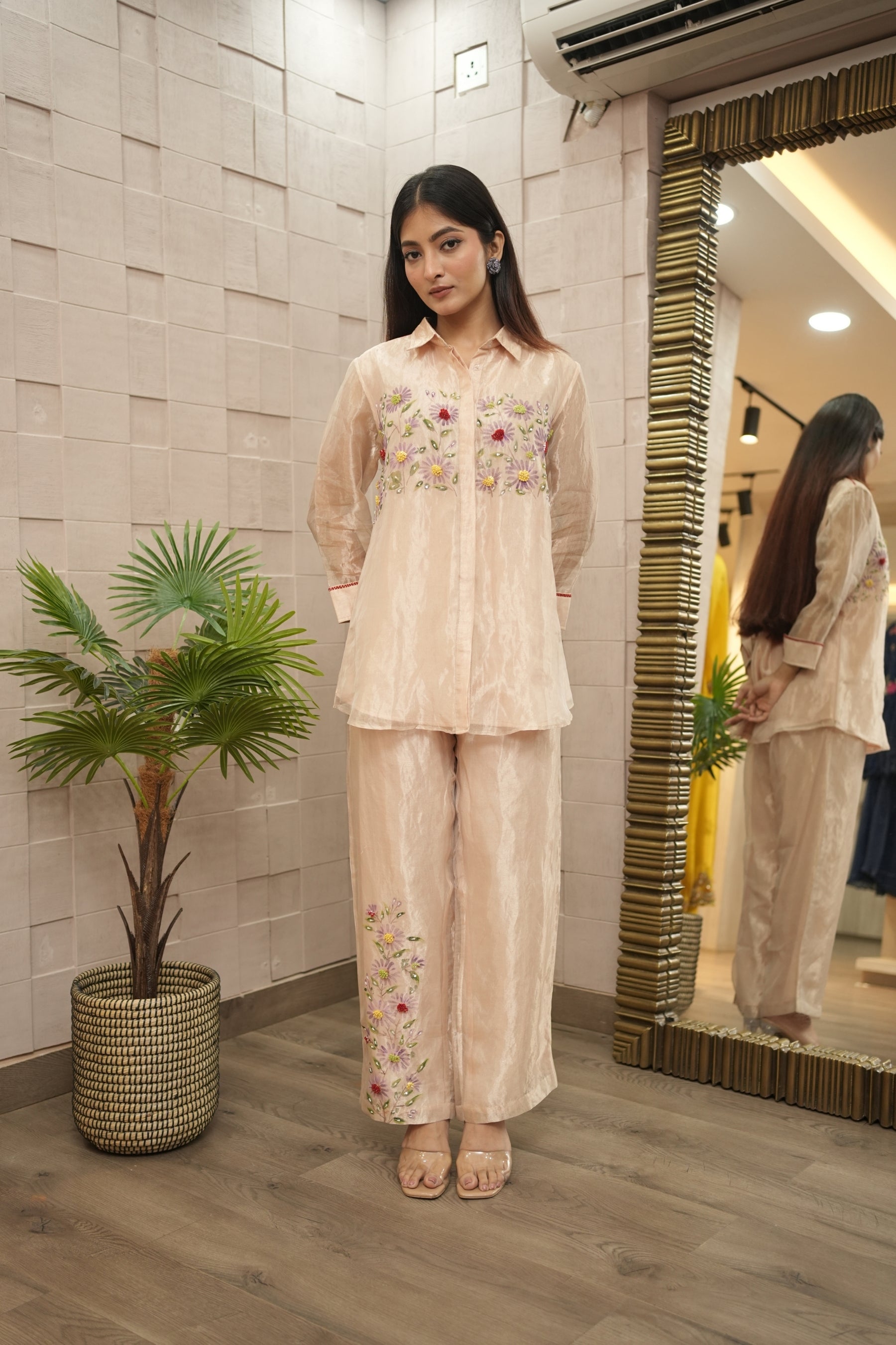 A hand-painted and delicately embroidered co-ord set crafted in sheer tissue fabric. Featuring soft florals this breezy silhouette captures the charm of a sunlit meadow. Style it for garden soirées, festive brunches, or anywhere you want to bloom in quiet elegance.